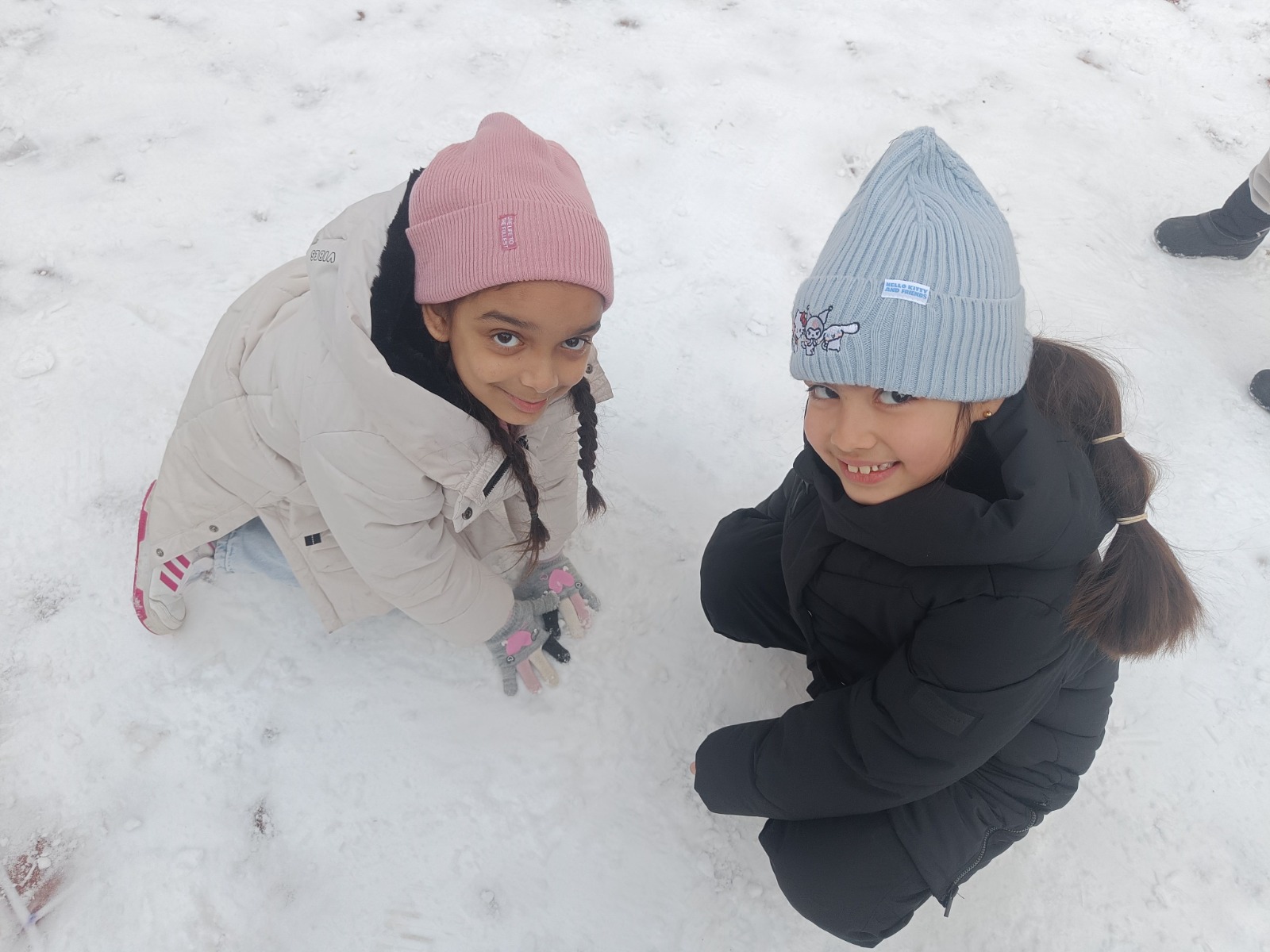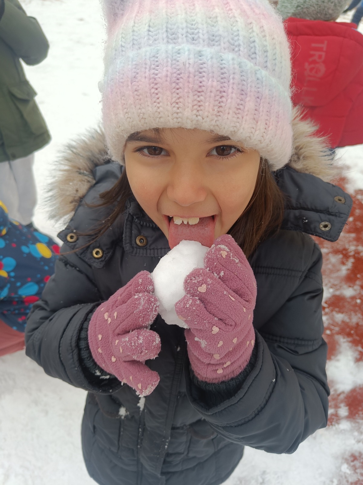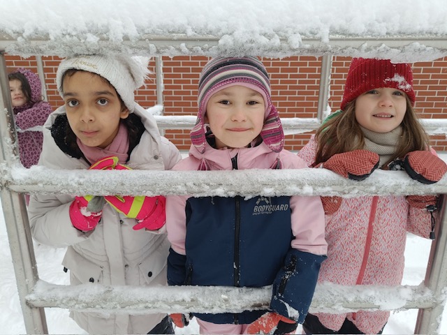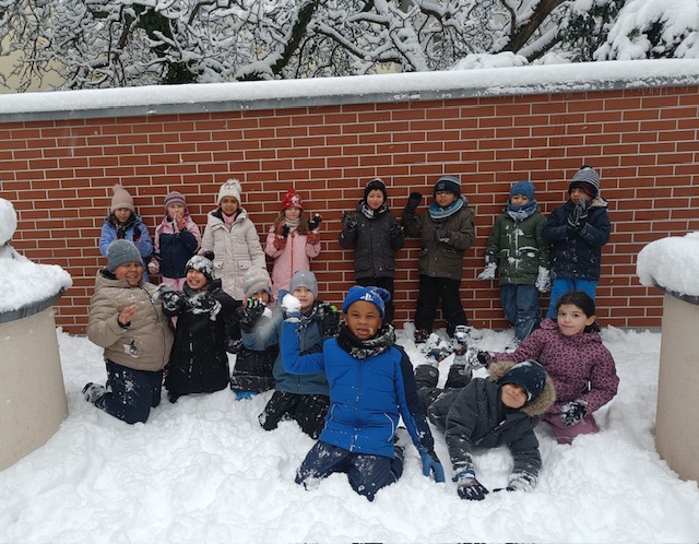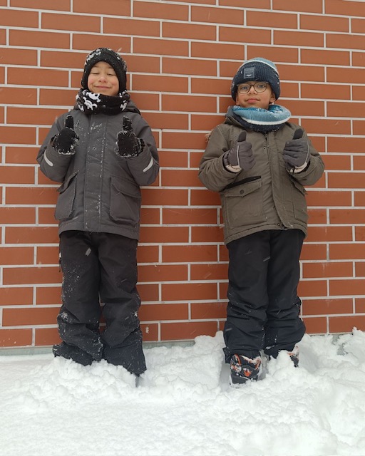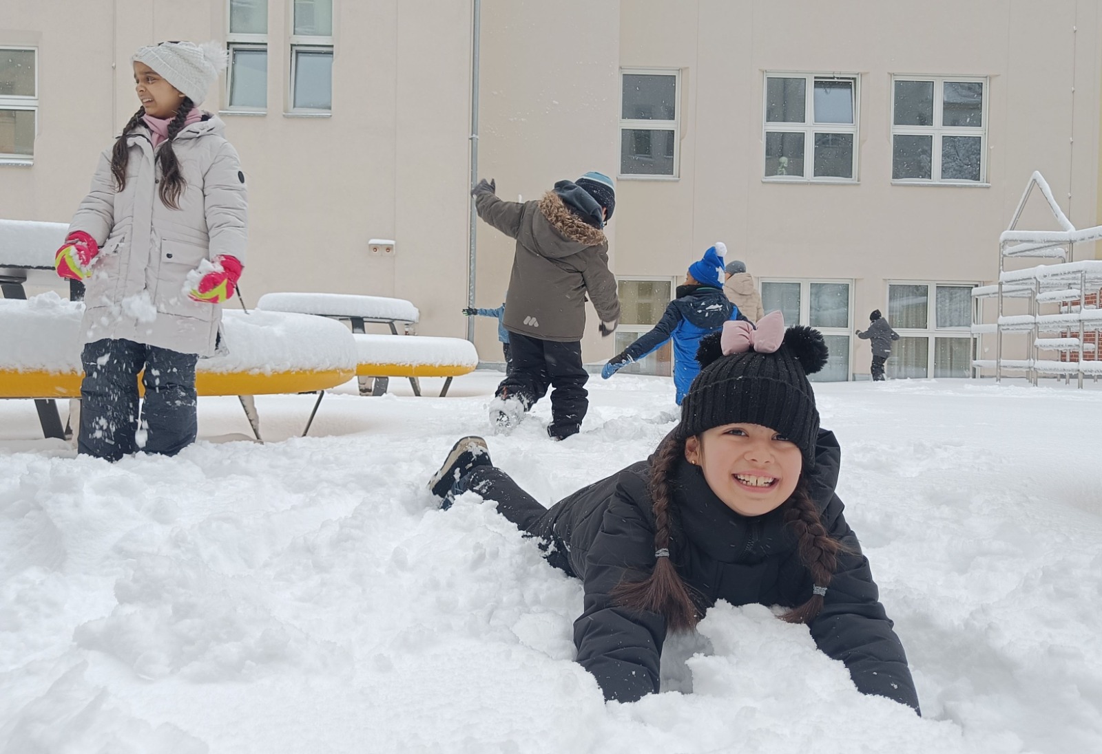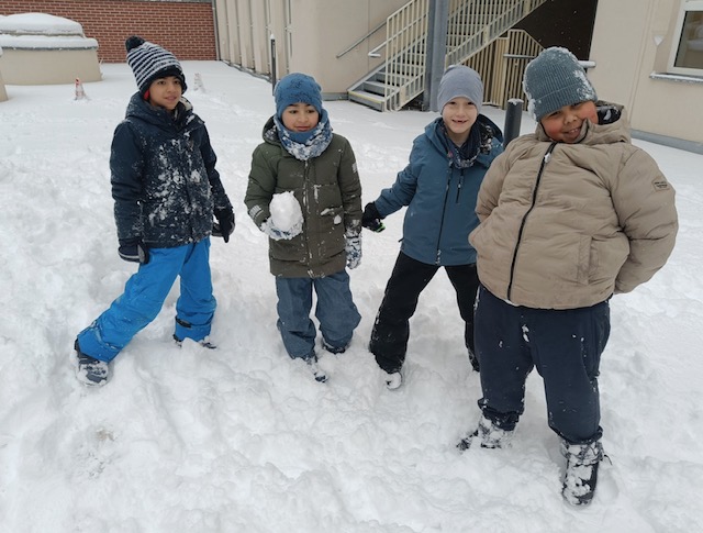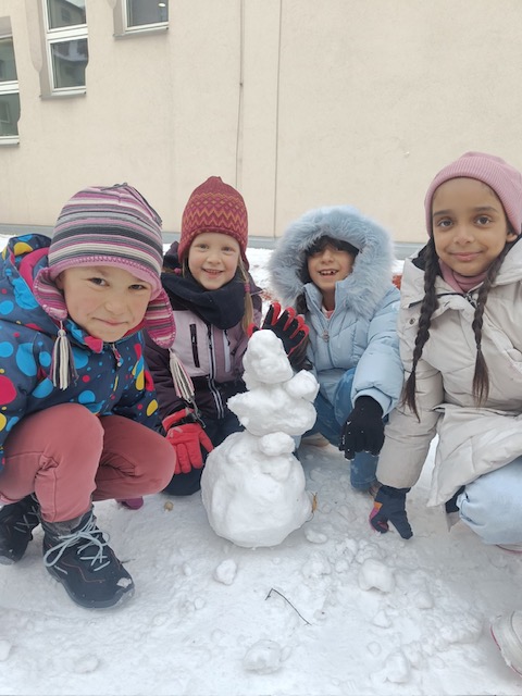 Es hat geschneit! Im Schulhof ist der Schnee zum Glück ein paar Stunden lang liegen geblieben. Auf zur Schneeballschlacht! Lasst uns einen Schneemann bauen! Alles war dabei!