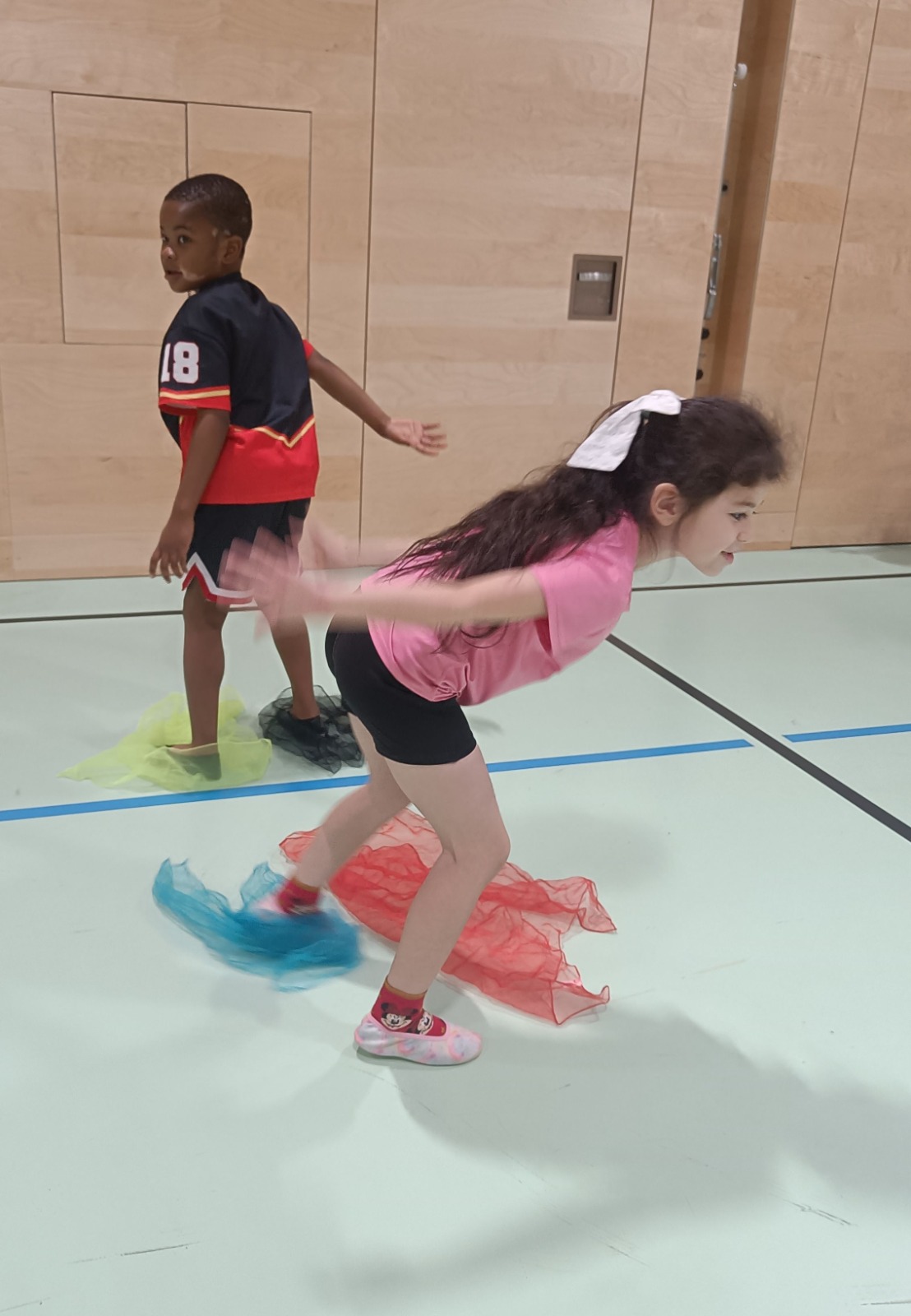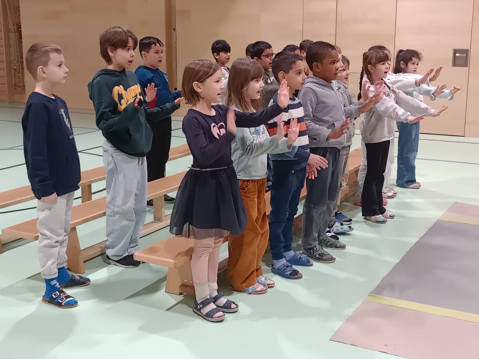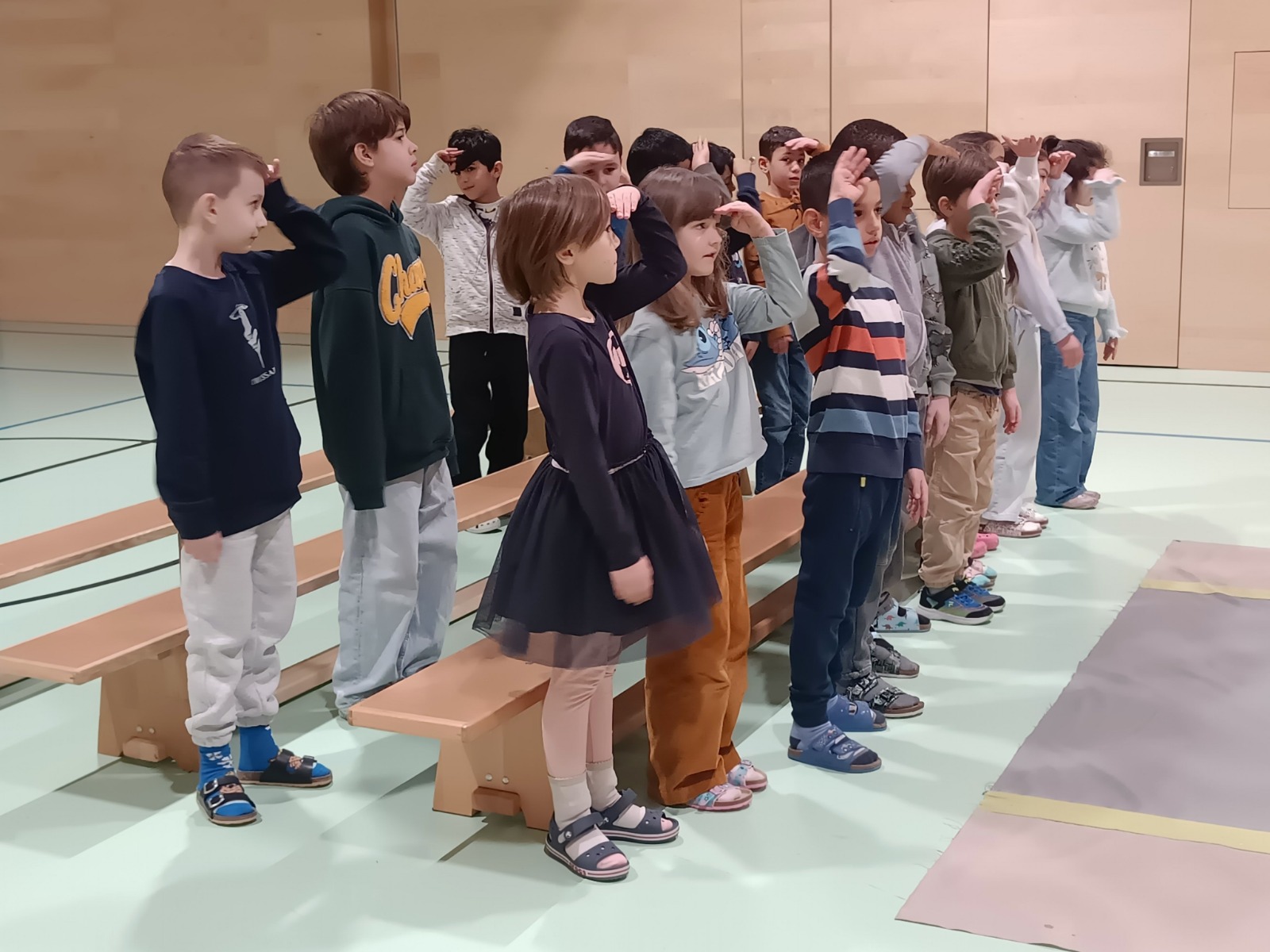 Bald gehen wir zum ersten Mal Eislaufen. Deshalb üben wir schon einmal im Turnsaal wie das mit dem Schieben, Ziehen und Gleiten geht. Manche Kinder üben sogar auch schon Tanzen. Wir können es kaum erwarten das alles bald am Eis auszuprobieren.