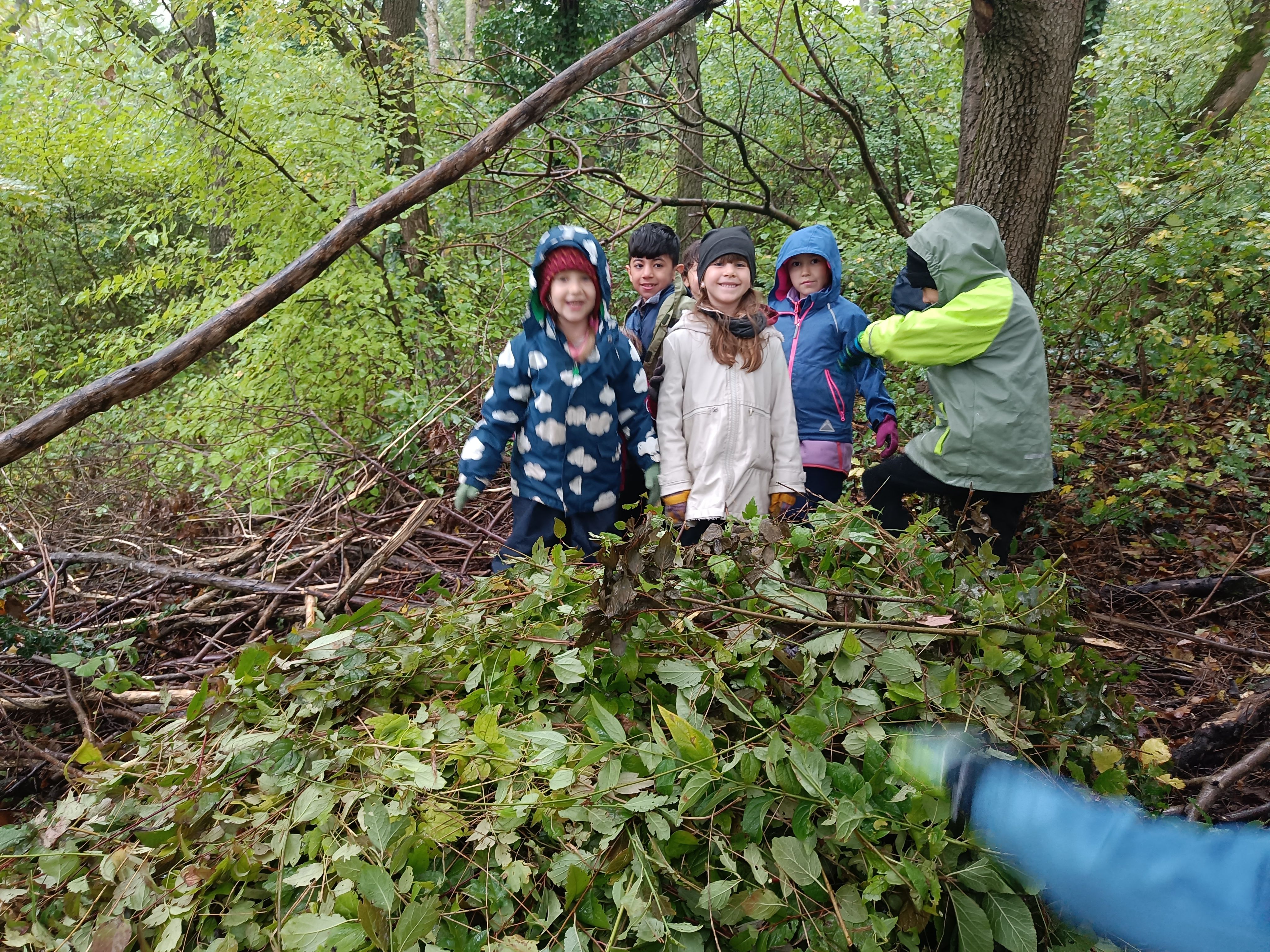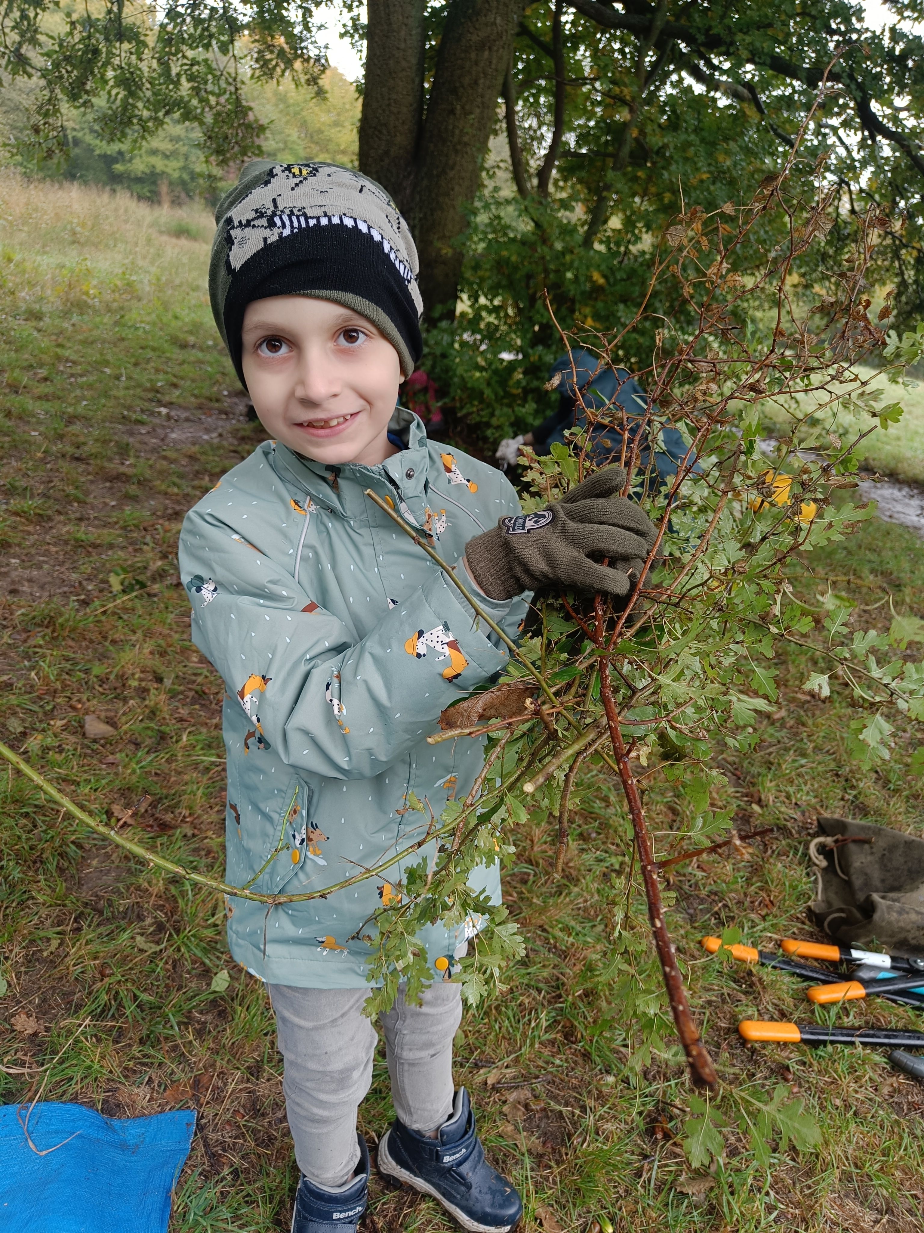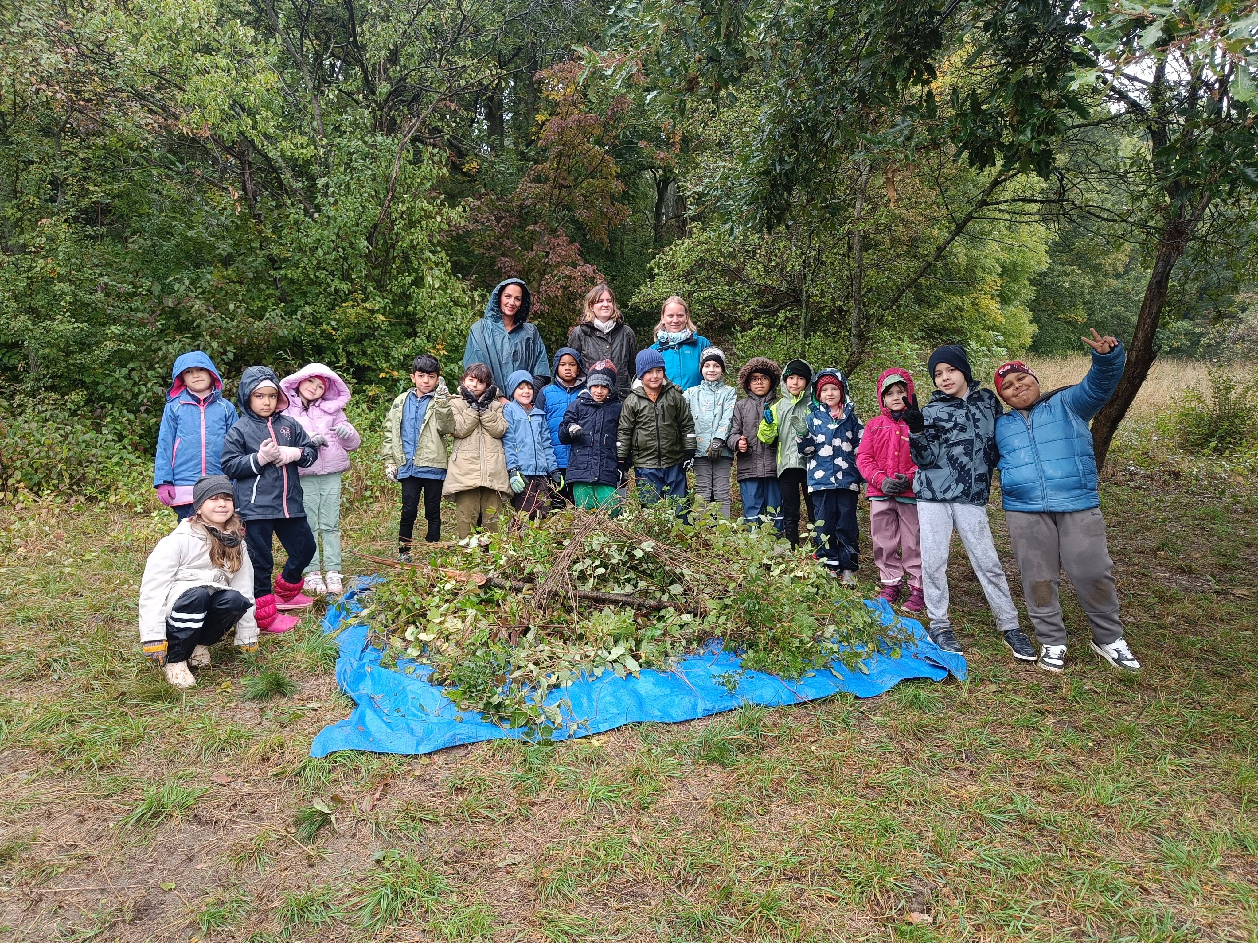 Ausgerüstet mit Arbeitshandschuhen und Gartenscheren sind wir heute mit dem Bus auf den Schafberg gefahren. Dort haben wir der Wiese geholfen eine Wiese zu bleiben. Das Wetter ist nass gewesen, aber wir haben uns nicht aufhalten lassen. Wir haben sämtliche holzige Pflanzen rund um die dort wachsenden Sträucher und Bäume vorsichtig abgeschnitten. Das Holz haben wir auf einer Plane ganz stolz in den Wald transportiert und dort ein Winterquartier für Igel, Mäuse, Blindschleichen und Käfer gebaut. So viel Arbeit an der frischen Luft ist sehr anstrengend gewesen!