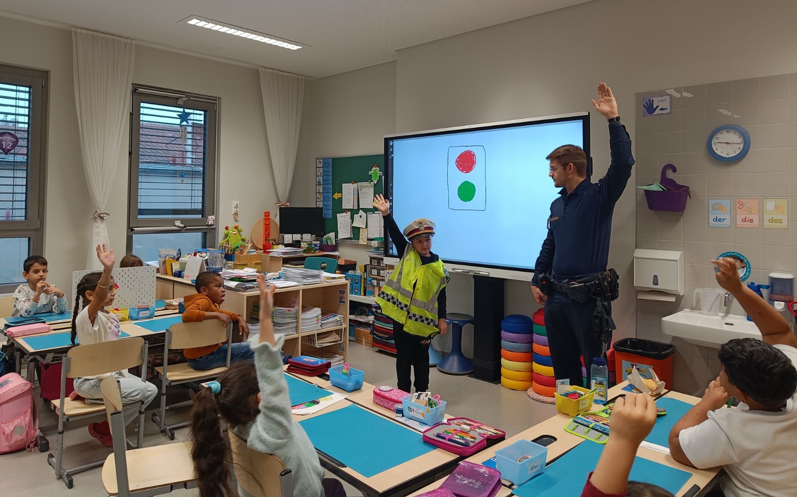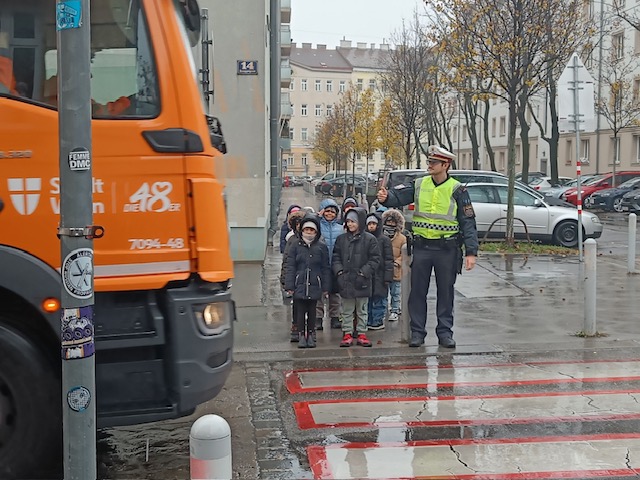 In unserer Klasse haben wir Besuch gehabt! Ein Verkehrspolizist hat uns die verschiedenen Ampeln erklärt. (Das haben wir aber eh schon alles gewusst…) Außerdem gibt es ja auch noch Handzeichen, wenn die Ampel einmal nicht funktioniert. Natürlich haben wir das alles in der näheren Schulumgebung auch noch ausprobiert. Wie und wo überquere ich sicher die Straße? Wann muss ich stehen bleiben? Wer darf zuerst gehen/fahren? Ein bisschen etwas haben wir dabei sicher gelernt 😊.