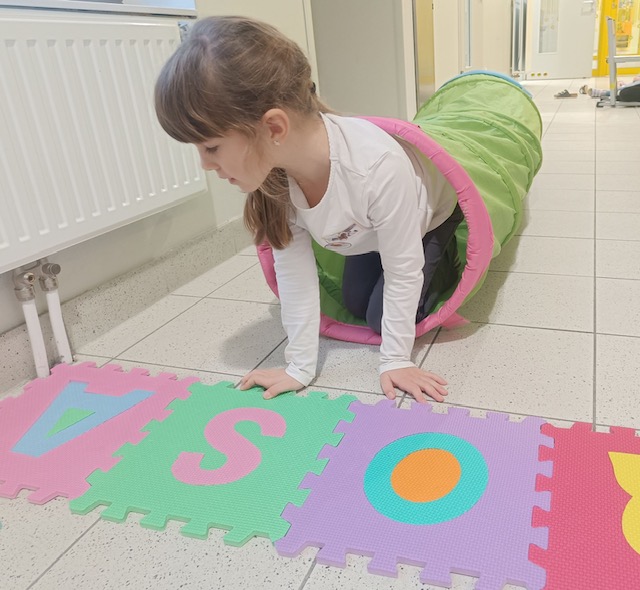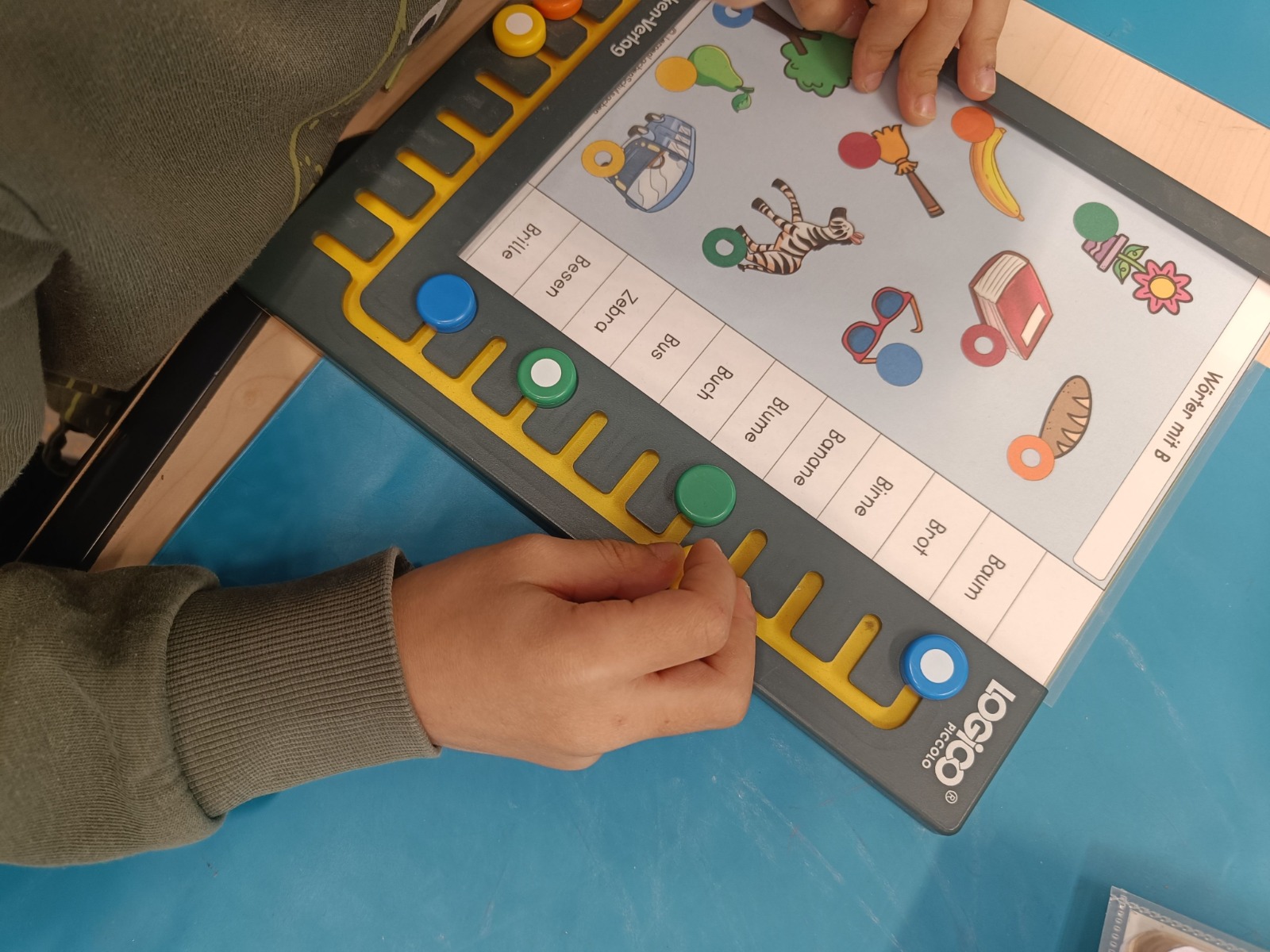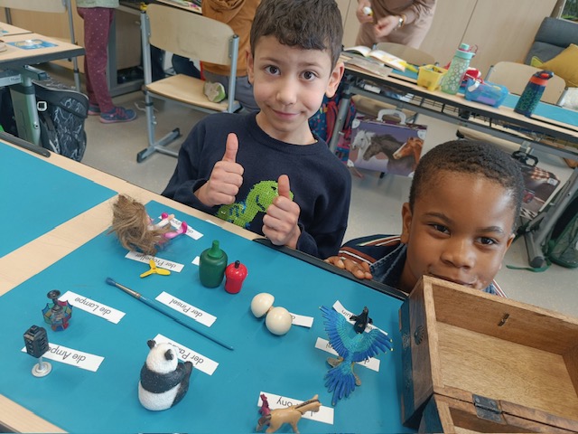 Wir arbeiten zwei Stunden lang nach einem Plan mit vielen verschiedenen Stationen. Jedes Kind organisiert sich selbst, sucht sich einen Arbeitsplatz und ev. auch eine/n ArbeitpartnerIn. Wir sammeln Wörter für unsere Wortschatzkiste, hören als Lautdetektive wo sich die Laute verstecken, fühlen und erkennen die Buchstaben, erforschen die Buchstabenform mit Händen und Füßen usw. Das hat natürlich nicht alles von Anfang an geklappt, aber wir sind nach ein paar Versuchen jetzt ganz schön gut darin.
