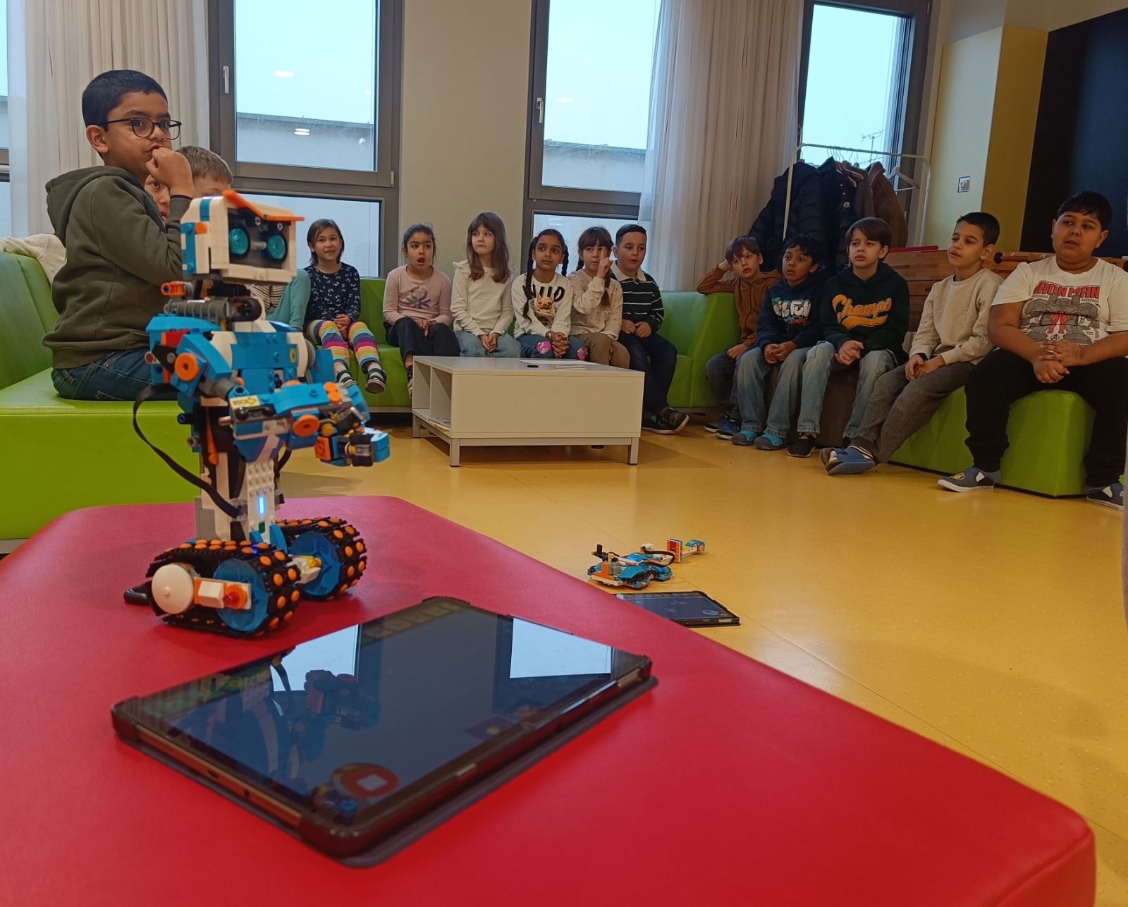 An der ganzen Schule war Robbo Day! Wir haben verschiedene Roboter ausprobiert und auch schon ein bisschen programmiert. Diese Maschinen machen tatsächlich nur was man ihnen sagt bzw. machen das nicht was man ihnen nicht sagt 😊. Es war lustig alles zu testen. Wir hätten gerne mehr Zeit zum Forschen gehabt.