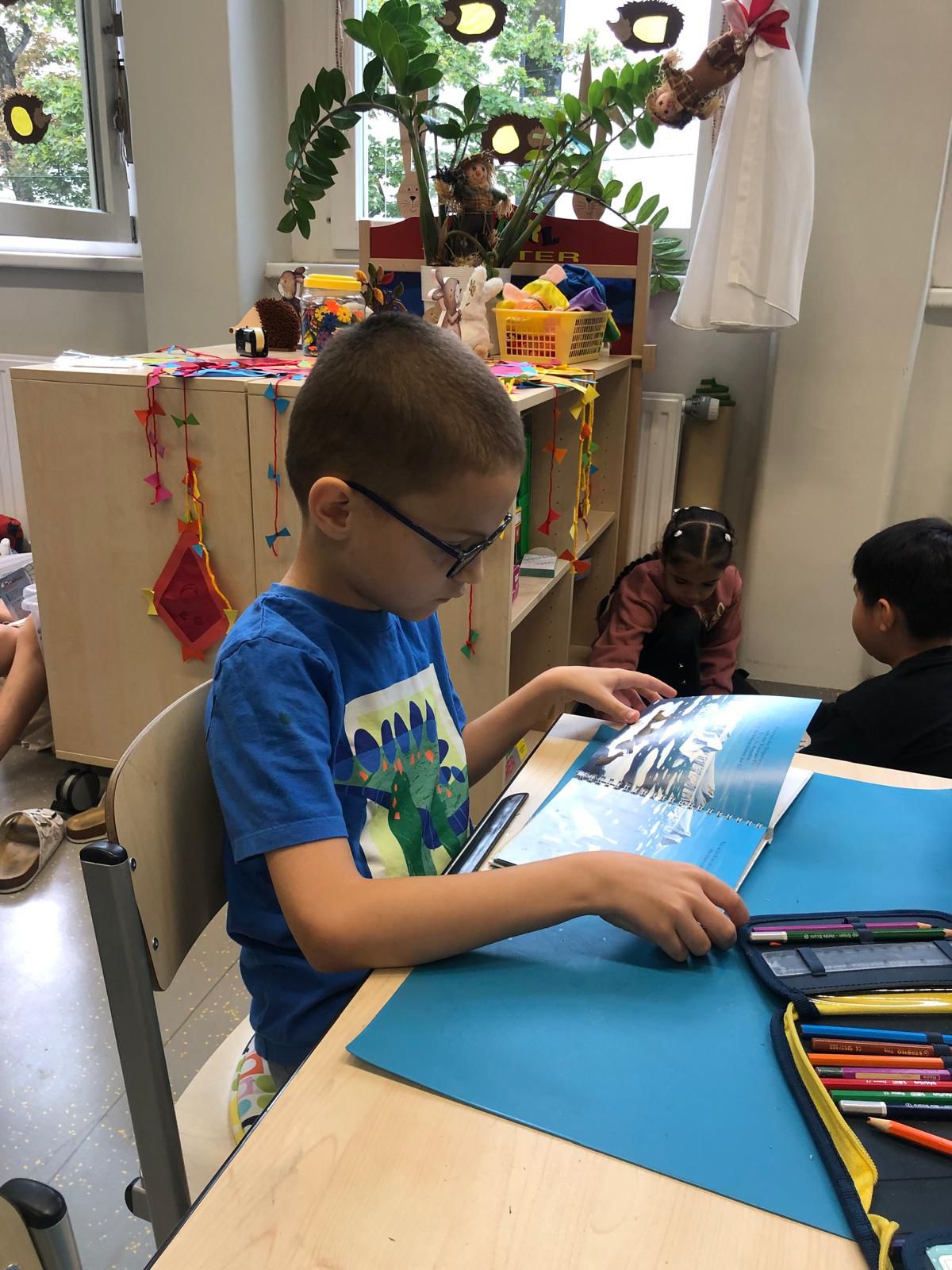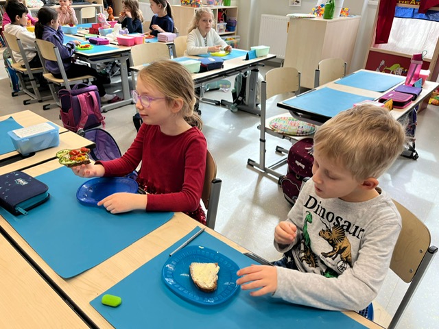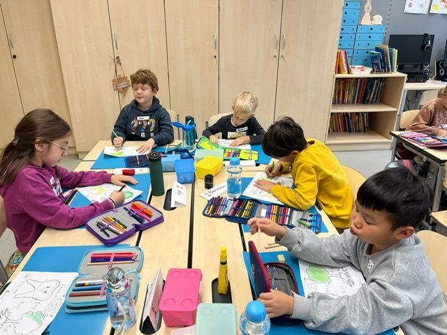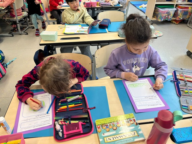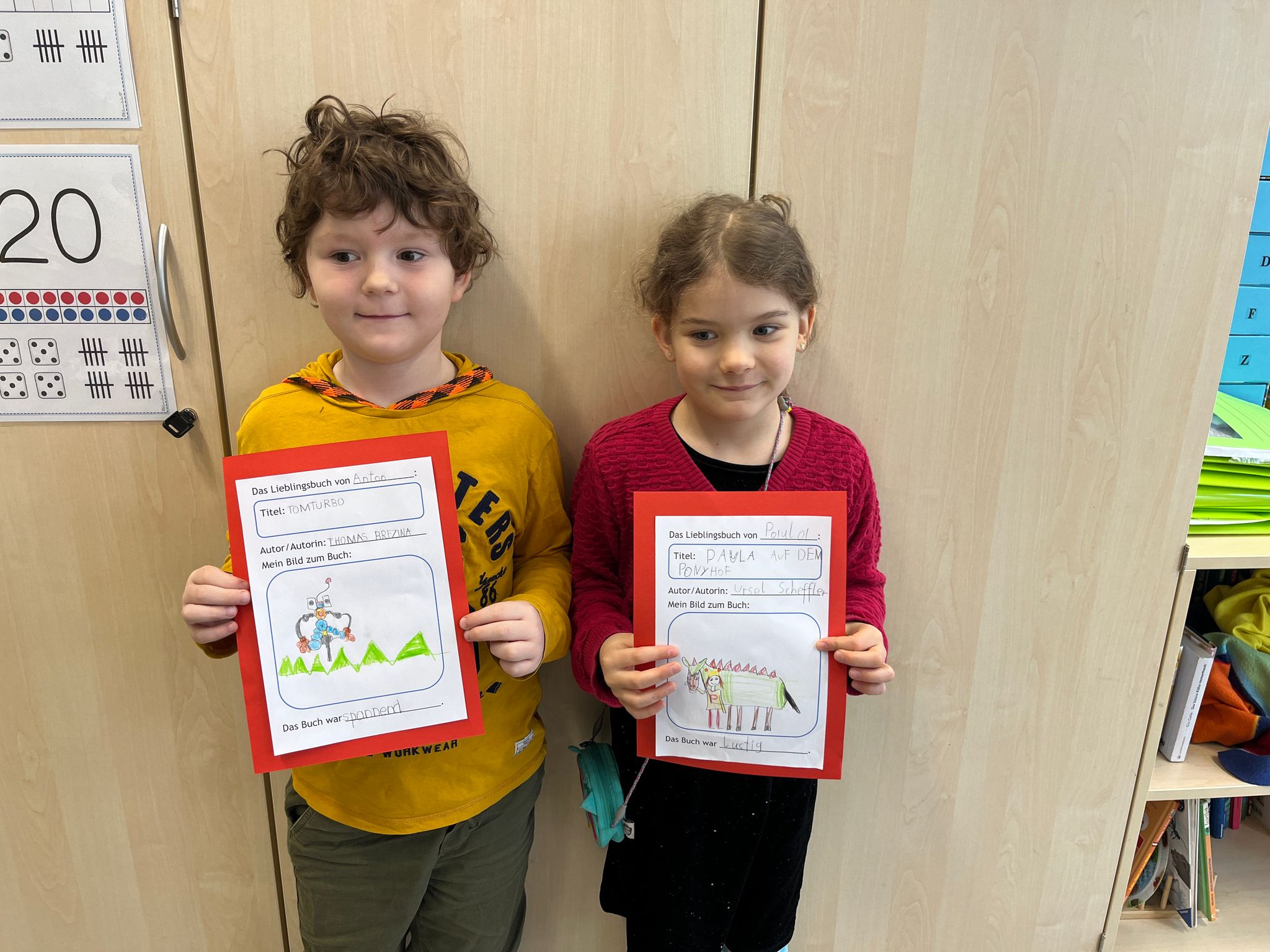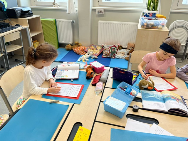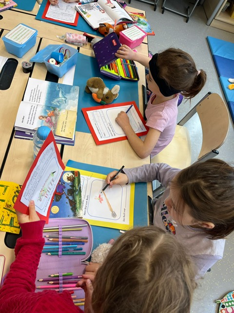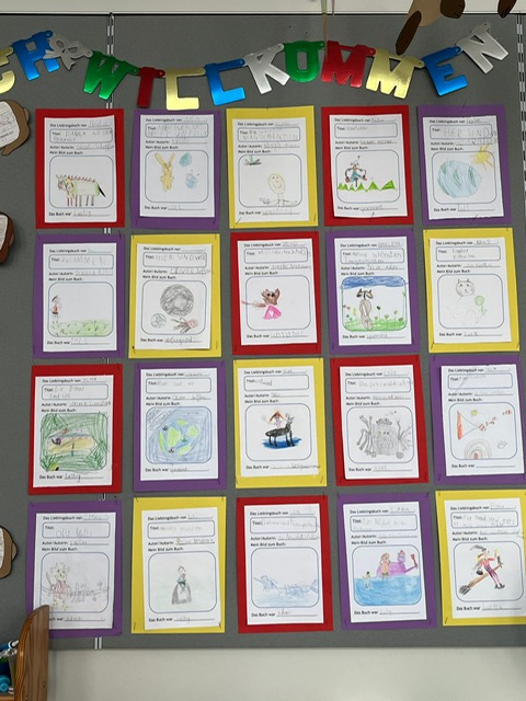 Am Vorlesetag waren wir sehr kreativ. Jeder hat sein eigenes Lieblingsbuch mitgebracht und der Klasse im Morgenkreis kurz vorgestellt. Eine kleine Szene aus dem Buch wurde anschließend gemalt und dann haben sich die Kinder gegenseitig aus den Büchern vorgelesen.