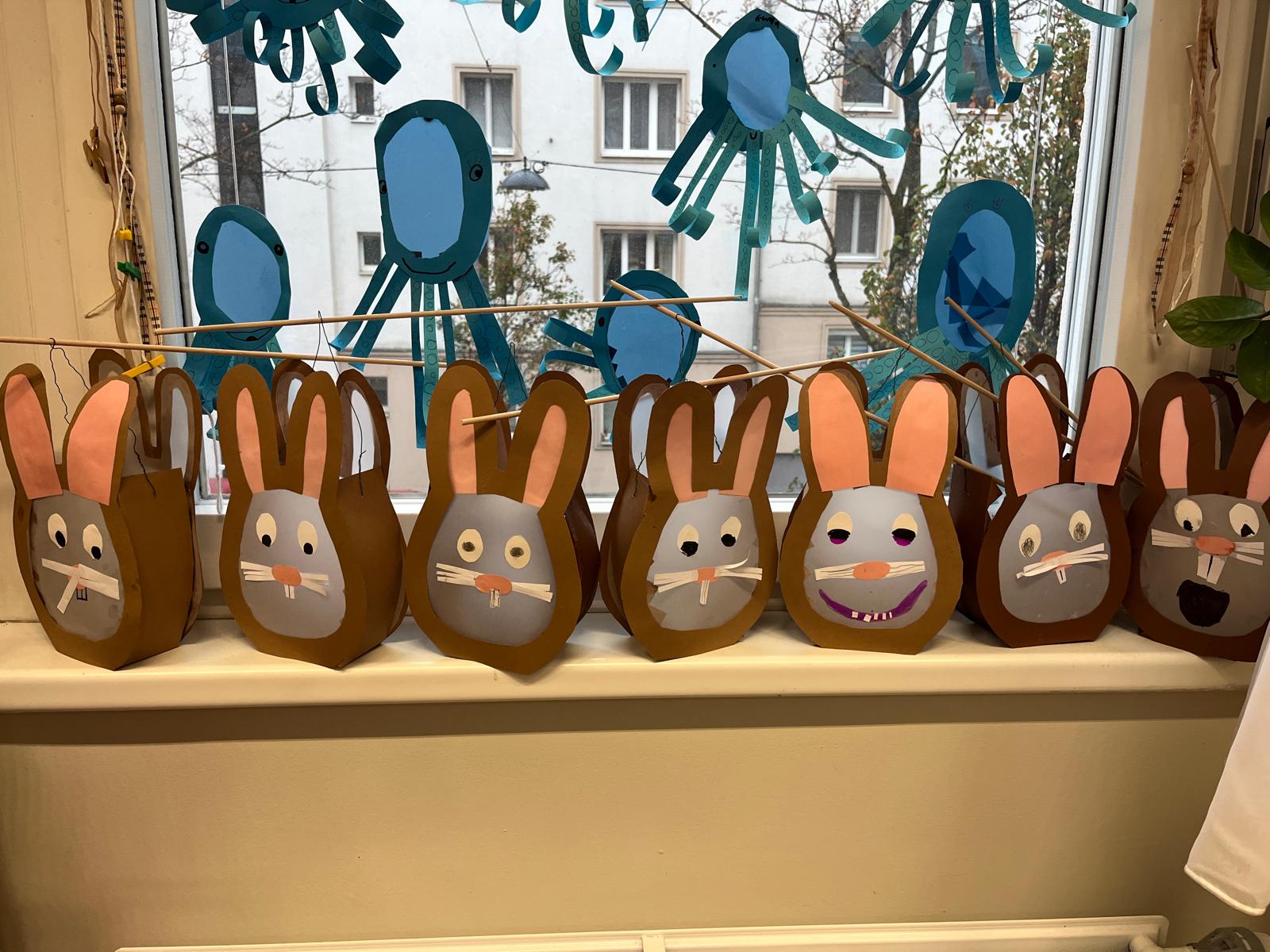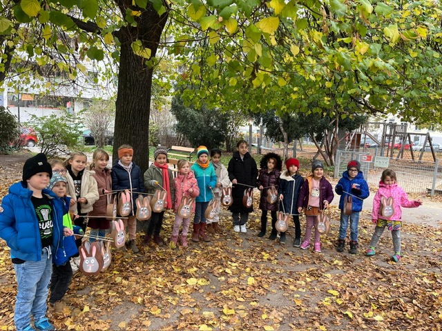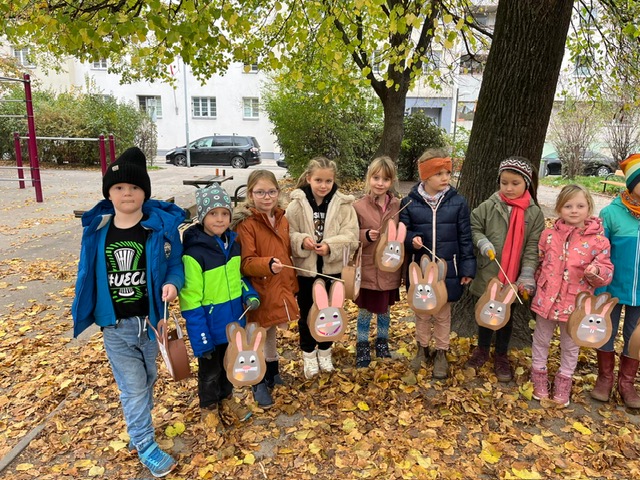 Wir haben gemeinsam Laternen gebastelt und sind singend eine Runde mit unseren Hasenlaternen spazieren gegangen.