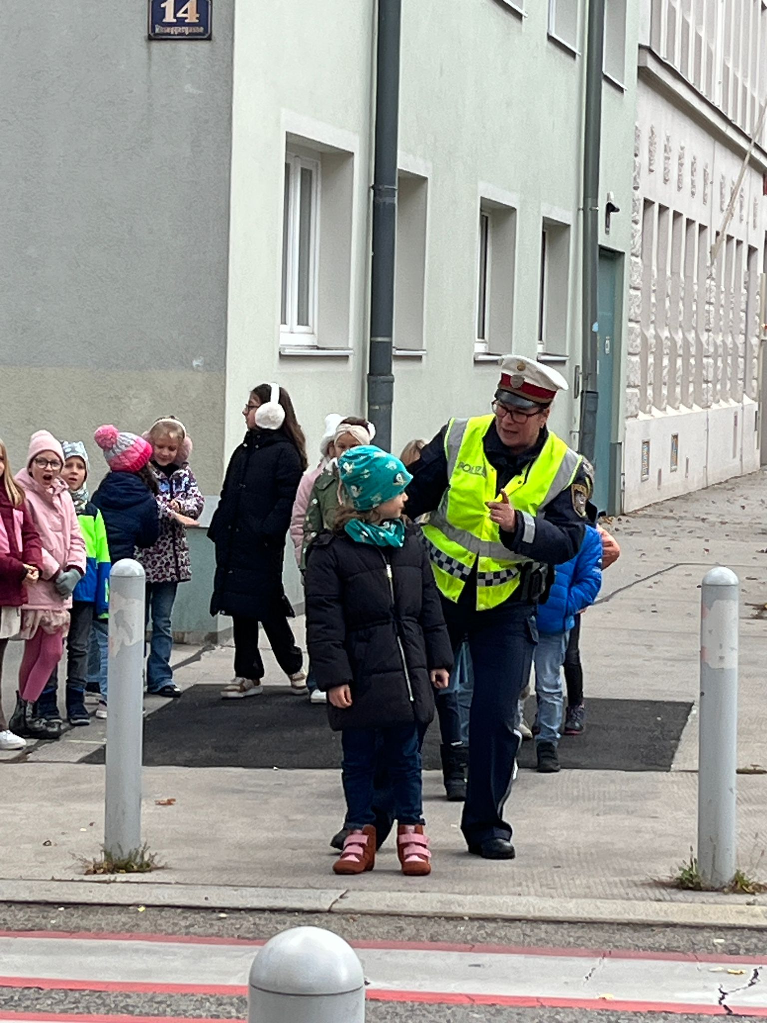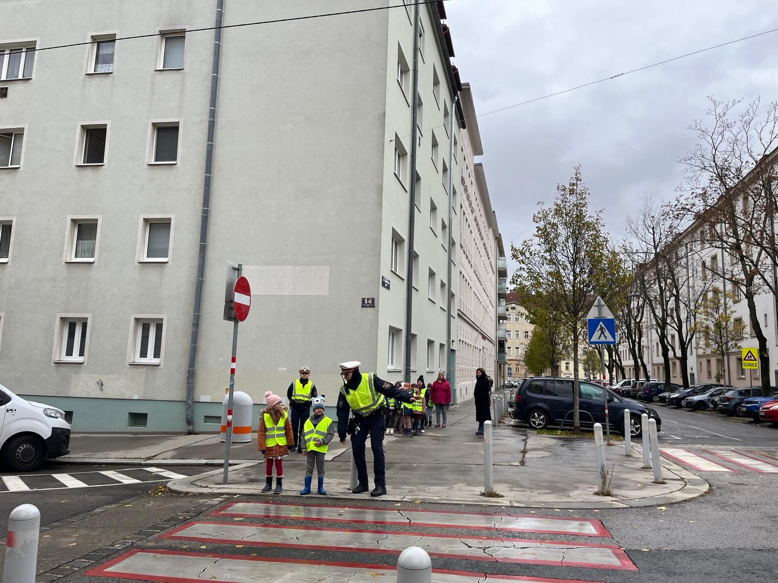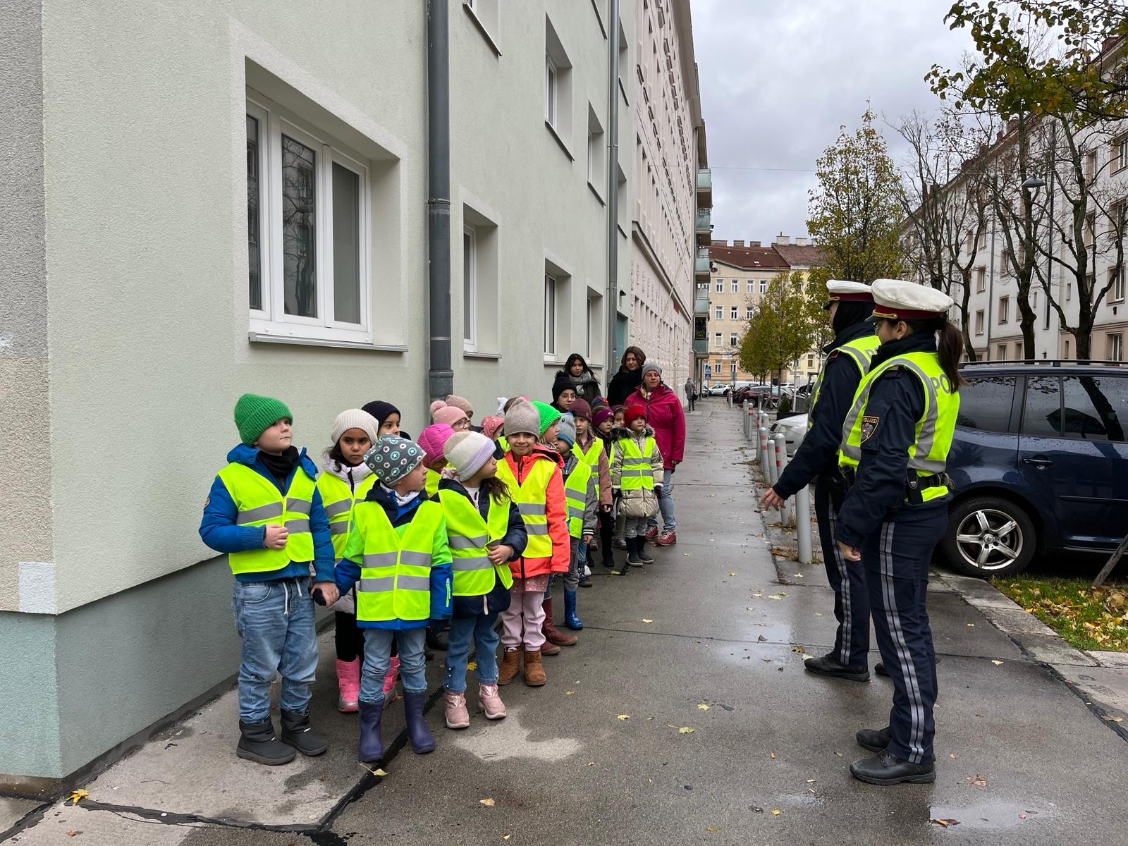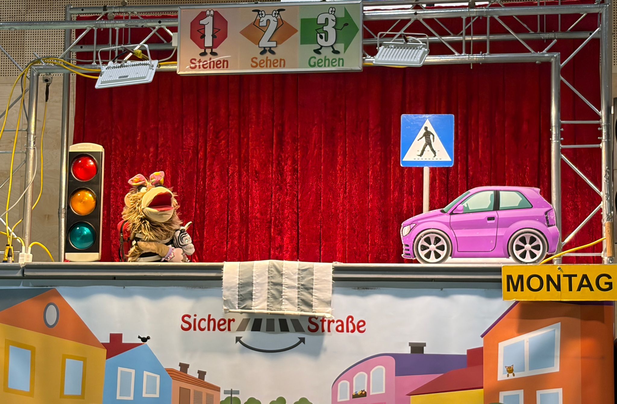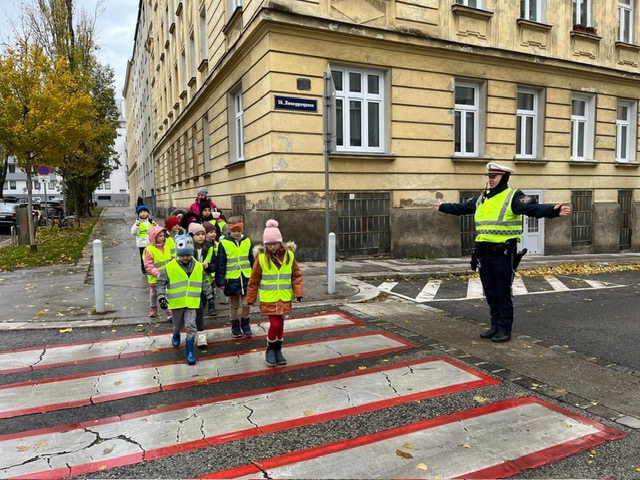 Das Theaterstück vermittelt den Kindern in spielerischer Form das sichere Überqueren der Straße. Mit Hilfe des Bewegungsliedes lernen sie die Zauberformel „Stehen, Sehen, Gehen“ kennen und üben es dann mit den PolizistInnen in Wirklichkeit auf der Straße.