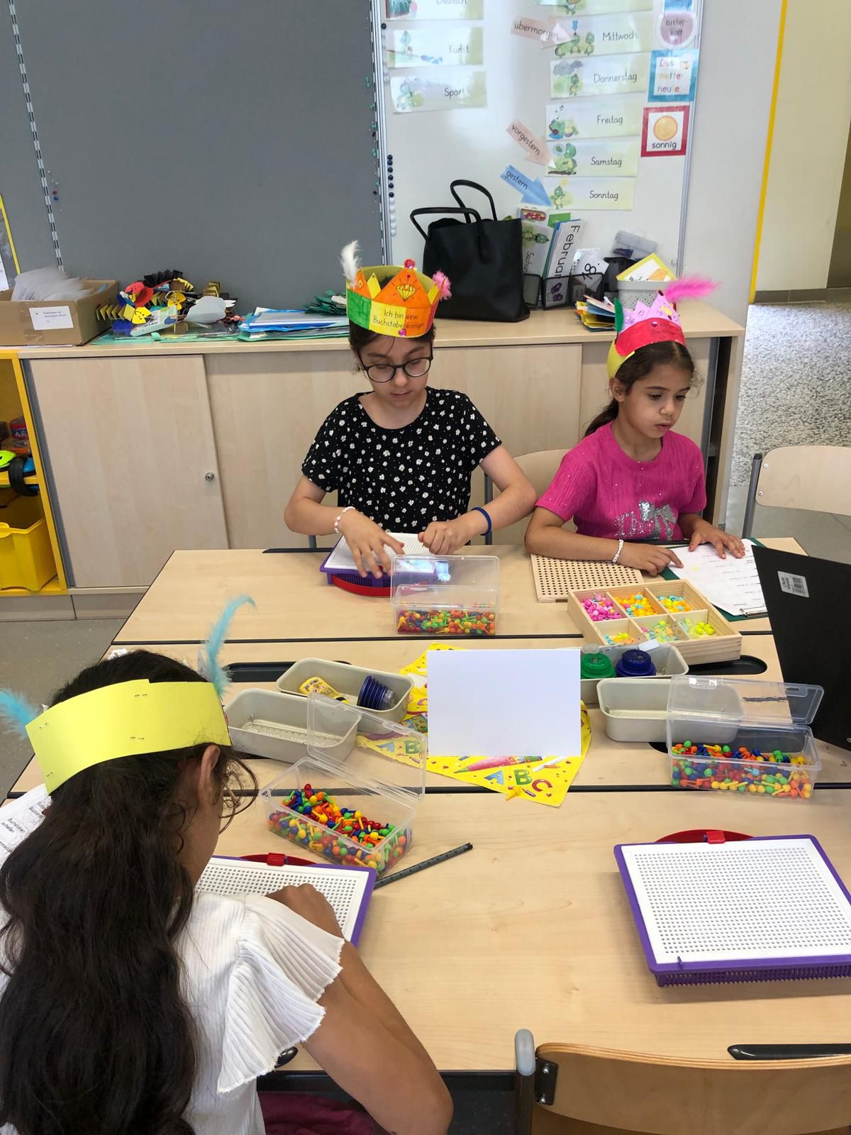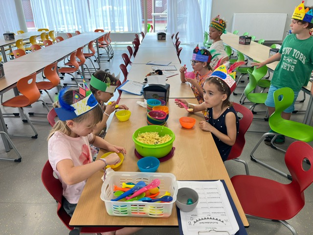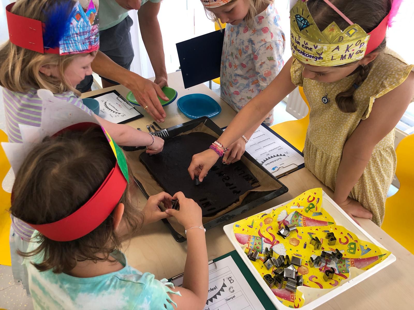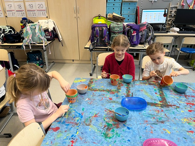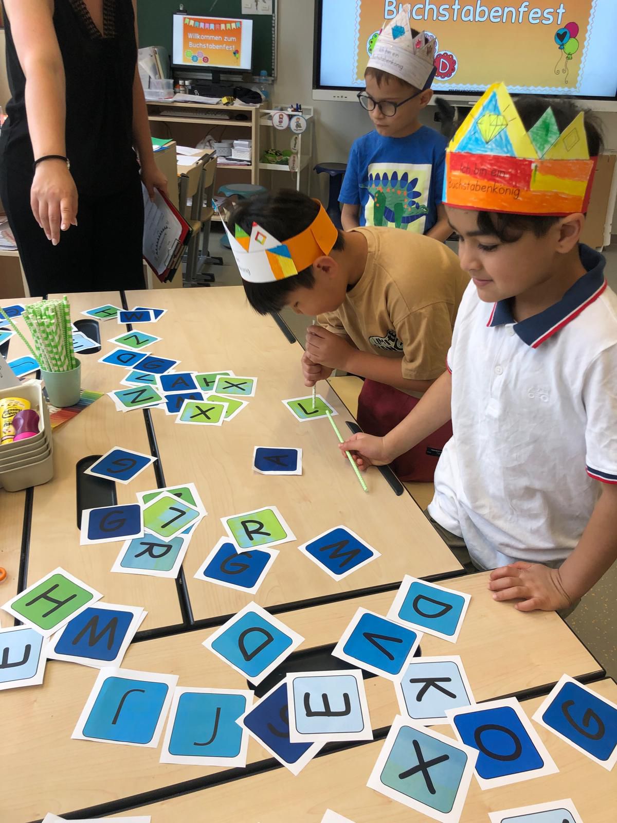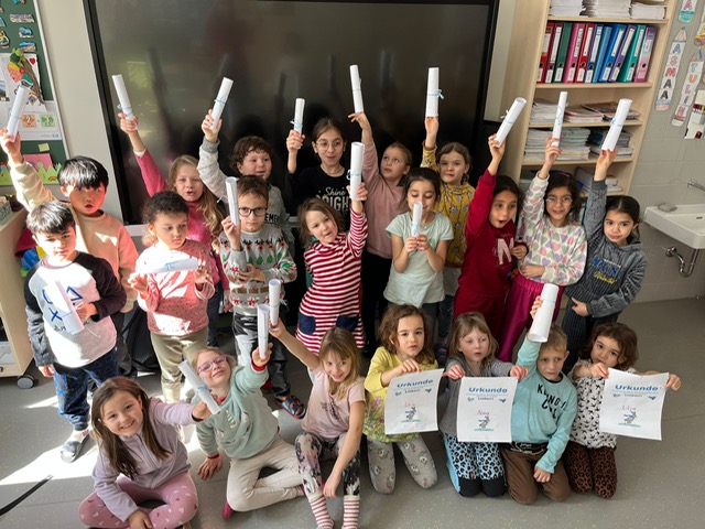 Das erste Schuljahr ist nun fast vorbei und das haben wir natürlich gebührend gefeiert. Es wurden T – Shirts bedruckt, Buchstabenkronen, Ketten und Medaillen gebastelt, eine Buchstabensuppe gegessen, Wörter erraten und vieles mehr.