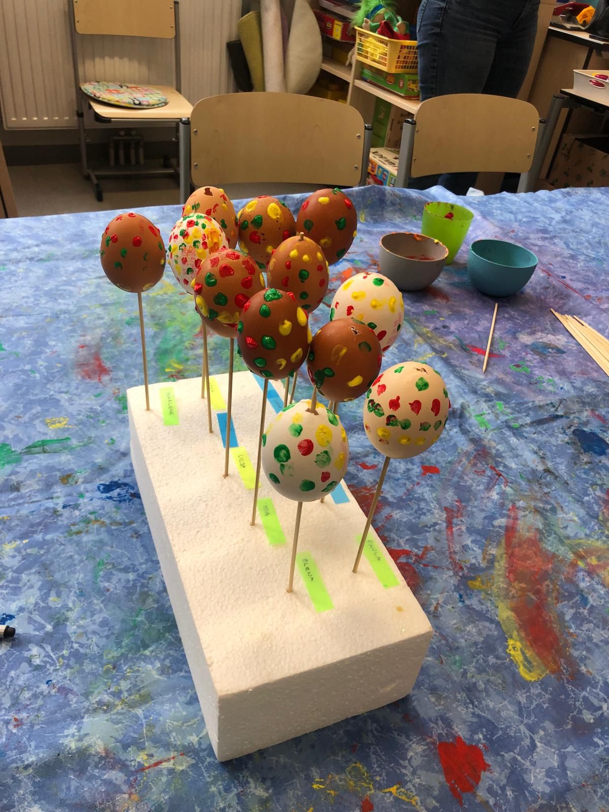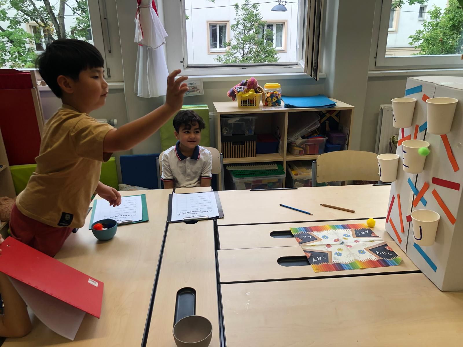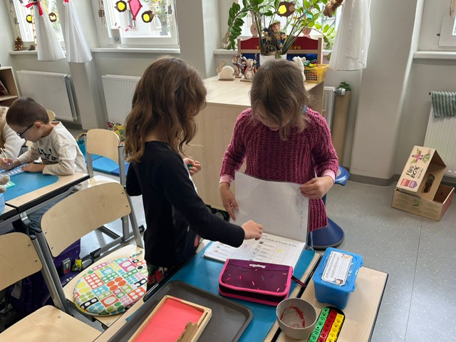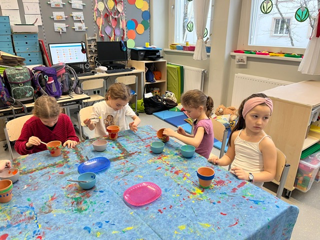 Unsere StudentInnen haben uns zum Thema: „Wir experimentieren mit Farben“ 4 Stationen vorbereitet. Die Klasse wurde in kleine Gruppen aufgeteilt, an jedem Tisch wurde ein Experiment durchgeführt. So hatten alle die Möglichkeit die Experimente selber auszuprobieren.