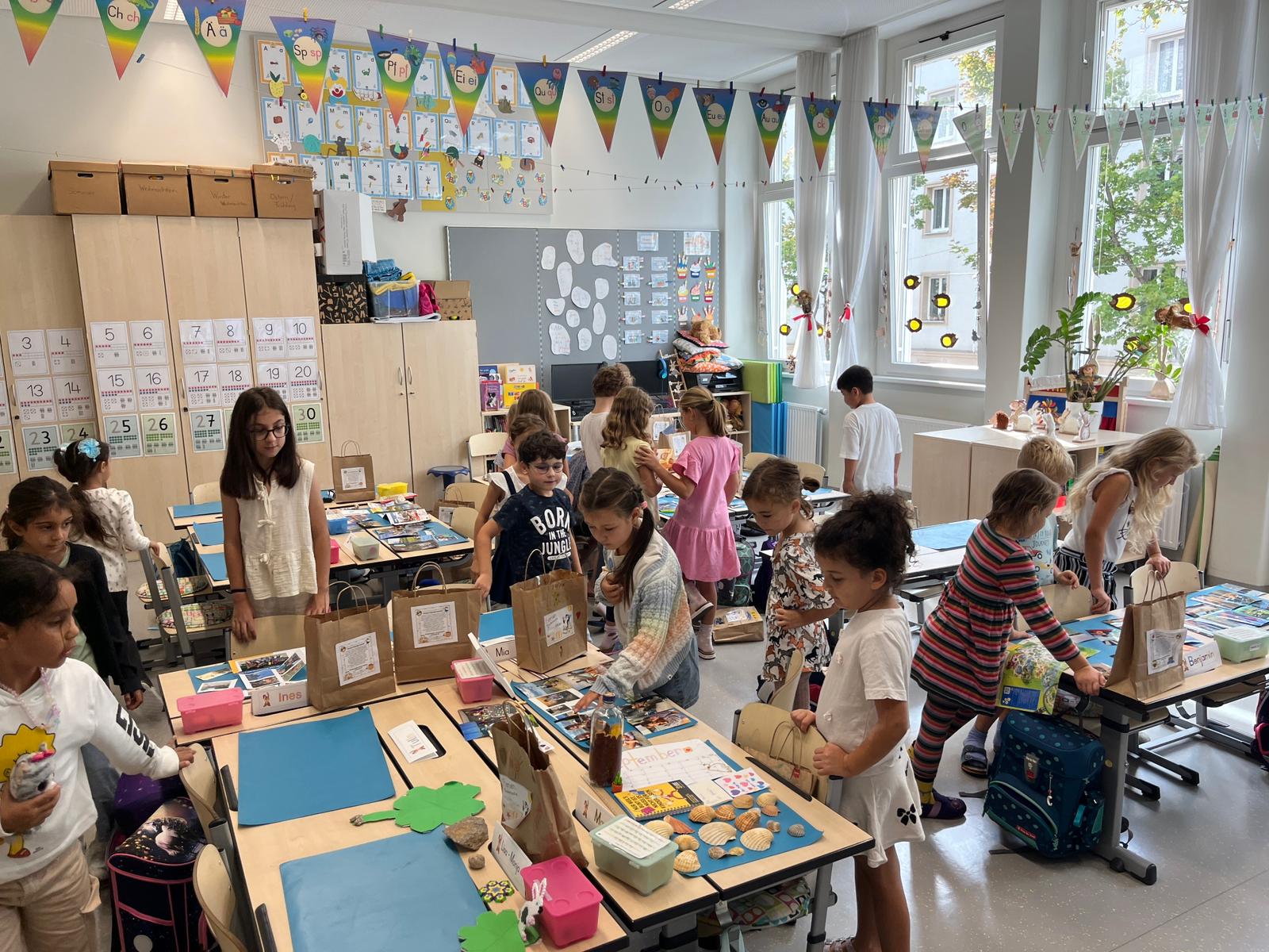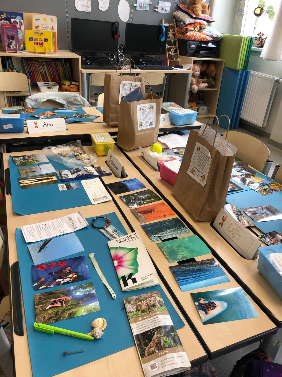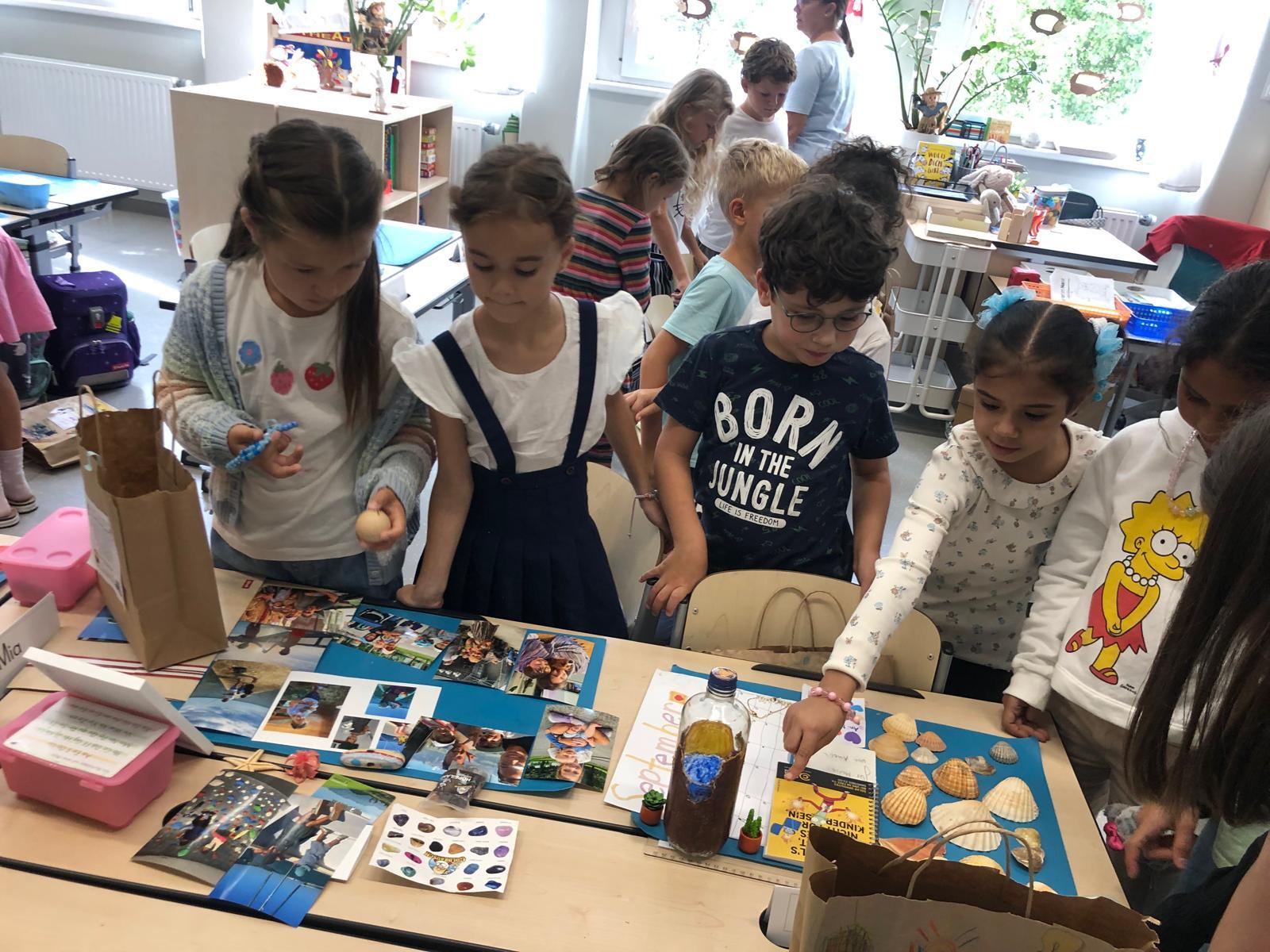 In der Ferienplaudertasche haben die Kinder die schönsten Erinnerungsstücke aus den Sommerferien gesammelt. Mithilfe der vielen gesammelten Gegenstände wie z.B. Postkarten, Eintrittskarten, Muscheln, Fotos oder Fundstücken konnten die Kinder uns jeden Tag im Morgenkreis von ihren Ferien berichten. Am Freitag gab es zum Abschluss noch eine kleine Ausstellung, in der alle mitgebrachten Materialien bewundert werden konnten.