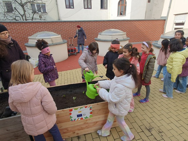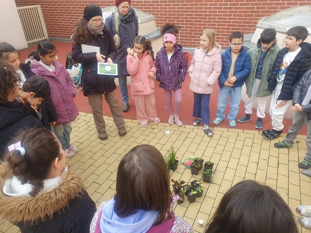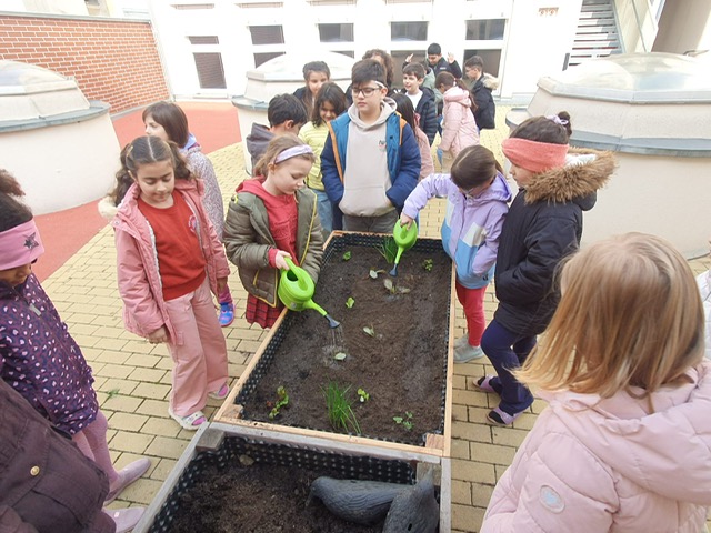 Am 4.3.2026 bepflanzen die Kinder auch das neue Hochbeet im Schulhof mit verschiedenen Samen und Obst- und Gemüsepflanzen.