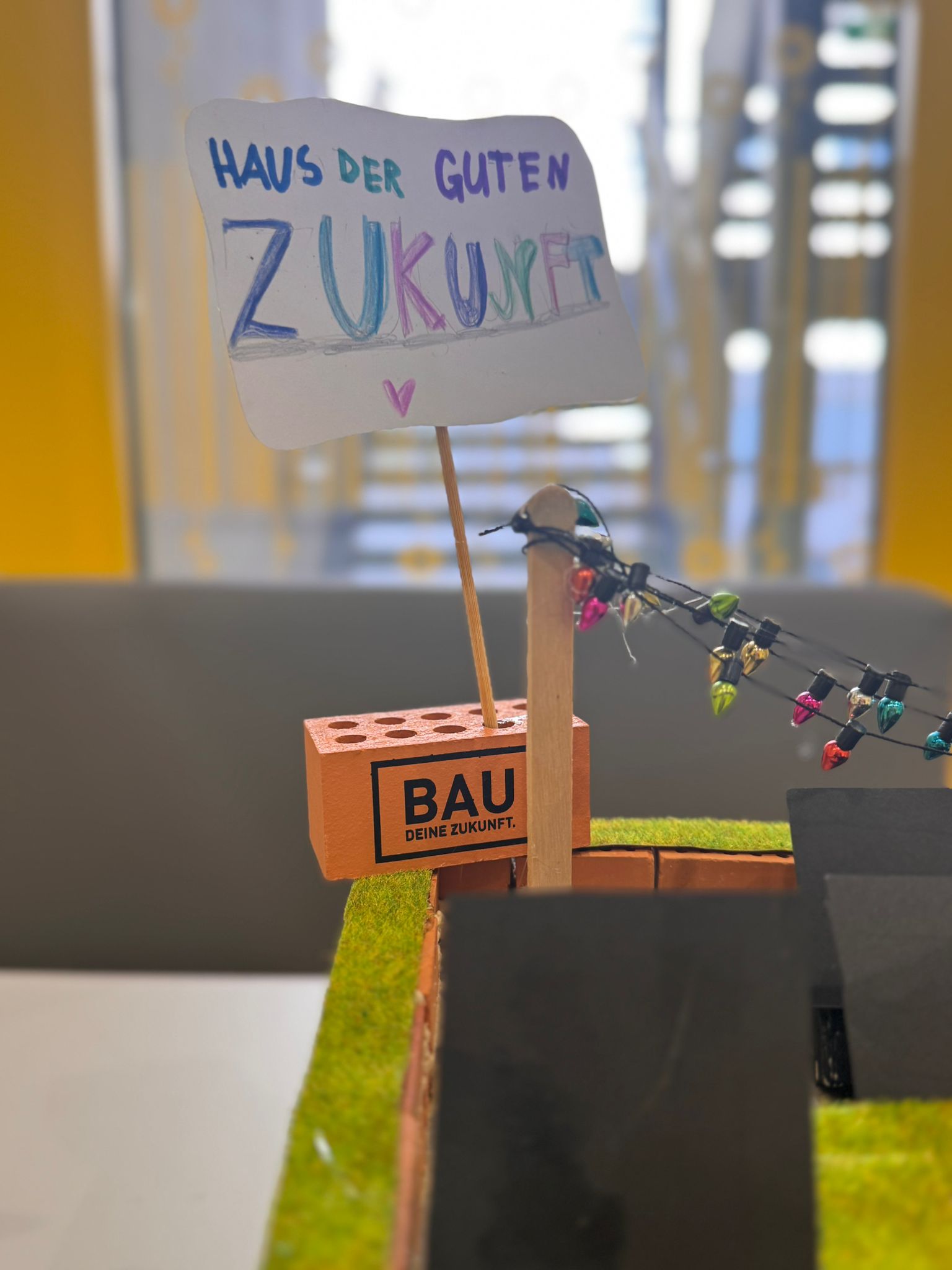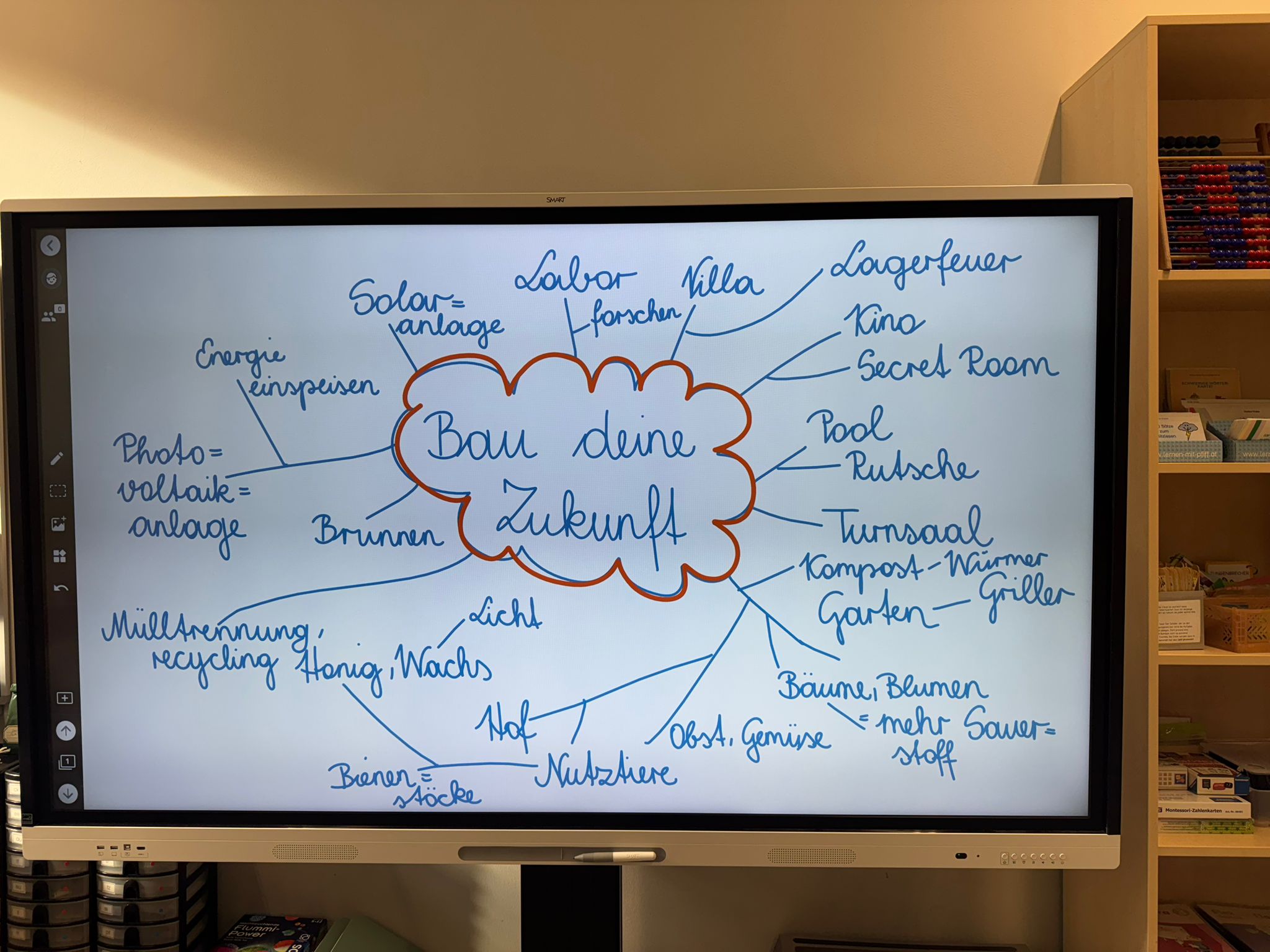 Nach dem Erstellen einer Mindmap, ging es auch schon los. In Kleingruppen durften die Kinder immer im Rahmen des offenen Arbeitens an unserem „Haus der guten Zukunft“ bauen.