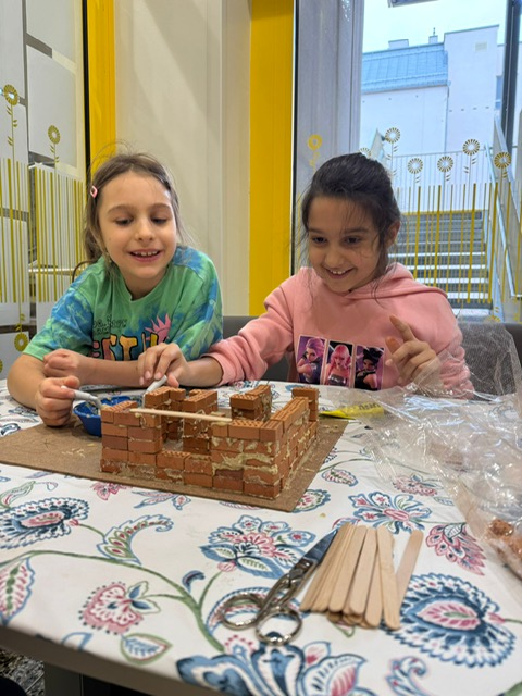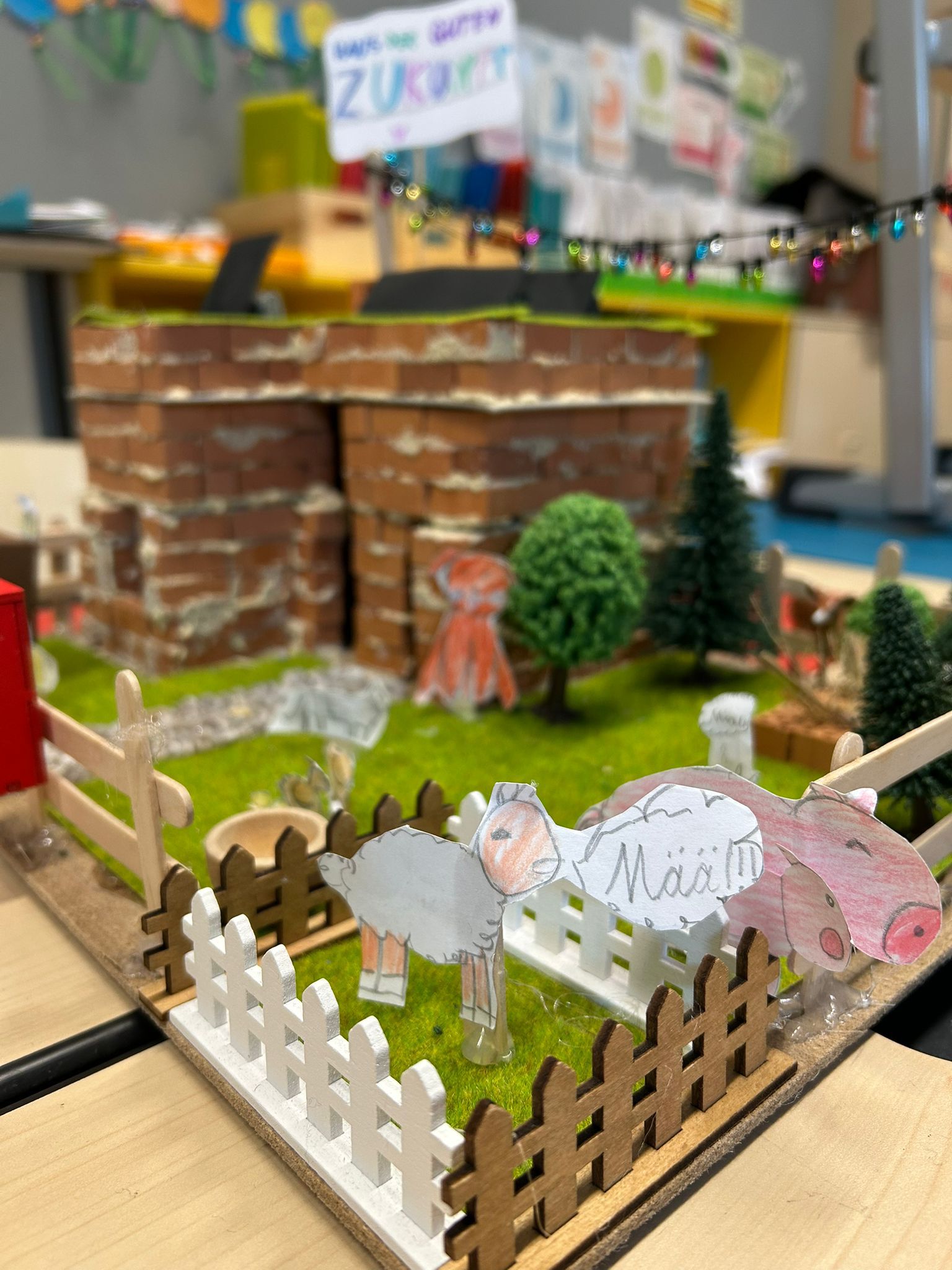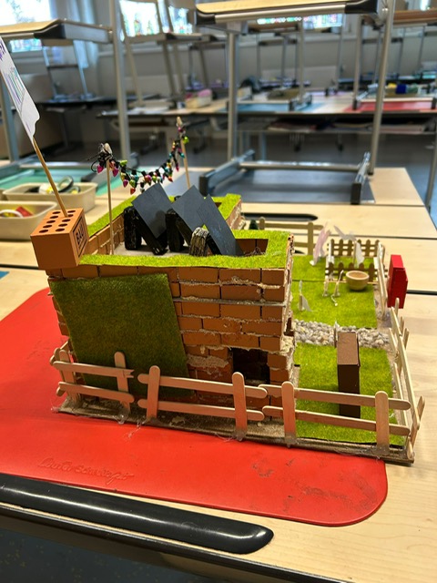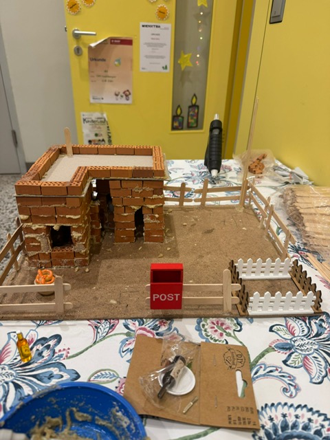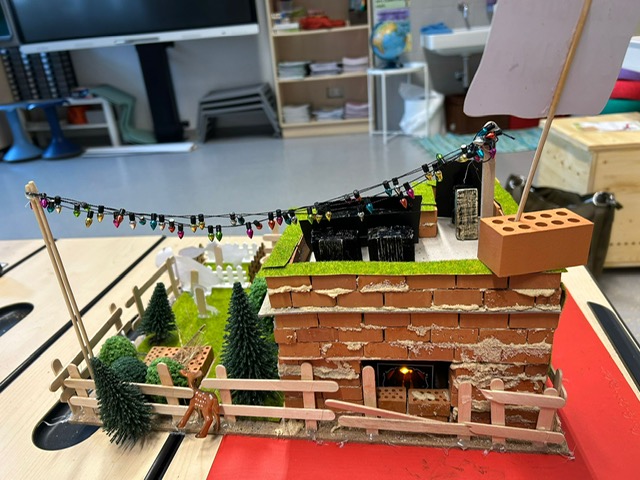Unser Projekt war das Bauen eines Selbsterhaltungshofes. Solarpaneelen am Dach, begrünte Flächen, ein Bienenstock, einige Nutztiere und vieles mehr wurde detailgetreu von den Kindern hergestellt.