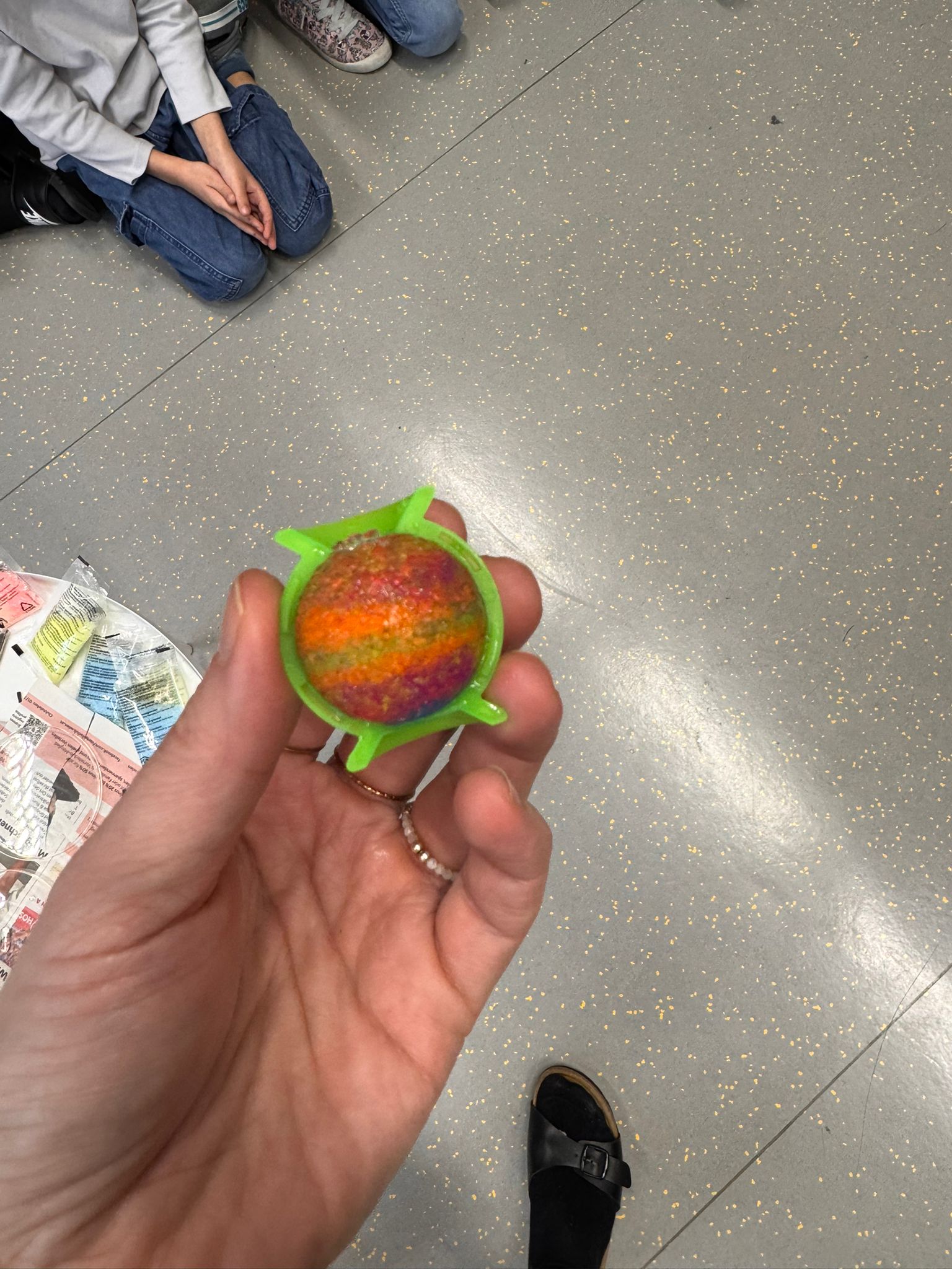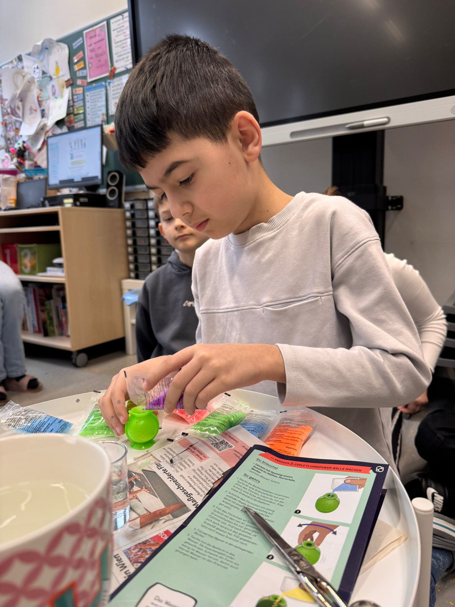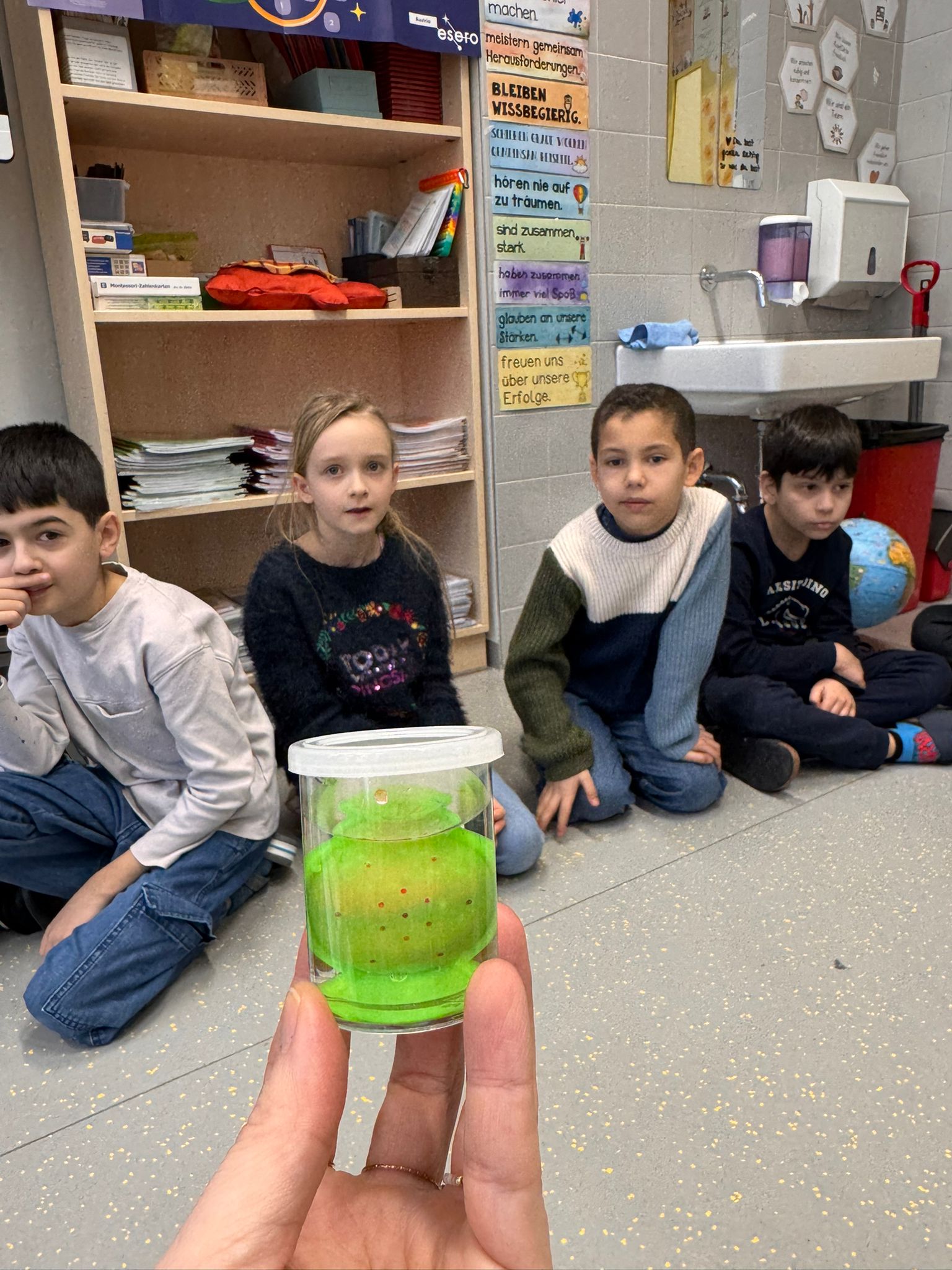 Die volle Form stellten wir dann in einen Behälter mit warmen Wasser. Nach 5 Minuten durften wir den aufgequollenen Flummi aus der Form lösen und mussten ihn 3 Minuten trocknen lassen.