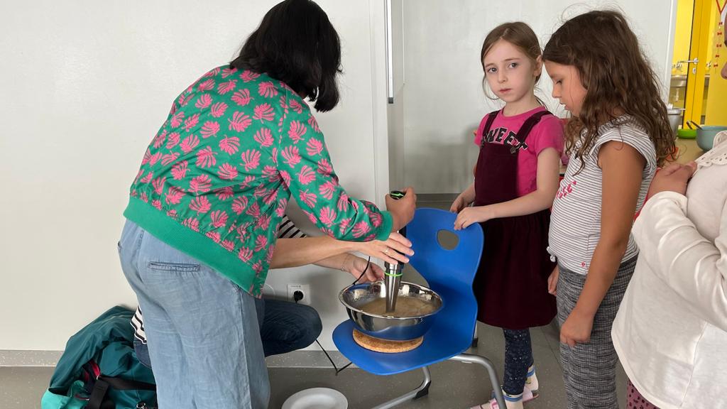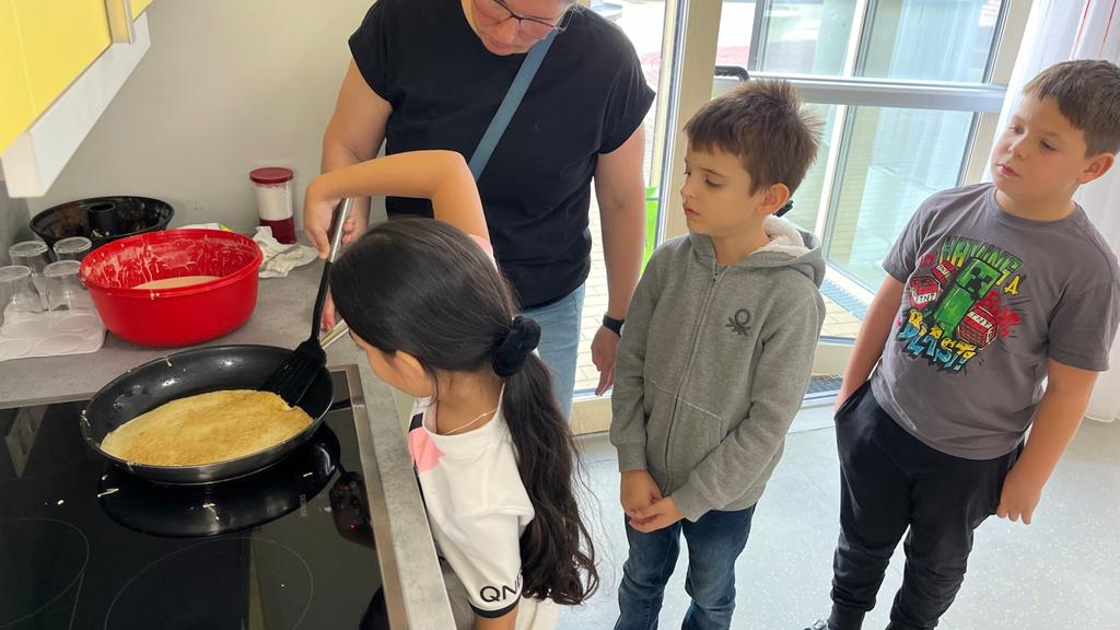 Zum Abschluss bekamen wir Besuch und Unterstützung von einer Mama- gemeinsam machten wir köstliche Palatschinken mit Apfelmus – mmmh! Gemeinsam mit FreundInnen schmeckt alles nochmal sooo gut!