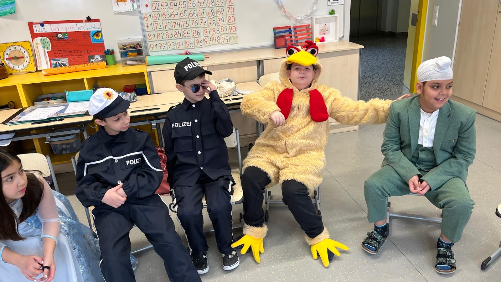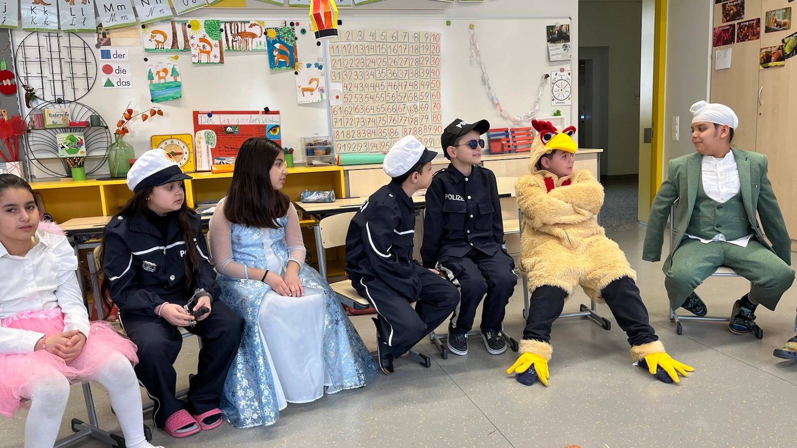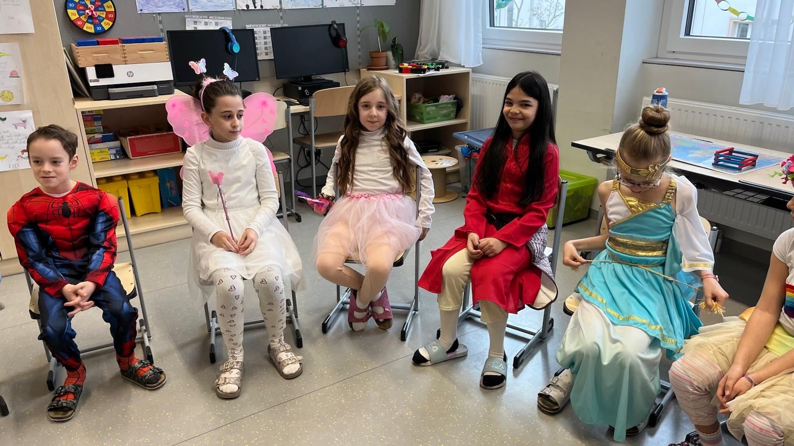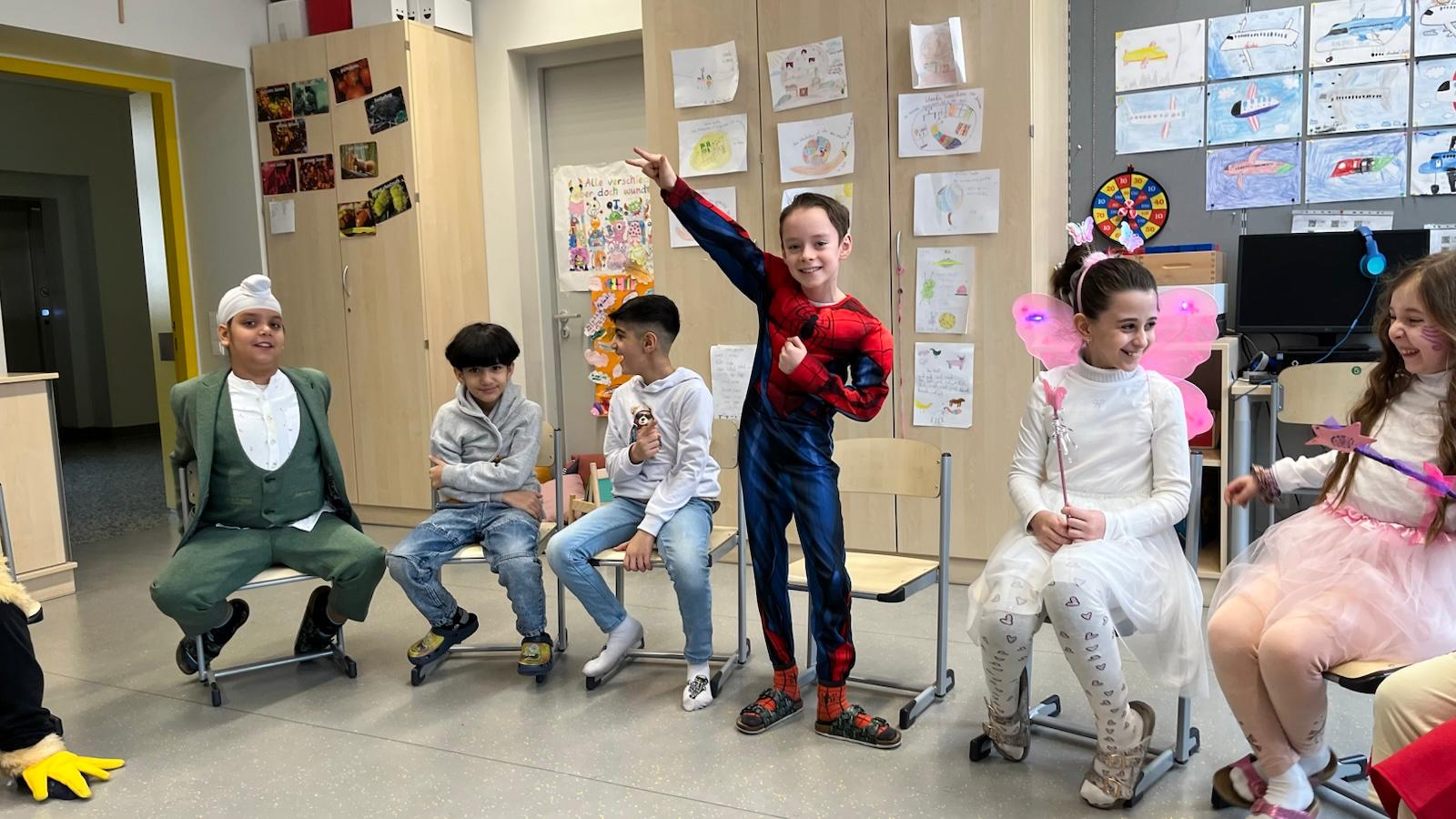 Februar 2025 …ein ausgelassenes Faschingsfest mit Prinzessinnen, einem Zauberer, Sherlok Holmes, Superman, ein paar Polizisten und einem Huhn.