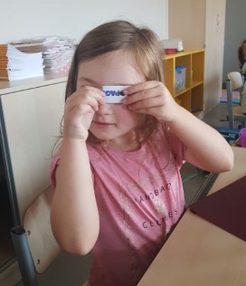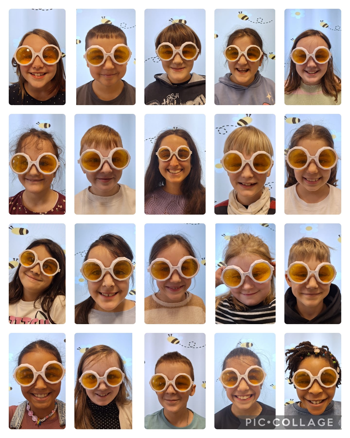 Wir beschäftigen uns in diesem Monat viel mit Bienen. Passend dazu haben wir eine Facettenlinsen-Brille ausprobiert, damit wir sehen, wie eine Biene die Welt sieht. Da man mit der Brille noch dazu besonders lustig aussieht, haben wir dieses Erlebnis gleich festgehalten.