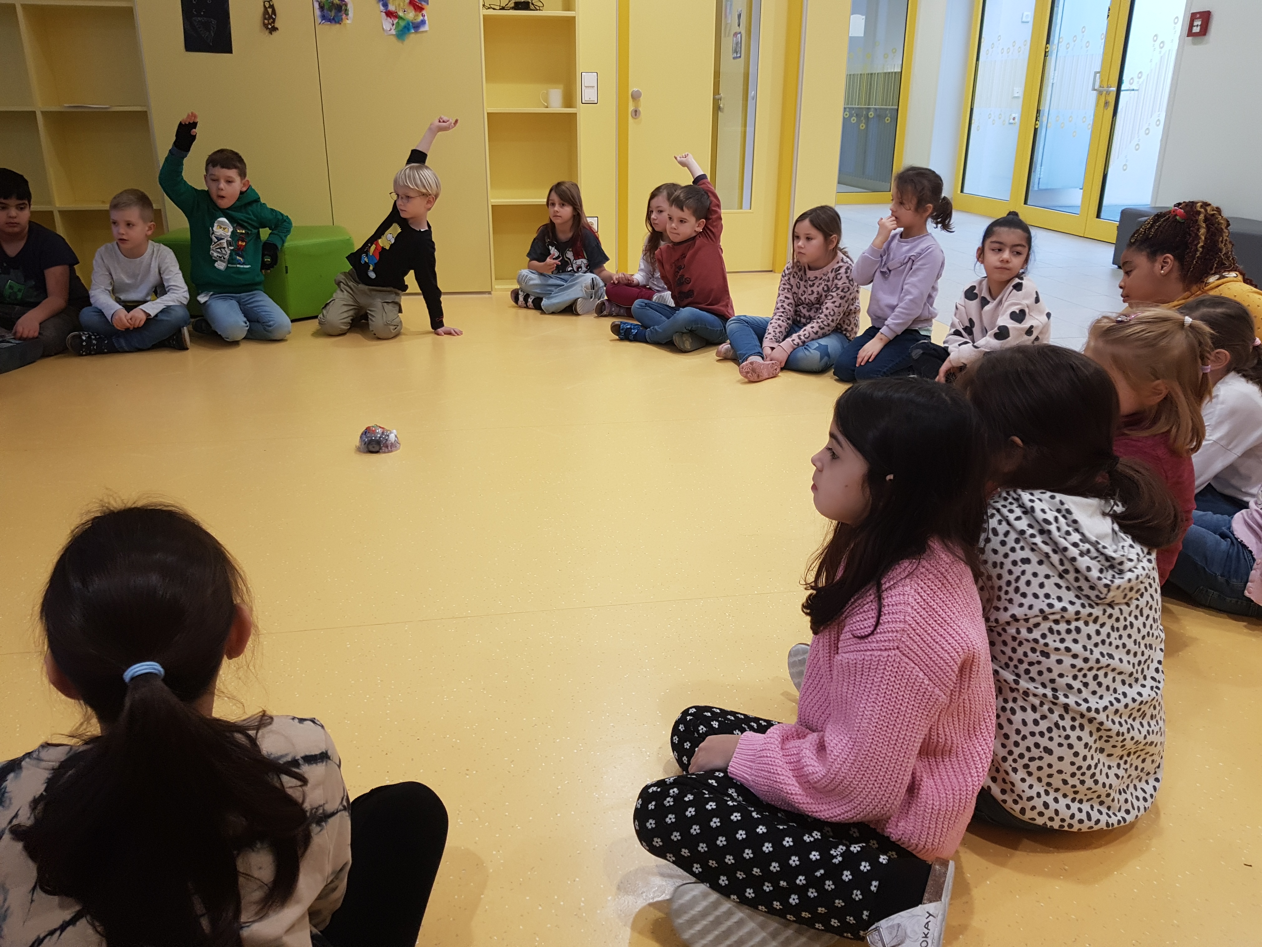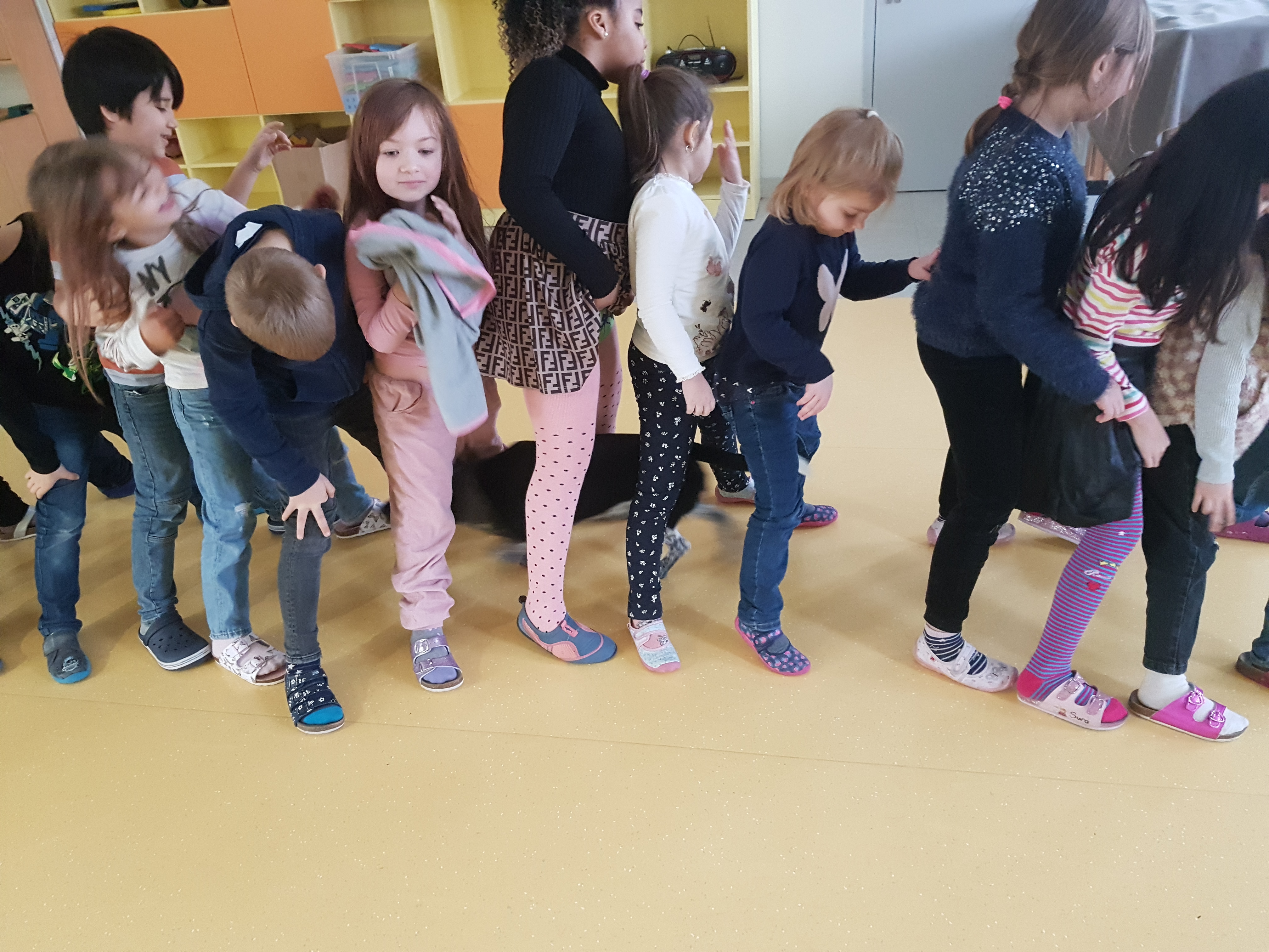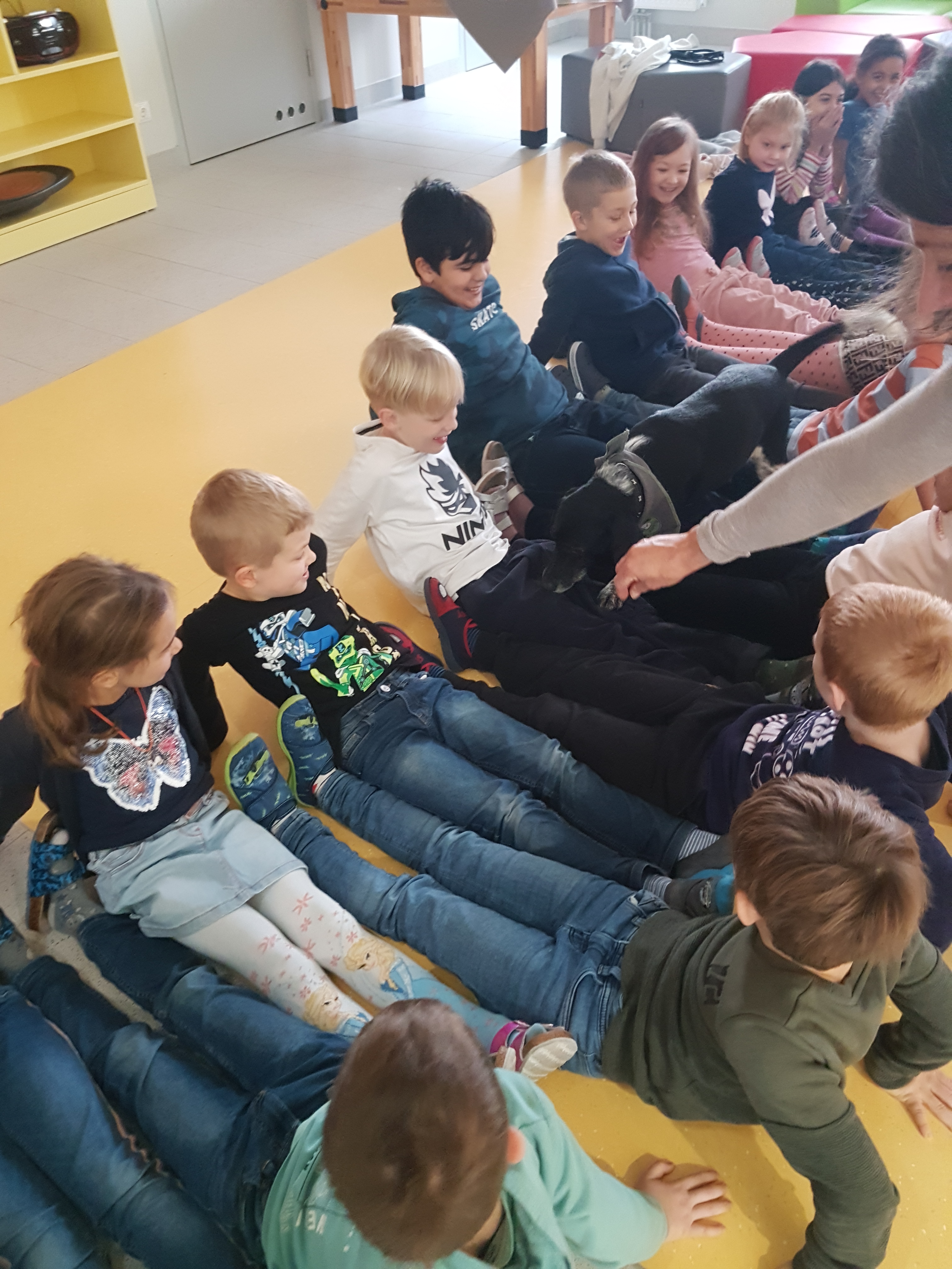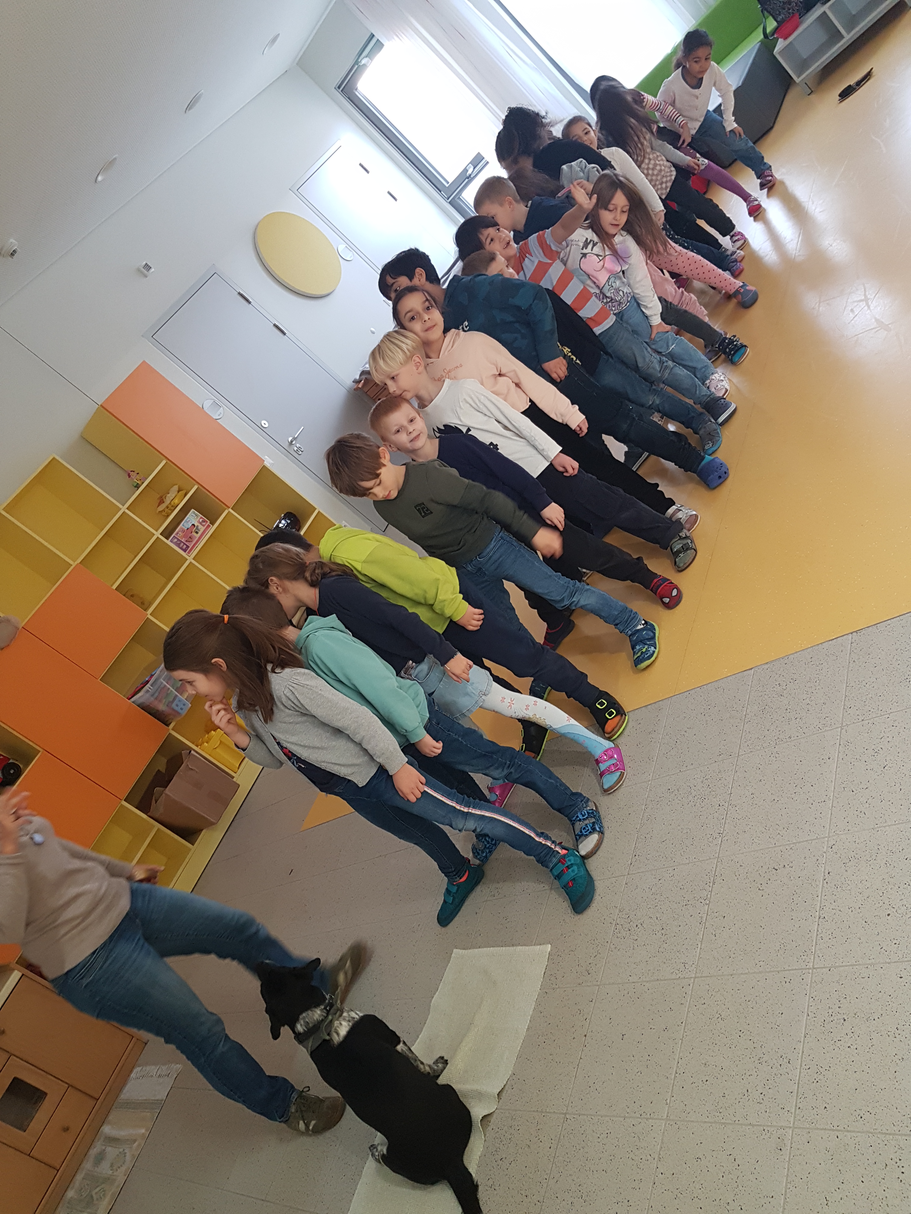 Da wir letzte Woche einiges über Hunde gelernt haben, hat uns heute gleich ein echter Hund besucht. Die Kinder durften „Luigi“ streicheln, ihm ein Leckerli geben und einige Tricks mit ihm ausprobieren. Wer hätte gedacht, dass Luigi sowohl durch die Beine als auch über die Beine der Kinder laufen kann? Die 1D war auf jeden Fall sehr fasziniert und freute sich wahnsinnig über den Besuch!