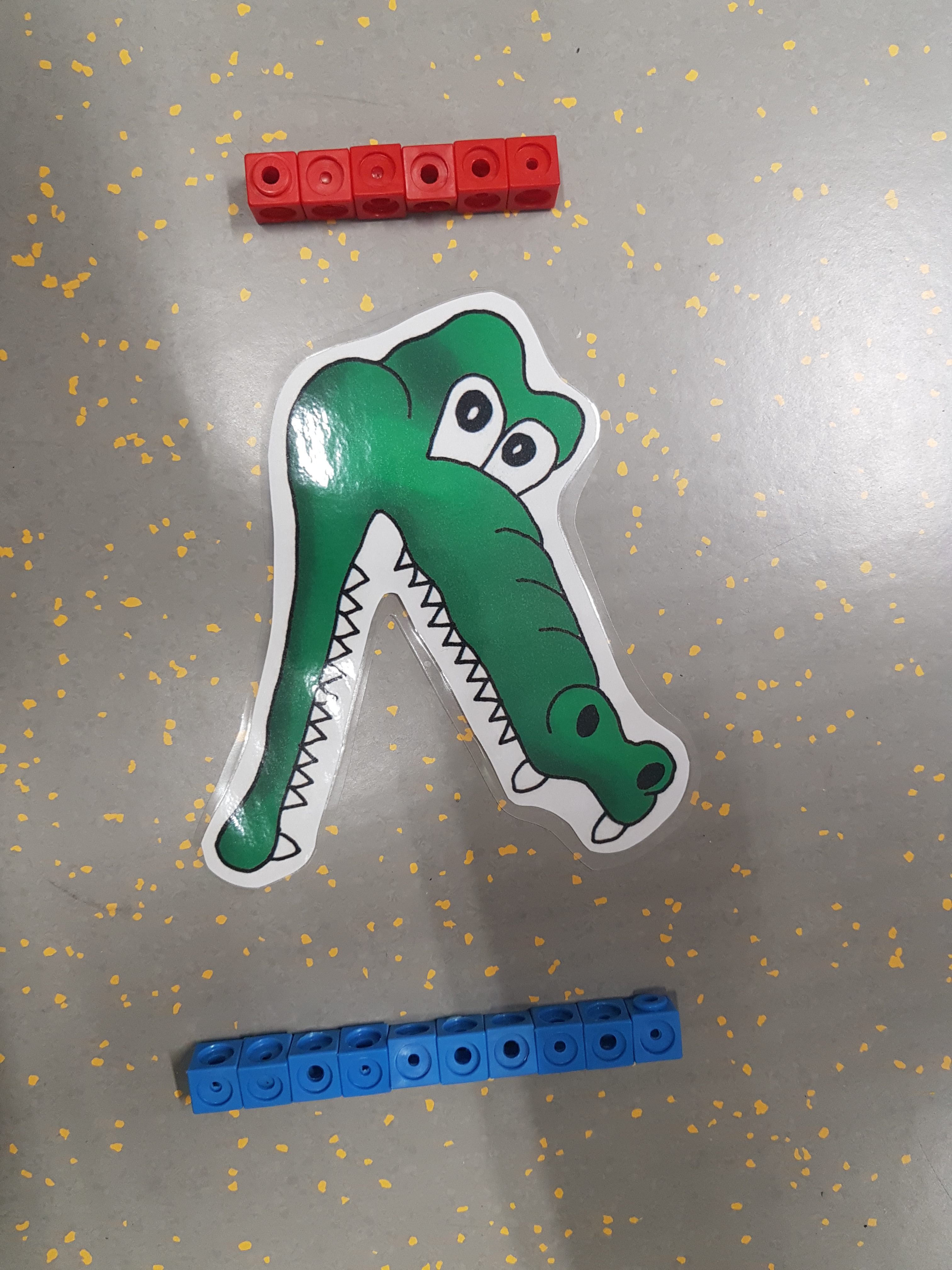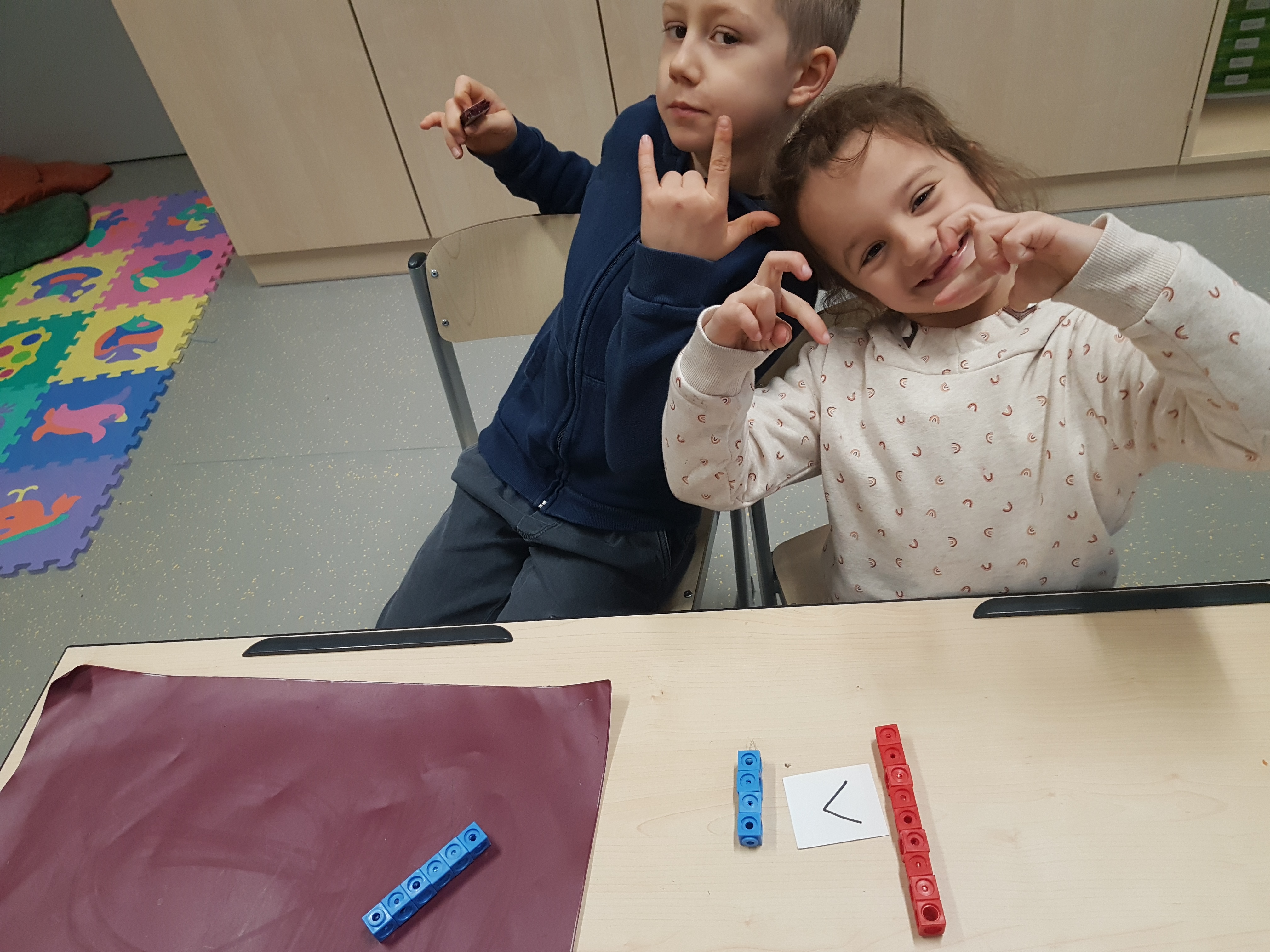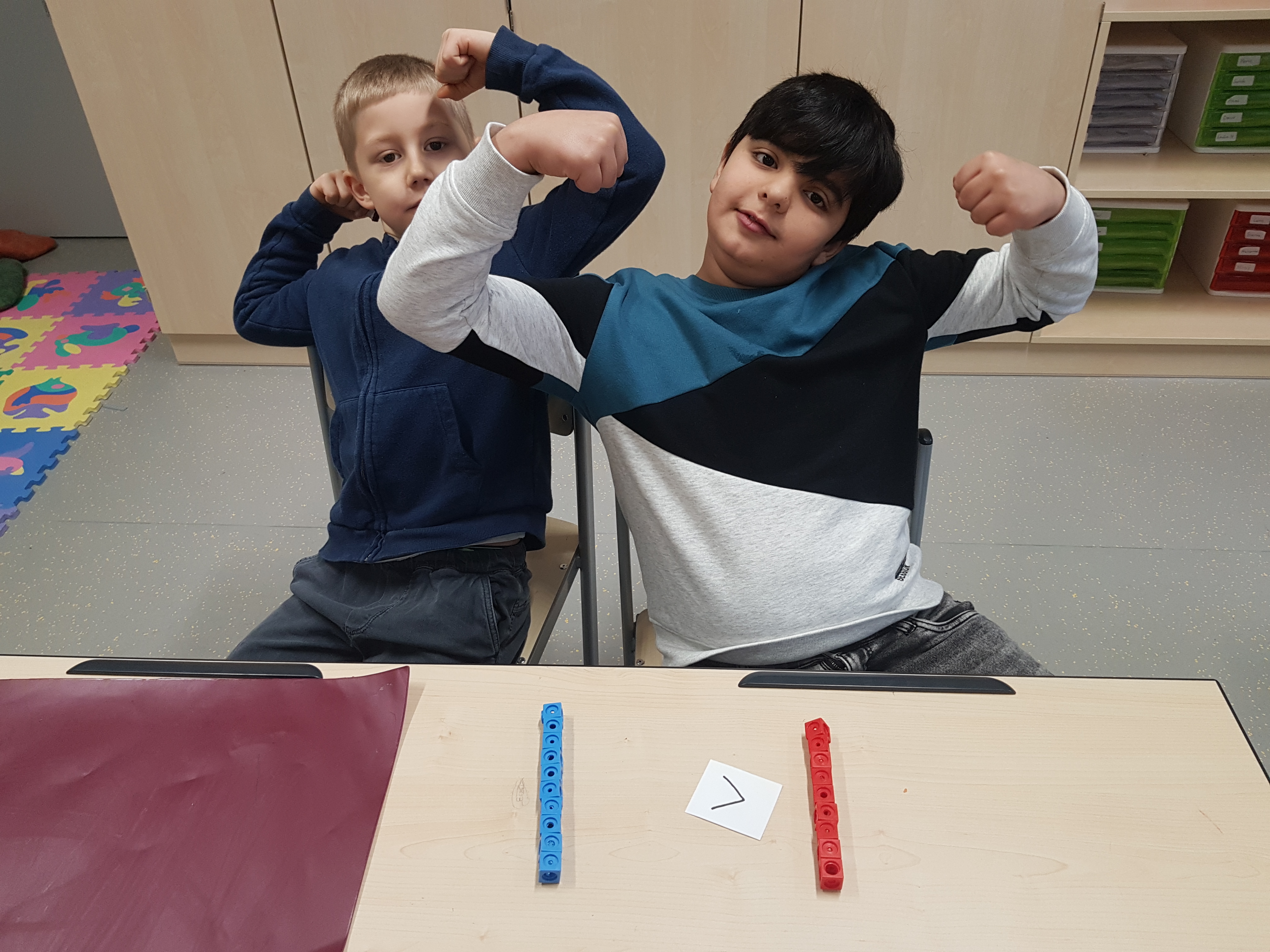 Heute konnten die Kinder in der Mathematikstunde viel ausprobieren. Das Größer-als- und Kleiner-als-Zeichen wurde mithilfe einer Krokodilgeschichte eingeführt. Das Krokodil liebt es zu essen. Aus diesem Grund, dreht es sich mit seinem offenen Maul immer zu der Zahl/Menge, die größer ist. Dies haben wir zuerst im Sitzkreis mit Zahlen, Rechenwürfeln und Plättchen ausprobiert. Dann durften die Kinder selber arbeiten. Sie bekamen Rechenwürfel und Kärtchen mit „>“ und „<“ und mussten in Partnerarbeit Gleichungen legen. Das erste Kind legte immer zwei Mengen an Würfeln und das zweite Kind musste das richtige Zeichen in die Mitte legen. Danach wurde getauscht.