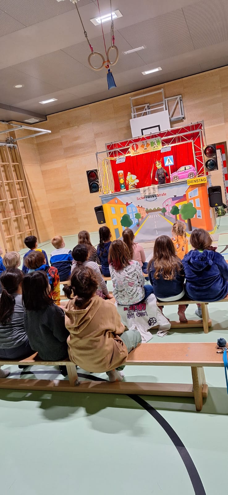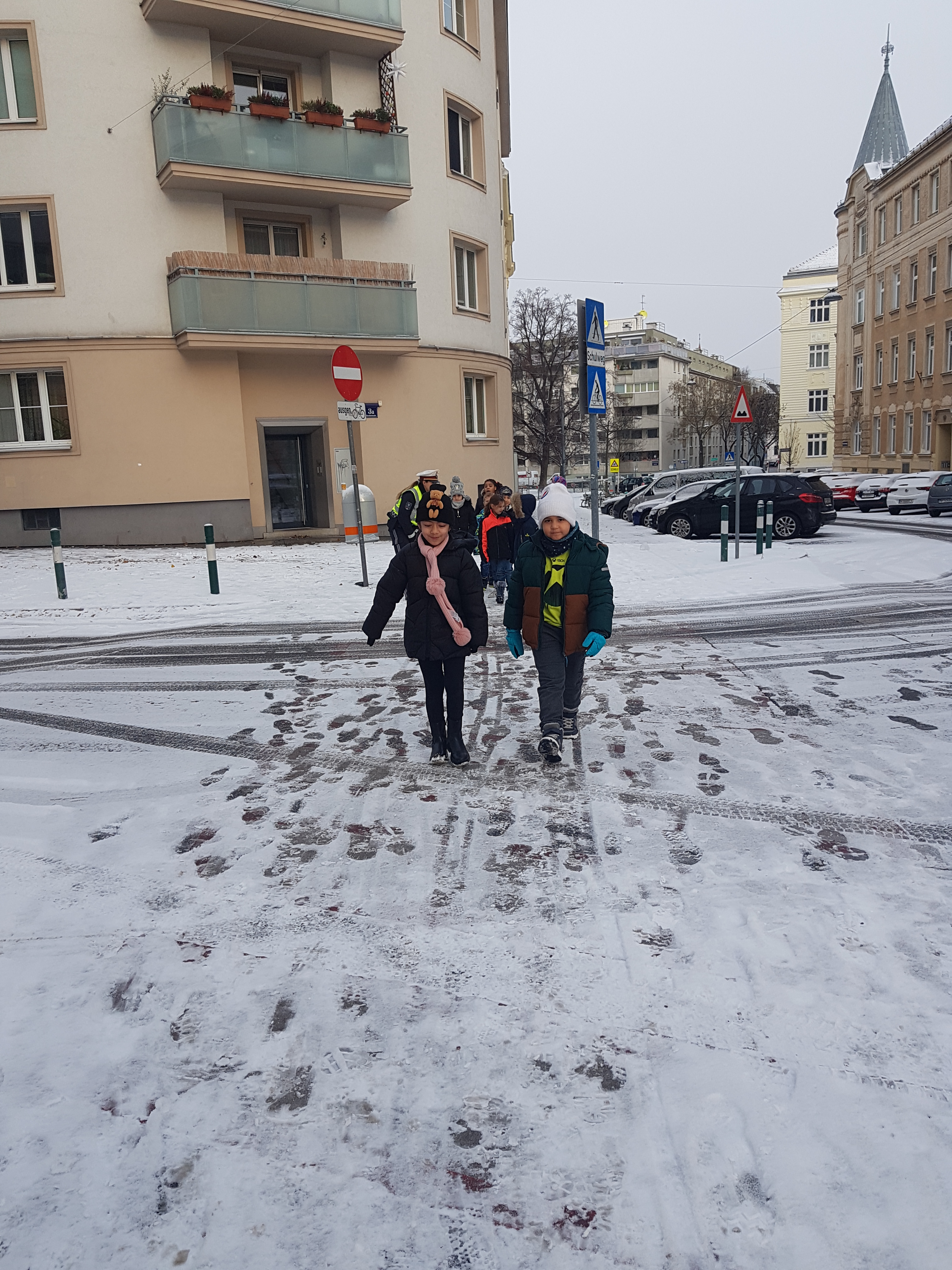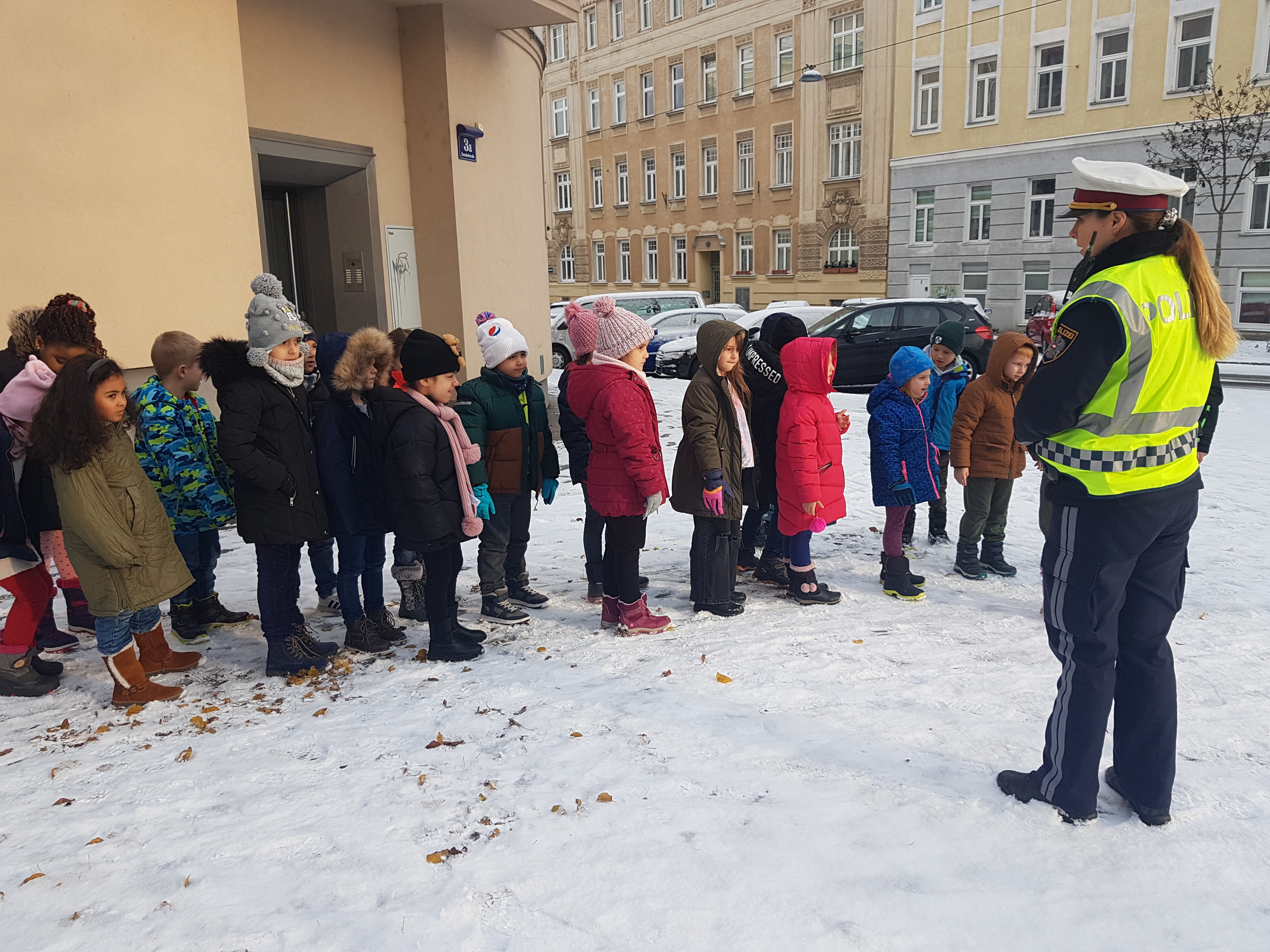 Wir hatten Besuch von zwei sehr netten Polizistinnen. Gemeinsam lernten wir viel über das richtige Überqueren von Straßen. Das Gelernte durften wir dann gleich im Schnee ausprobieren.