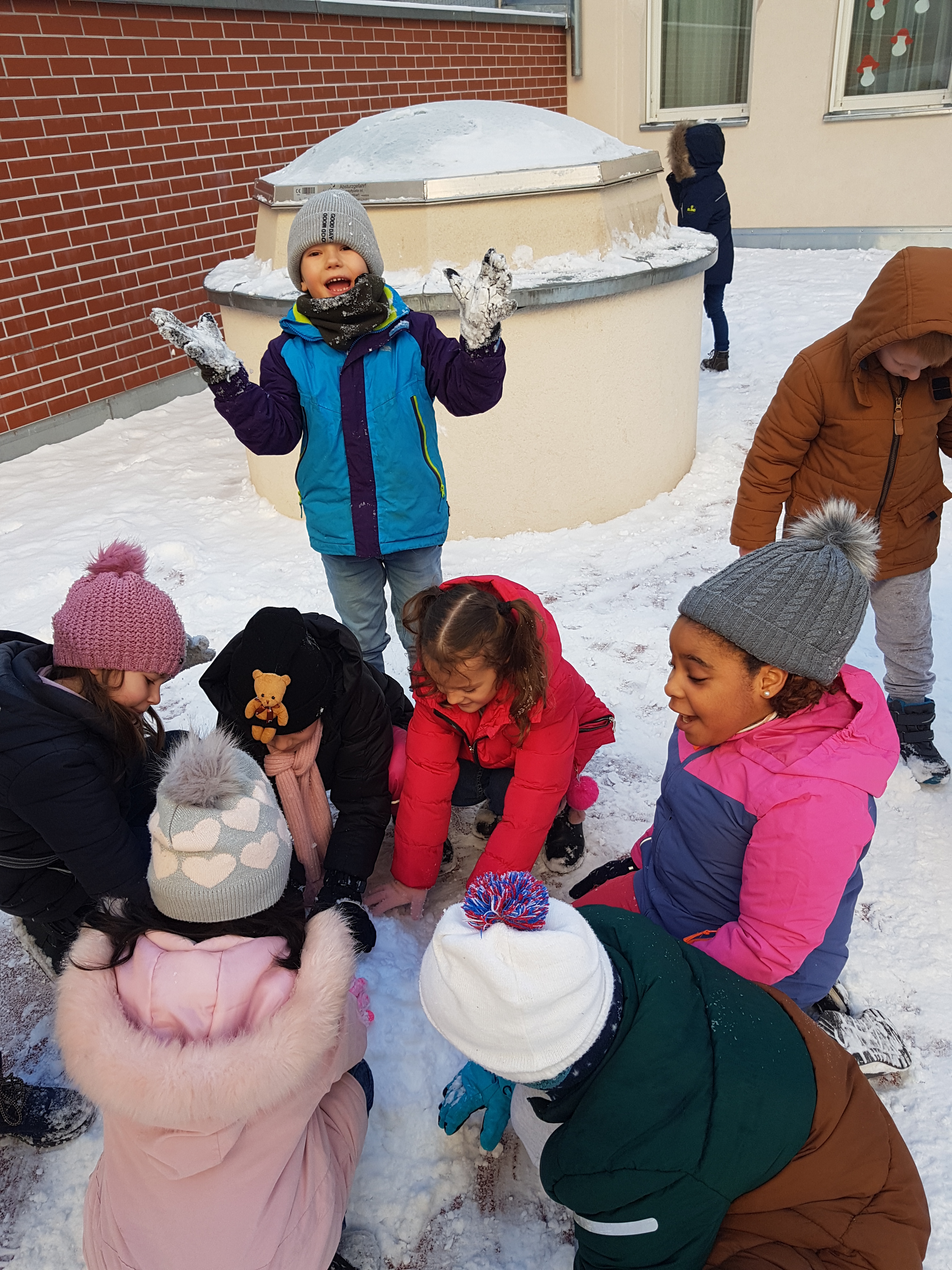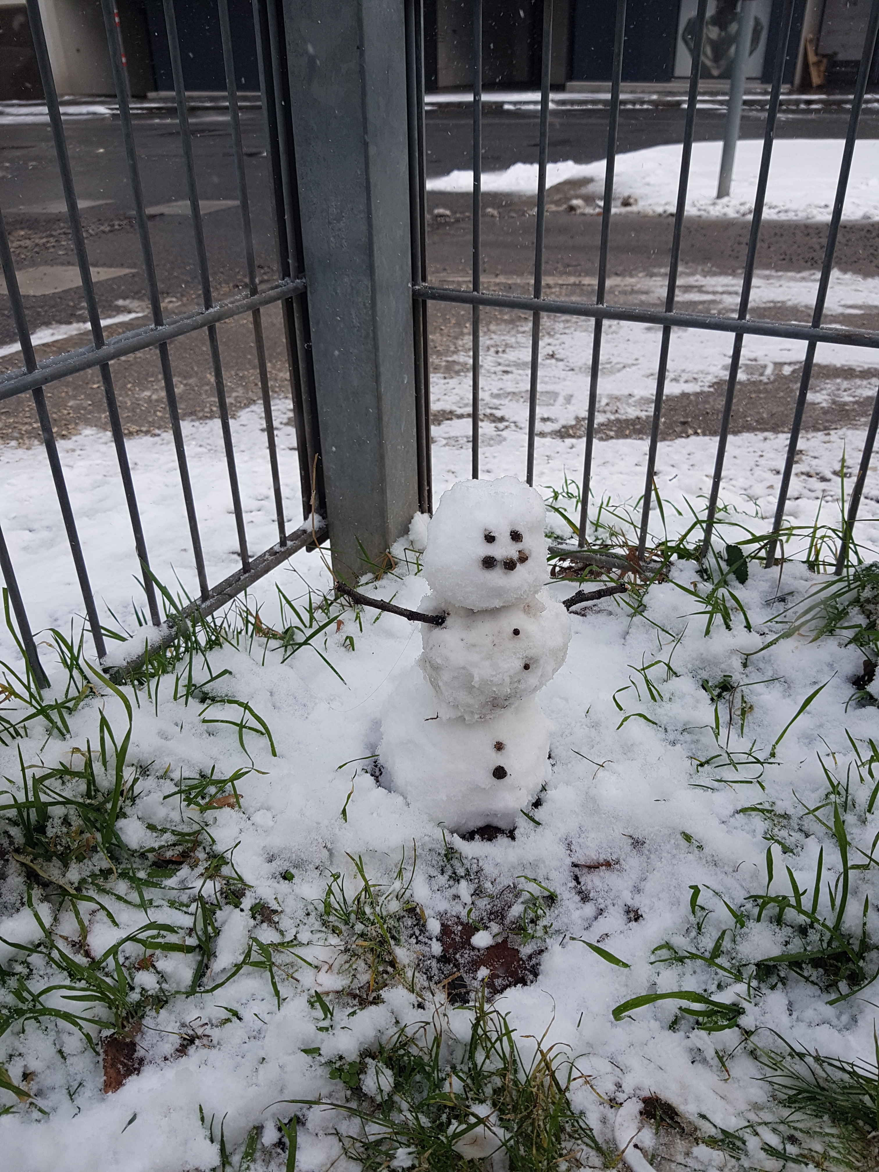 Da es gestern geschneit hat, waren wir heute in der Turnstunde im Freien. Es wurde viel gespielt und an Schneemännern gebaut.