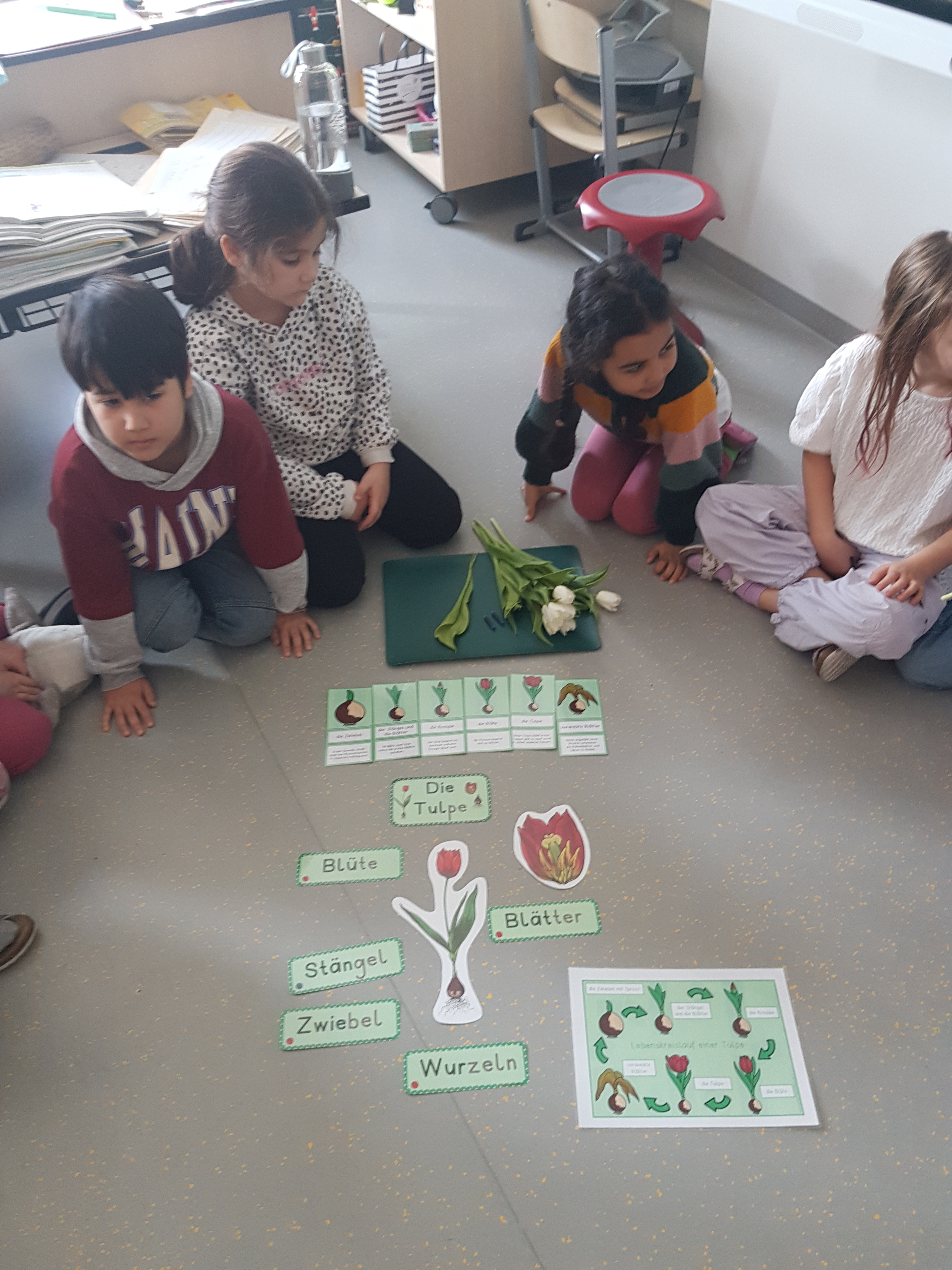Diese Woche beschäftigten wir uns mit Tulpen. Wir besprachen den Aufbau einer Tulpe und ihren Lebenskreislauf. Nachdem wir echte Tulpen gründlich untersuchten, folgte ein Experiment. Wir stellten uns folgende Fragen: Kann eine Tulpe ohne Wasser leben? Was passiert, wenn ich das Wasser färbe? Was passiert, wenn ich den Stängel einer Tulpe spalte und die Tulpe dann in zwei Gläser mit verschiedenen Farben stelle? Nachdem wir eine Nacht warten mussten, wurde das Ergebnis heute bestaunt und die durstige Tulpe gerettet.