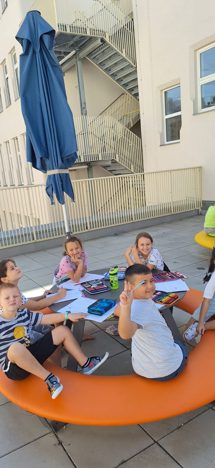 Weil uns in unserem Klassenzimmer zu heiß war, haben wir heute unseren ersten Schreibschrift- Buchstaben auf der Dachterrasse erarbeitet.