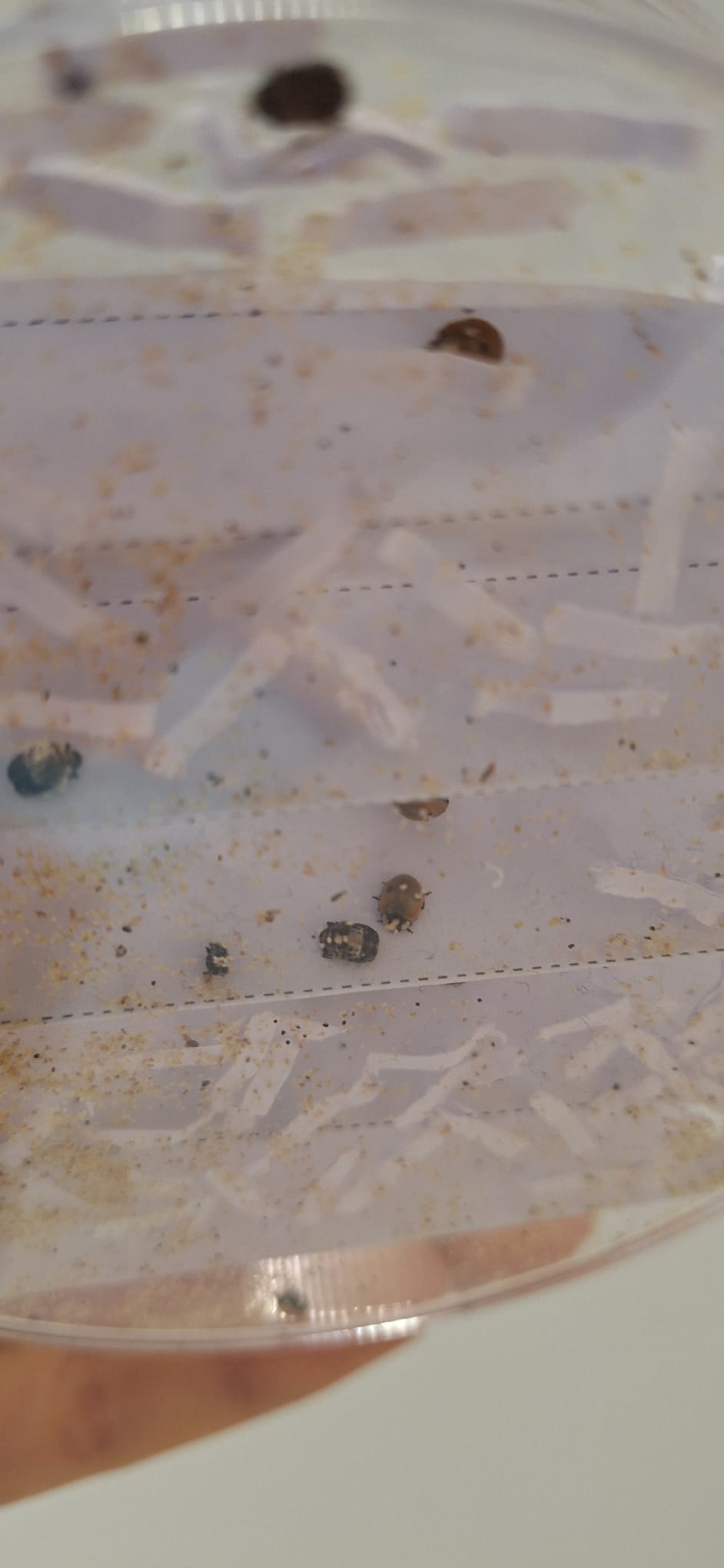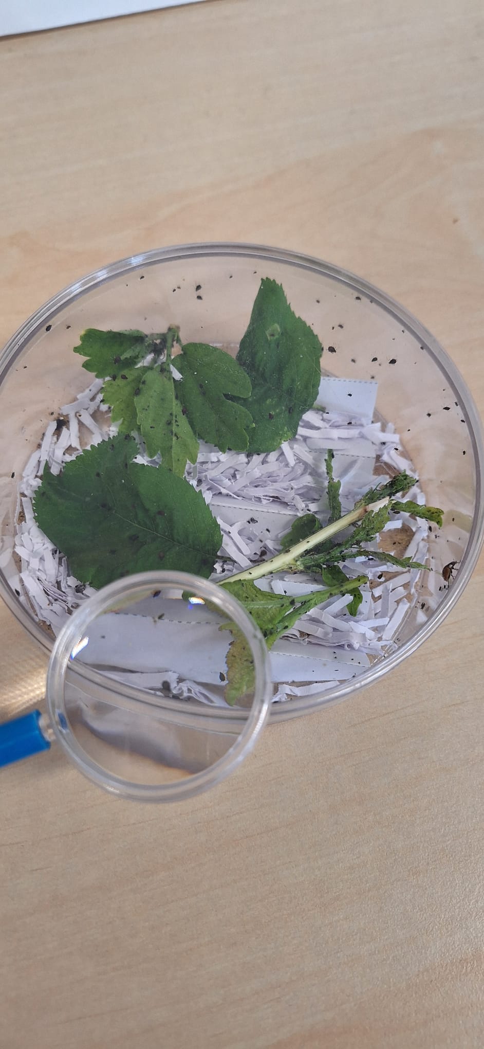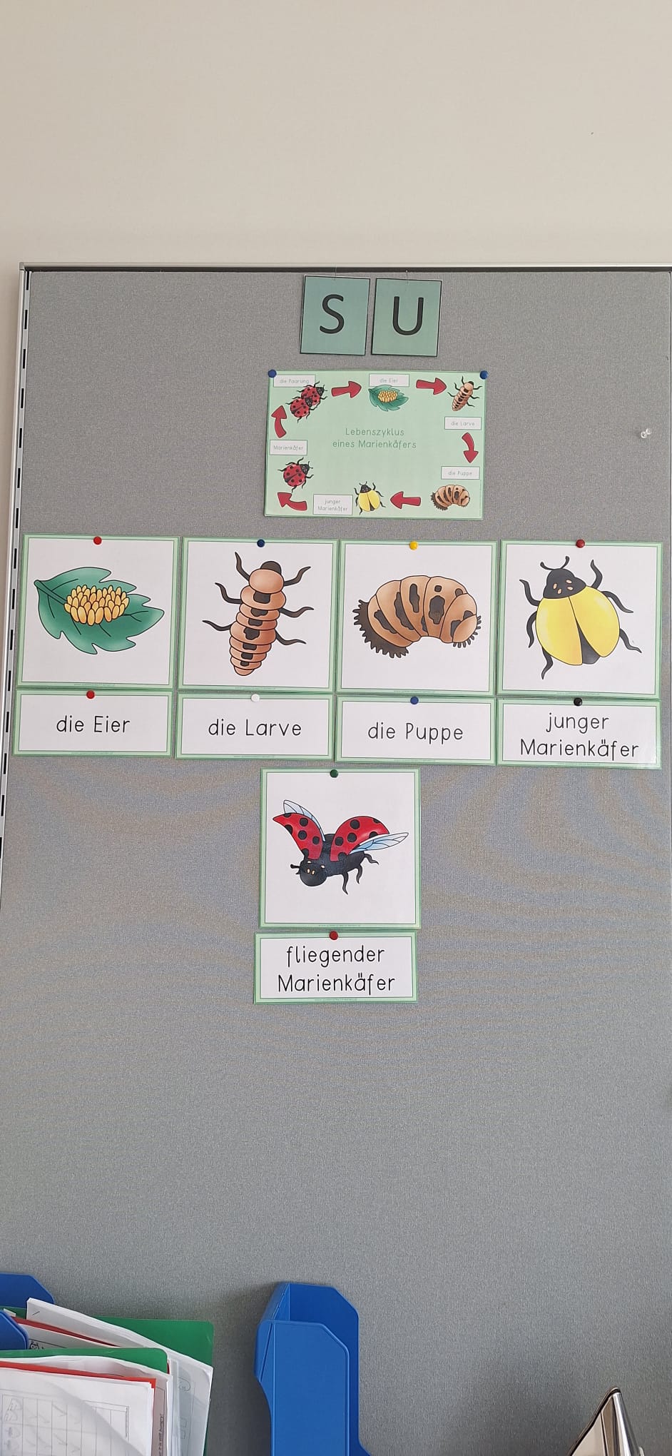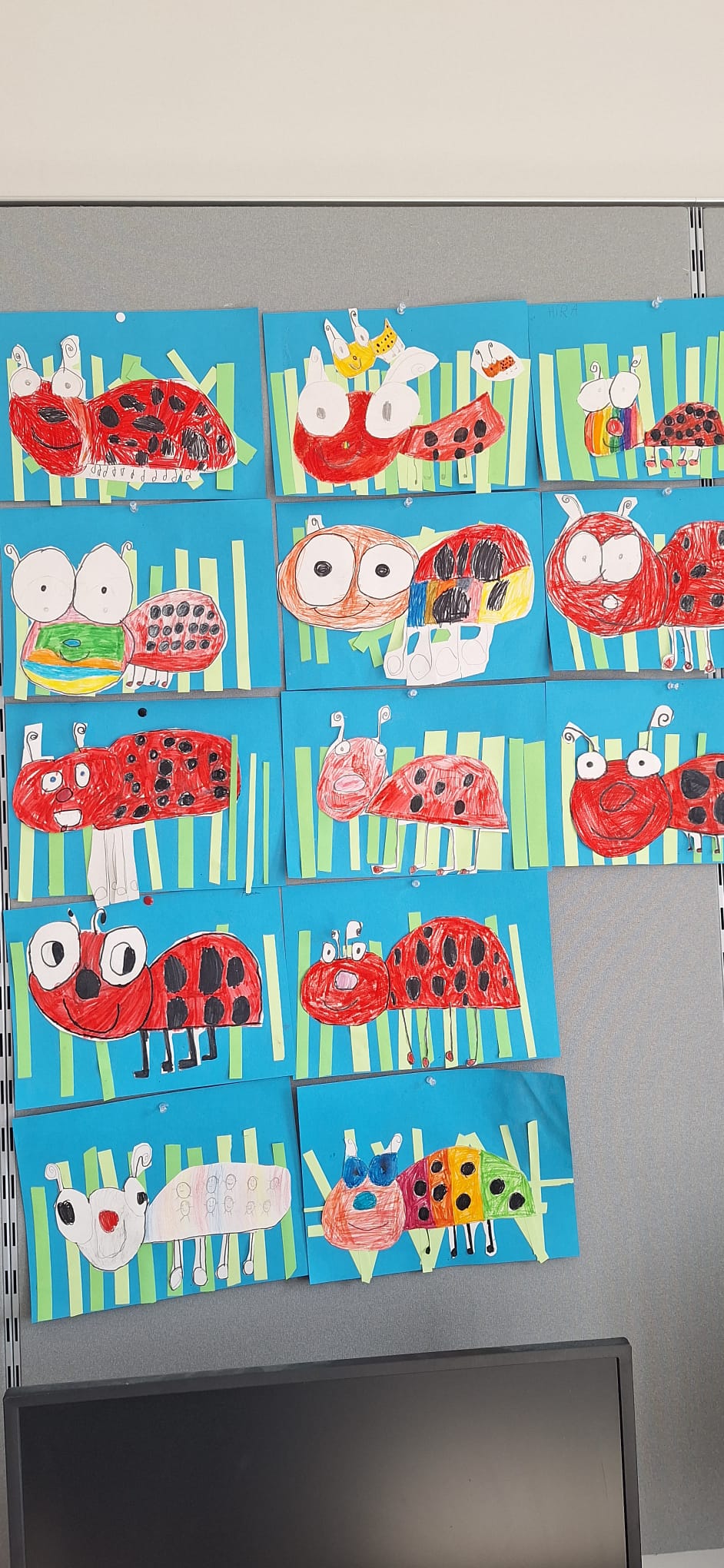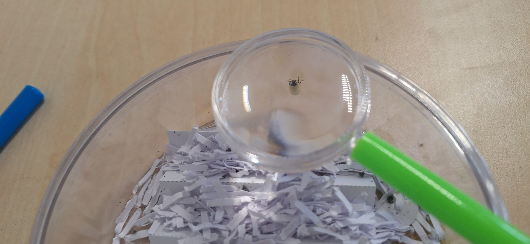 Unsere Marienkäferlarven kamen gleich nach den Osterferien an. Wir haben mit unseren Lupen die kleinen Larven täglich beobachtet bis sie sich verpuppten und schließlich zu Marienkäfern wurden. So konnten wir den Lebenszyklus eines Marienkäfers hautnah miterleben und lernten, wie man sich um Tiere kümmert. Besonders spannend fanden wir, dass die Deckflügel der Marienkäfer gleich nach dem Schlüpfen noch weiß/hellgelb sind und erst nach ein paar Stunden die eigentliche Farbe sowie die Punkte bekommen. Die geschlüpften Marienkäfer haben wir ein paar Tage mit Blattläusen gefüttert und dann gemeinsam im Park freigelassen. Wir vermissen unsere Marienkäfer sehr!
