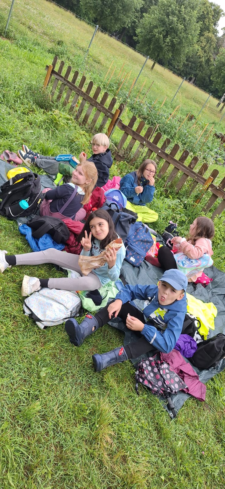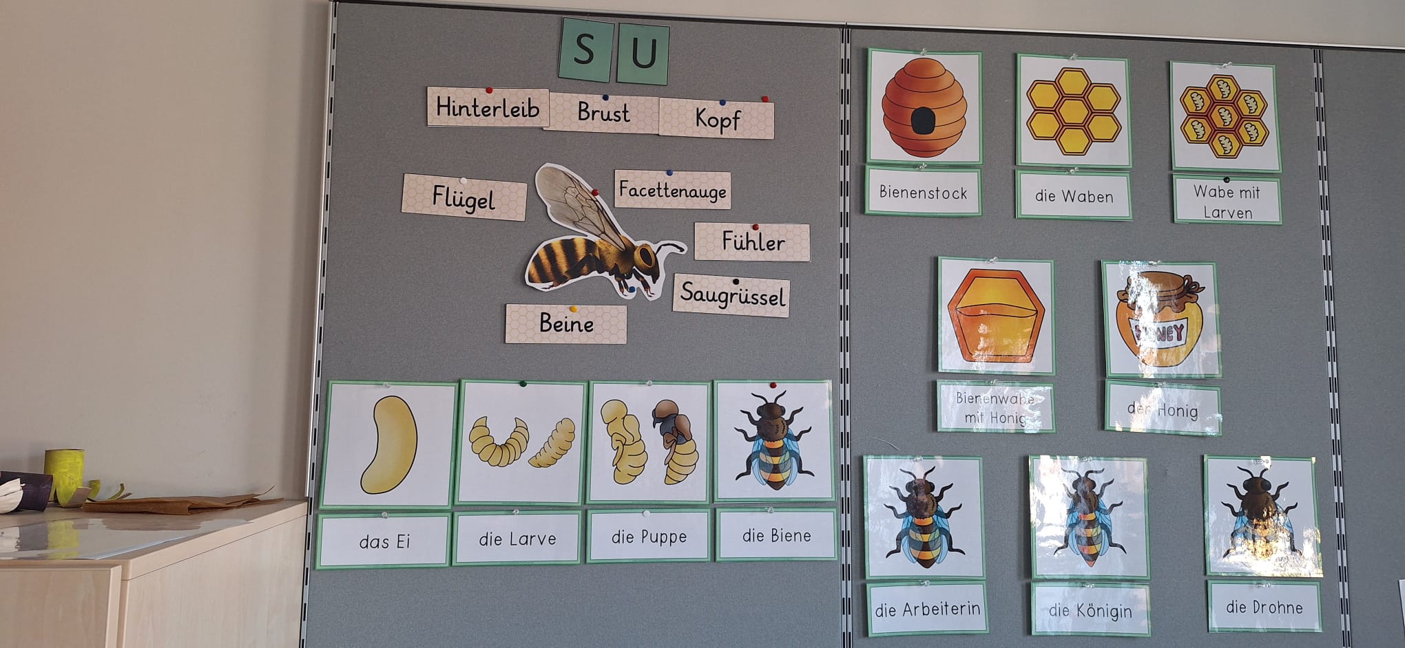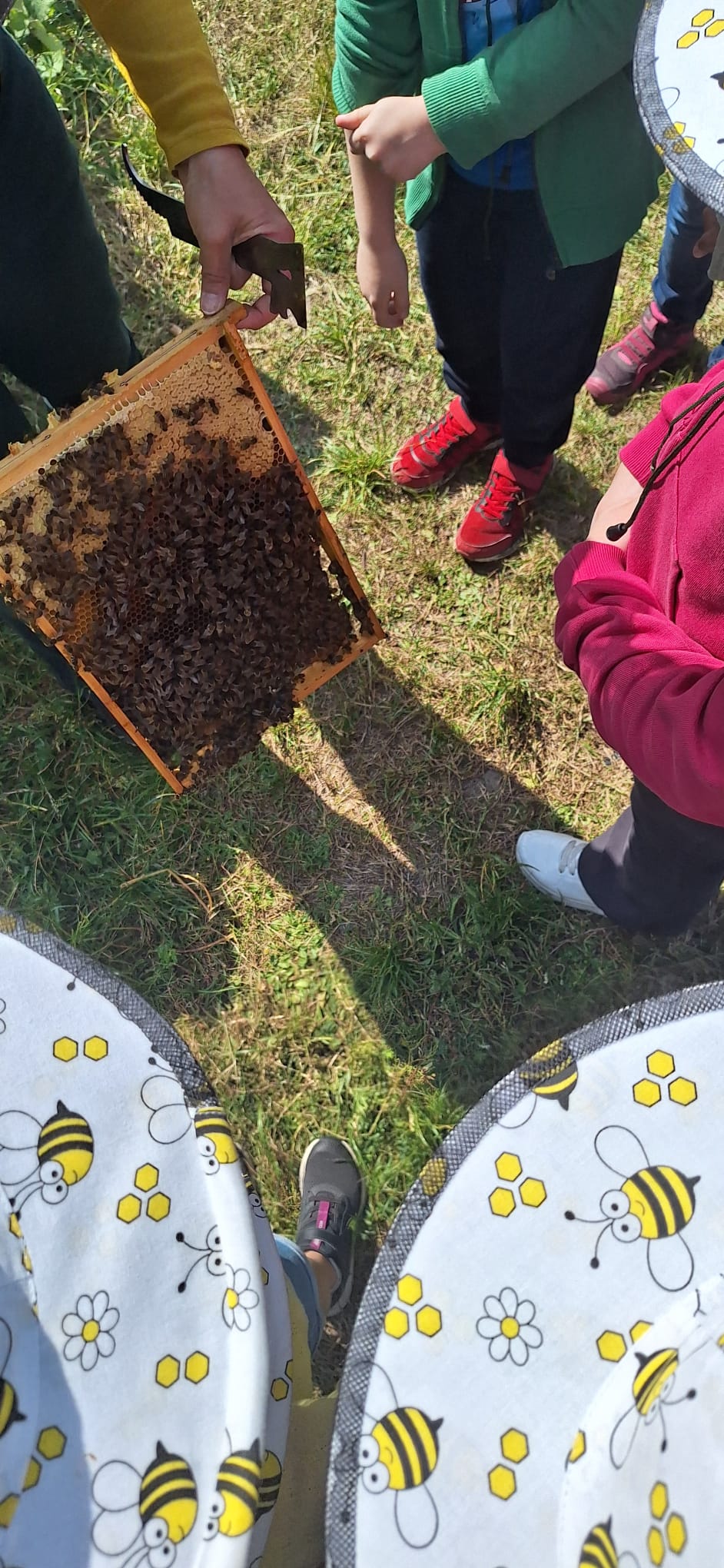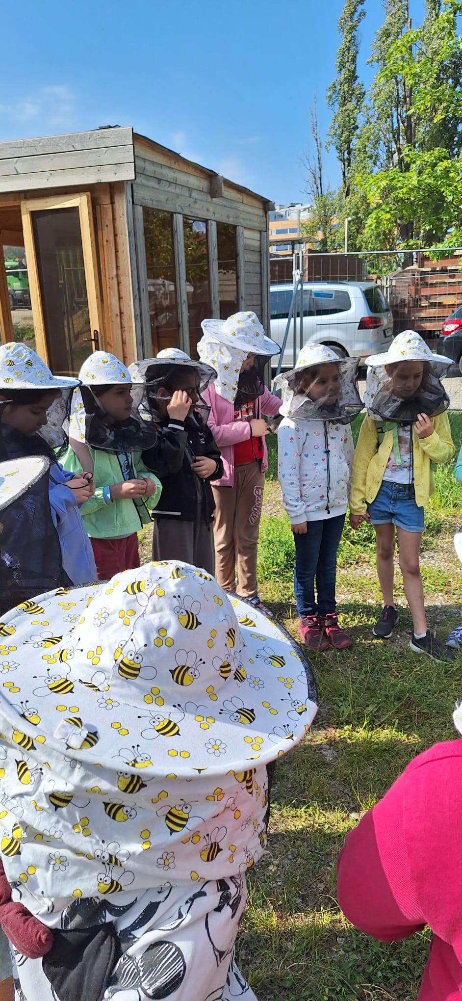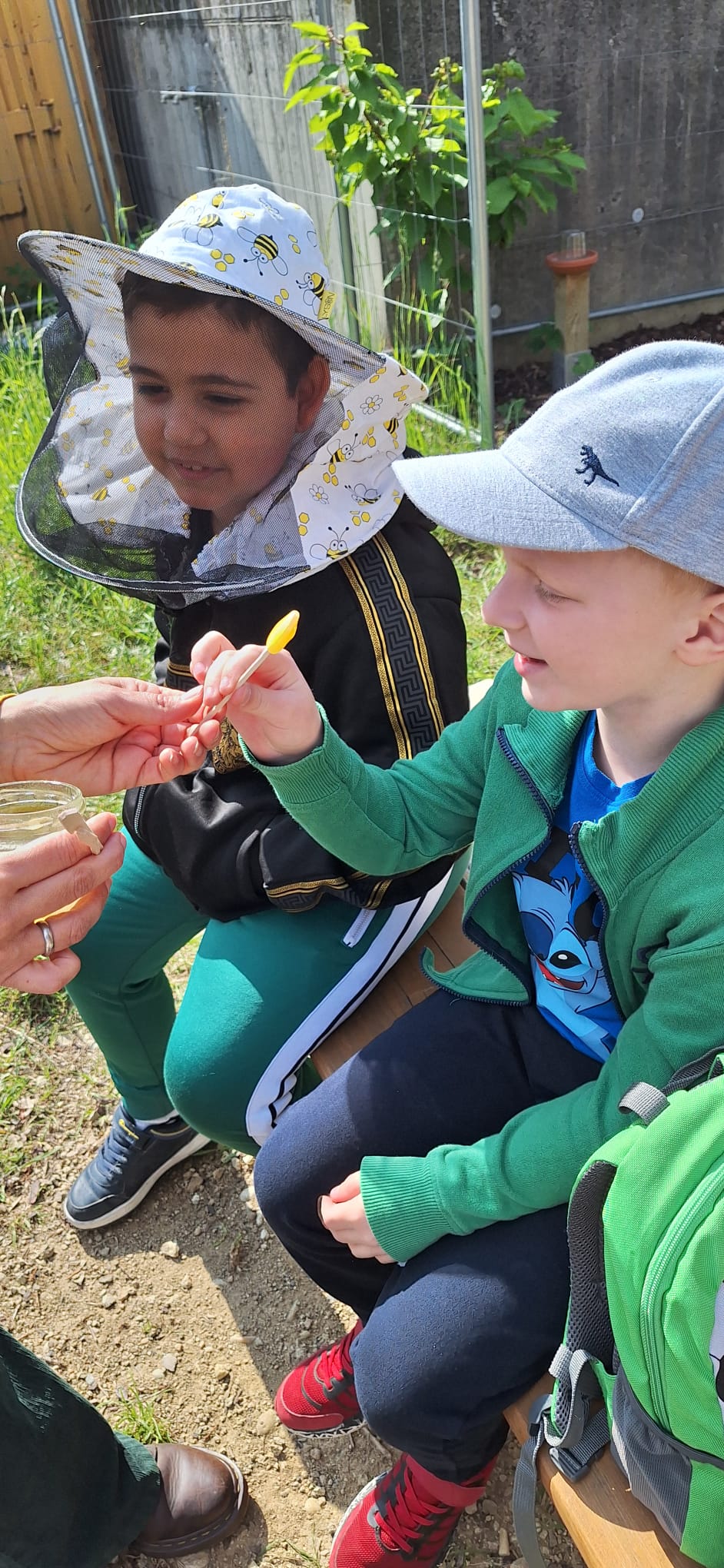 Wir waren heute im Bienenlerngarten. Dort haben wir viel über Bienen gelernt, Honig gekostet, einen Bienenstock genauer betrachtet und sogar eine Drohne auf der Hand halten können. Die Kinder durften sogar kleine Imkerhüte tragen, die mit Bienen verziert waren. Es war eine tolle Erfahrung für alle! 🐝