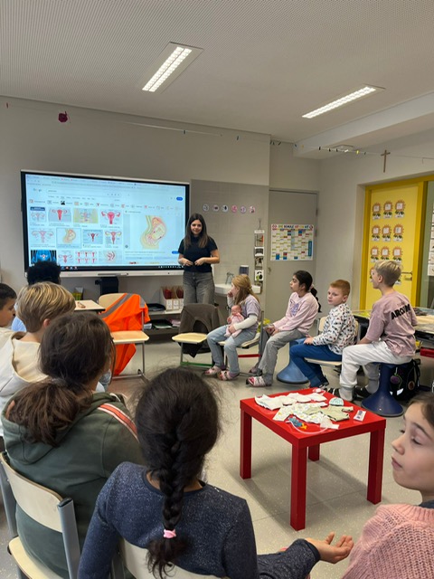 Wir haben uns im Unterricht mit den Fragen beschäftigt, wie neues Leben entsteht und wie ein Kind sich entwickelt. Dazu besuchte uns eine Hebamme, die anschaulich erklärte, wie eine Schwangerschaft verläuft, welche Veränderungen im Körper der Mutter stattfinden und wie die Geburt abläuft. Außerdem zeigte sie, wie sich ein Kind von den ersten Lebenswochen bis ins Jugendalter entwickelt.