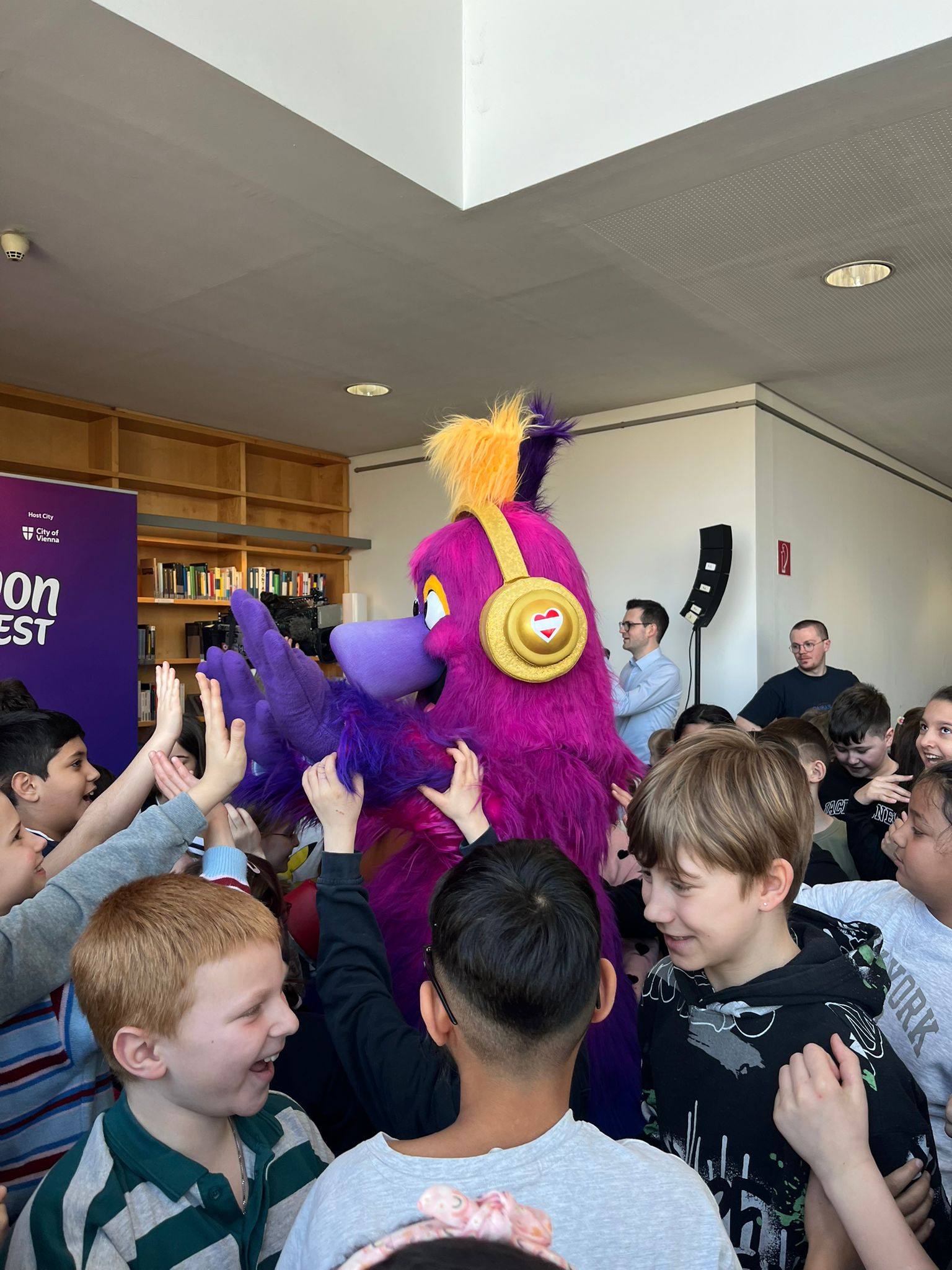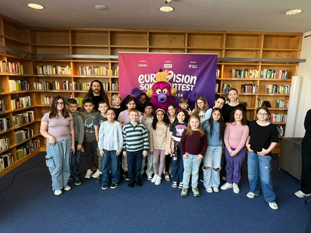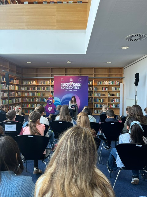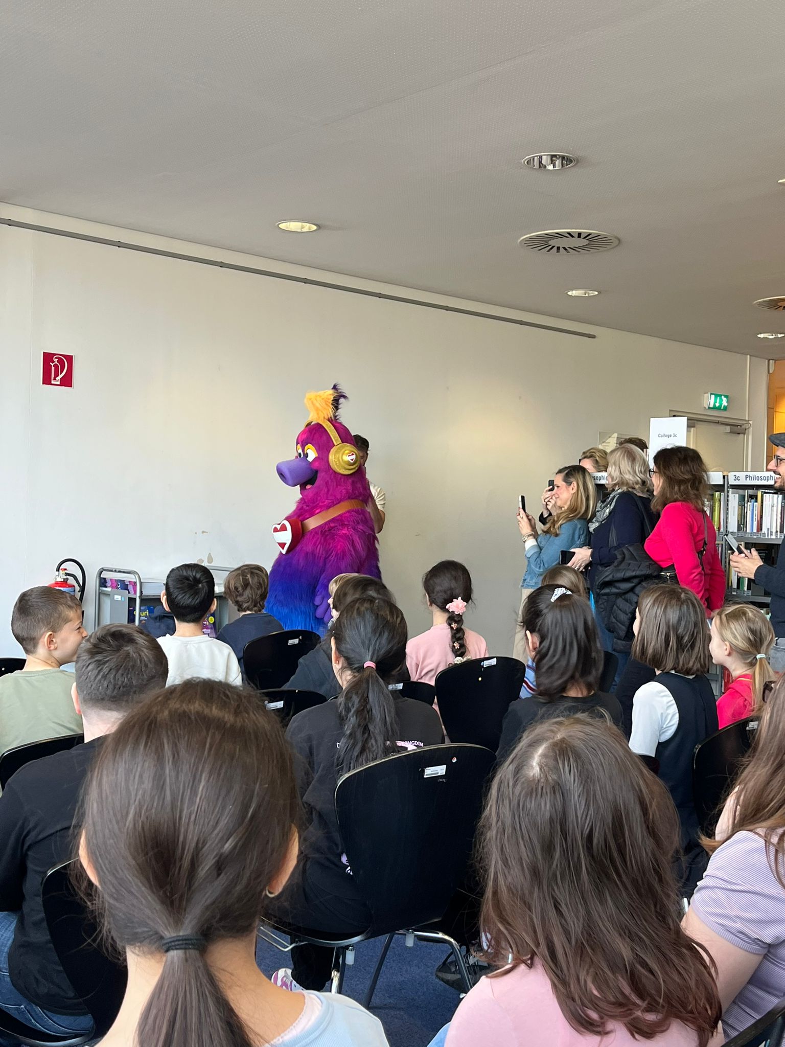 Bei einer Lesung in der Bücherei durften wir das Maskottchen „Auri“ des diesjährigen Eurovision Song Contest kennenlernen und mit ihm tanzen.