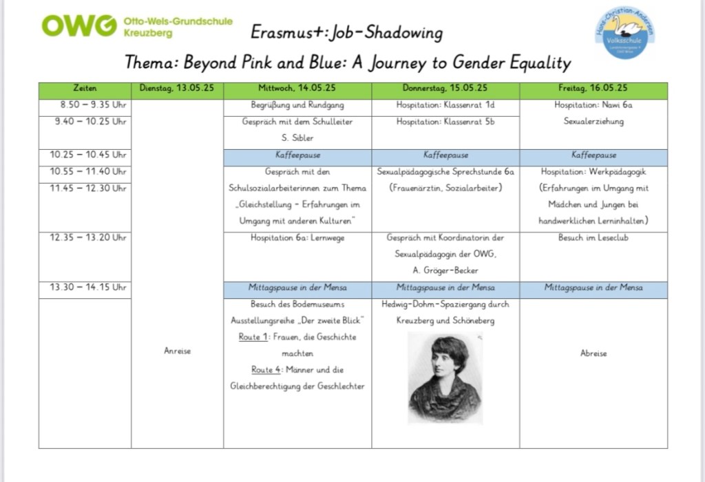 Im Rahmen des Erasmus+-Projekts hatten Frau Dir. Julia Gaspar und Sybille Aigner-Übellacker die Gelegenheit, an der Otto-Wels-Grundschule in Berlin-Kreuzberg ein mehrtägiges Job Shadowing durchzuführen. Das Thema der Fortbildung lautete „Beyond Pink and Blue – A Journey to Gender Equality“ und widmete sich der geschlechtersensiblen Pädagogik und Gleichstellung in der Volksschule.