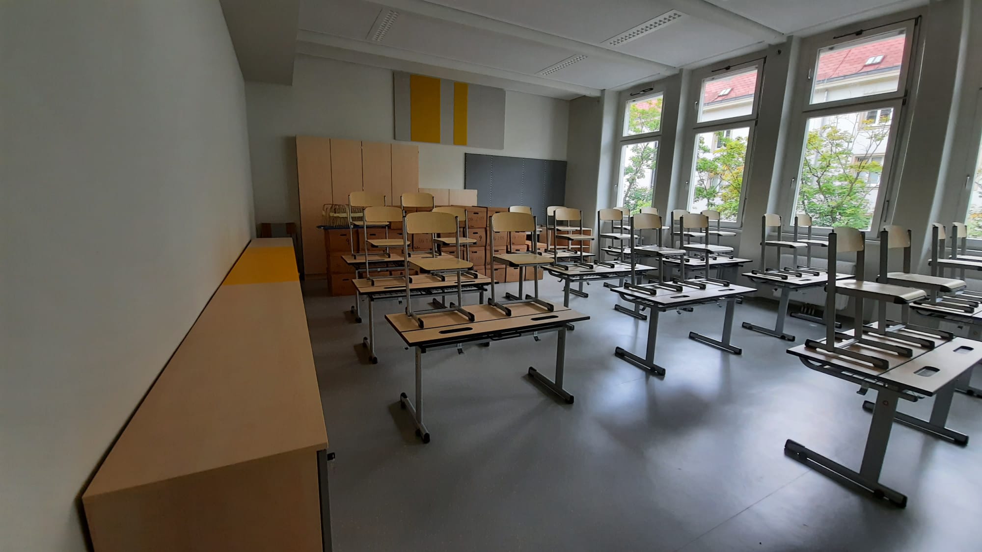 Die gesamte Schule muss in Umzugskisten gepackt werden. Insgesamt wurden ca. 1000 Kisten gepackt.