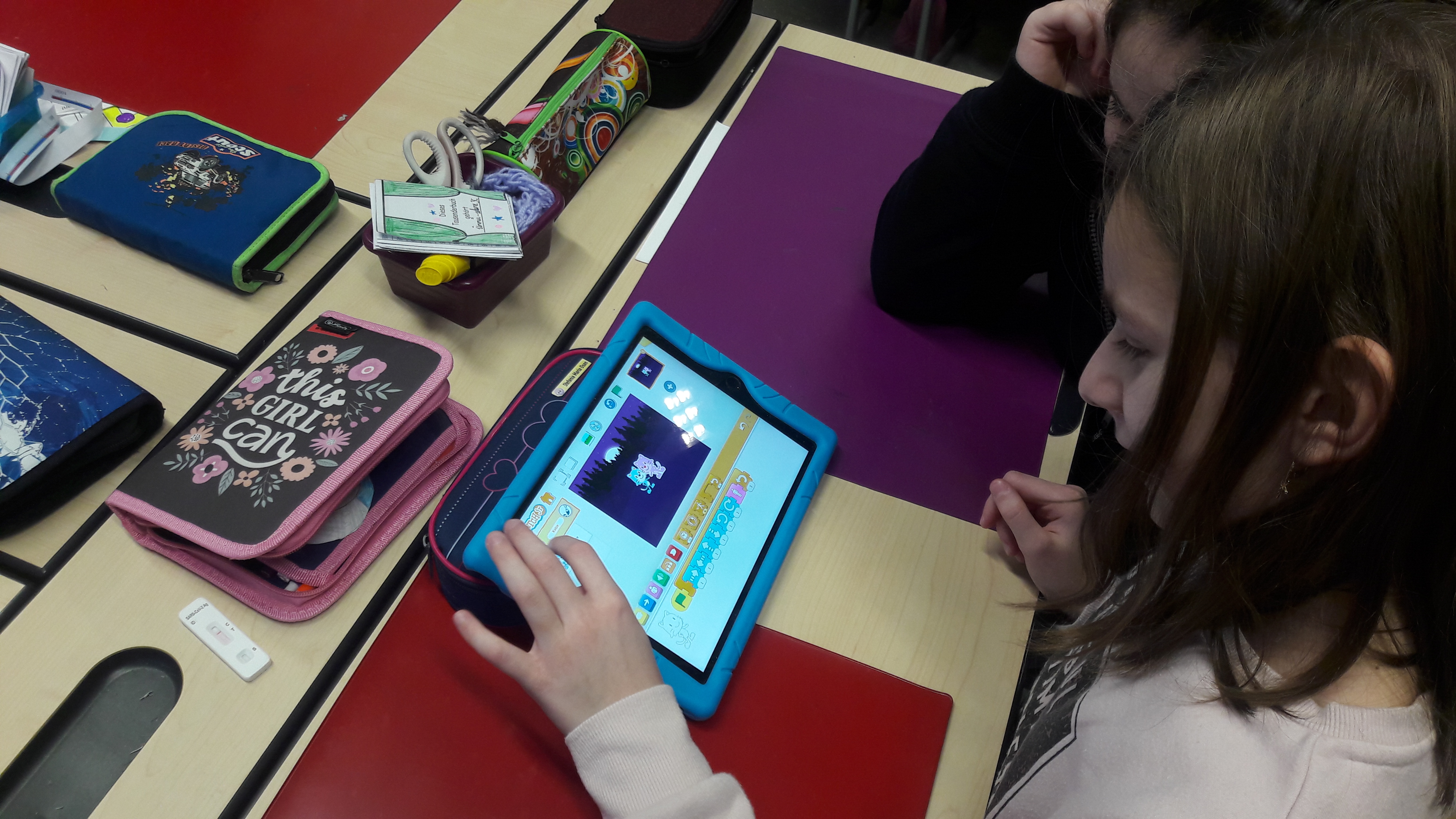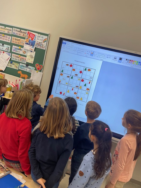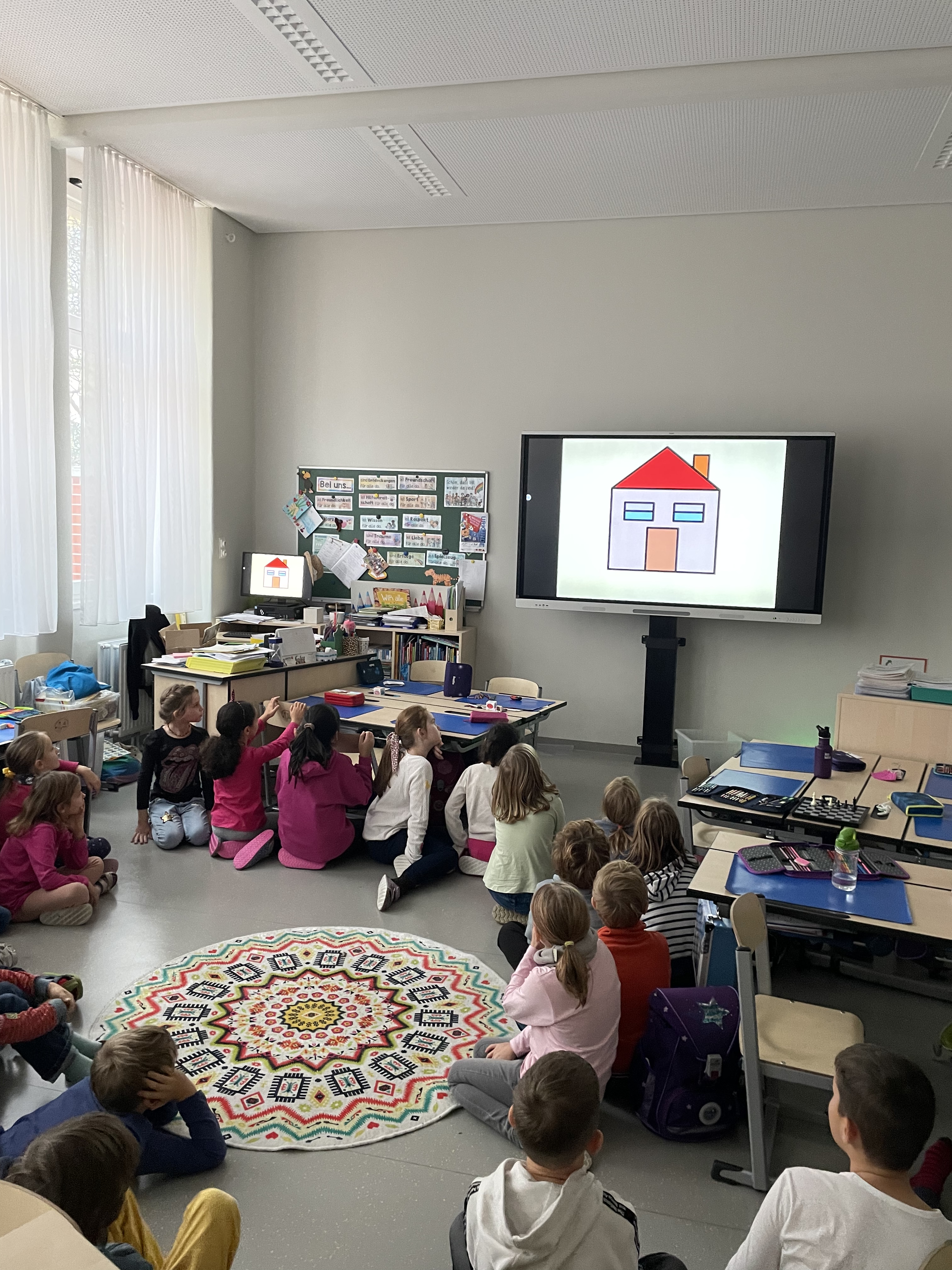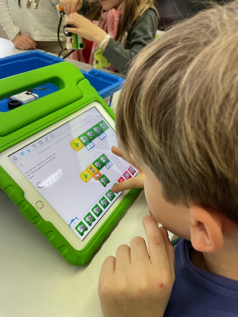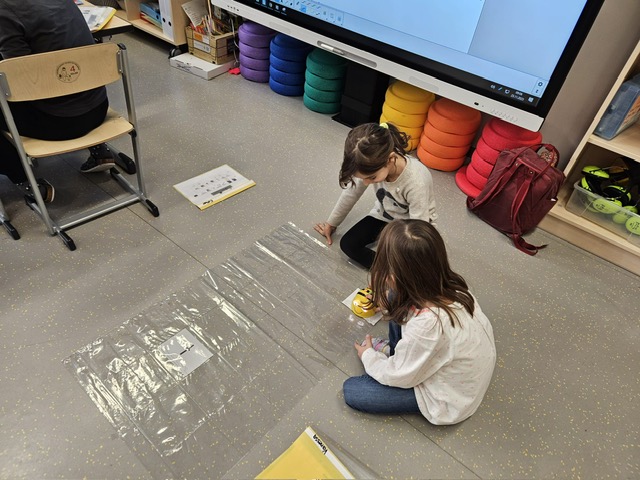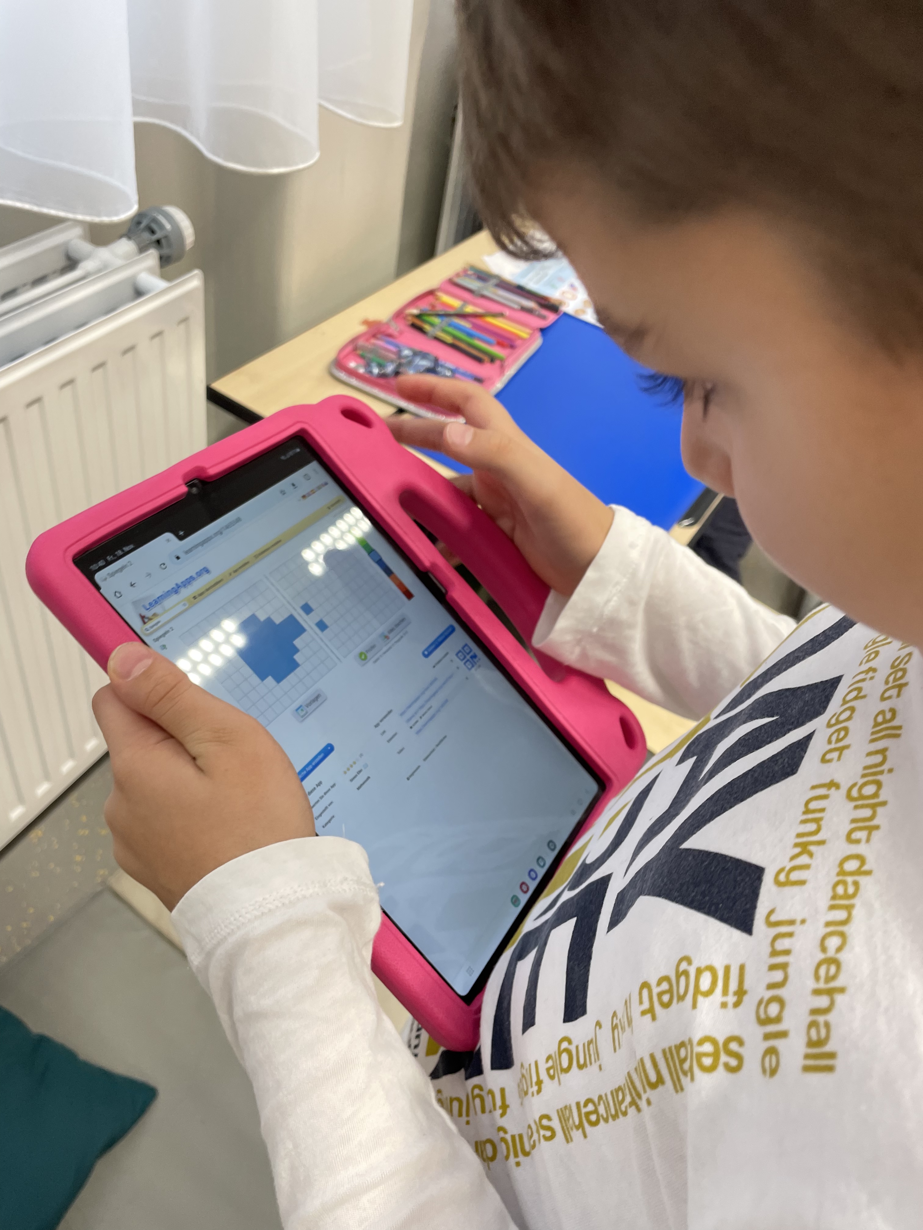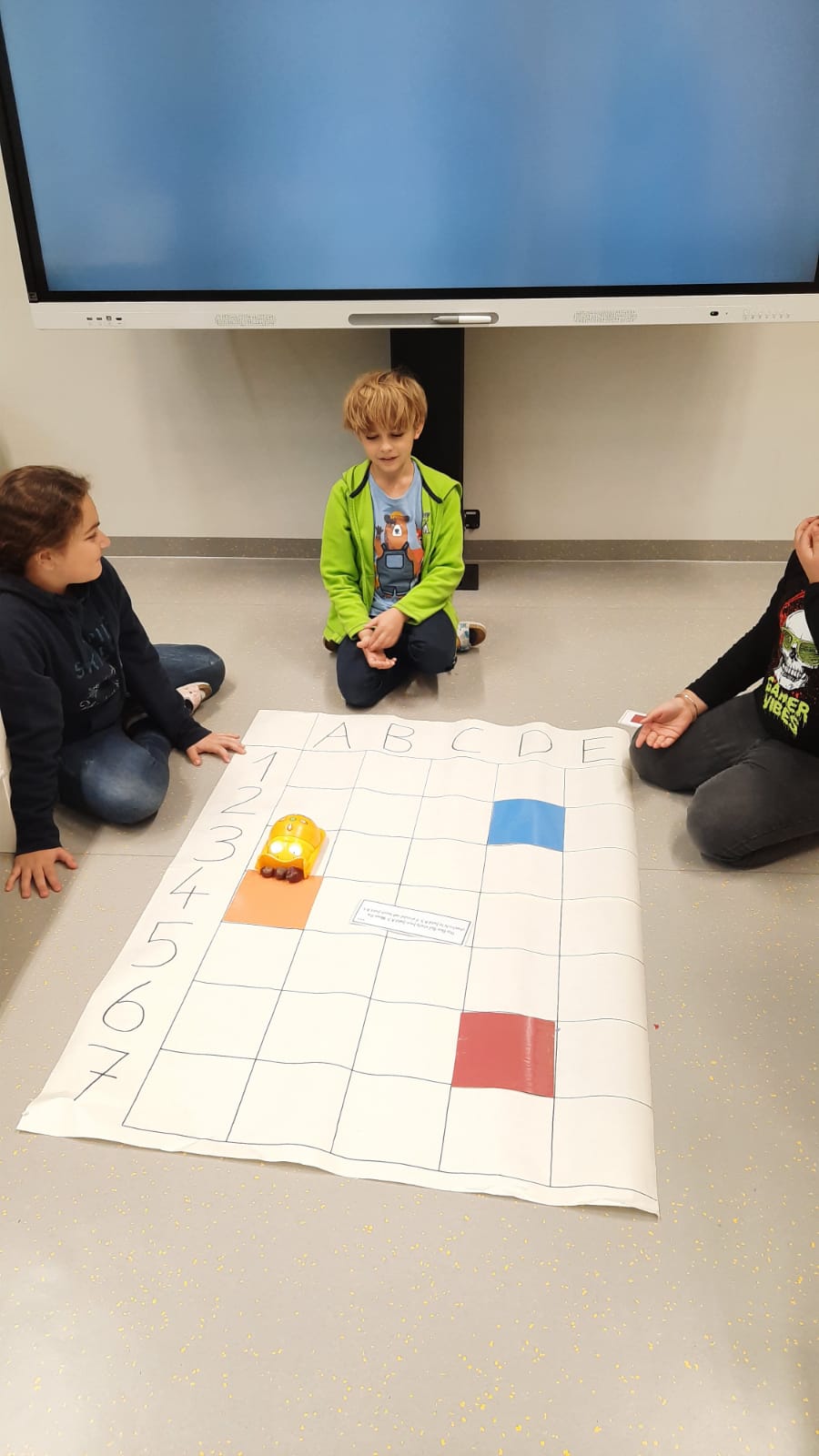 Bereits in der 1.Klasse findet digitales Lernen statt. Die Kinder der 1c programmieren die Beebots und sind dabei besonders geschickt.