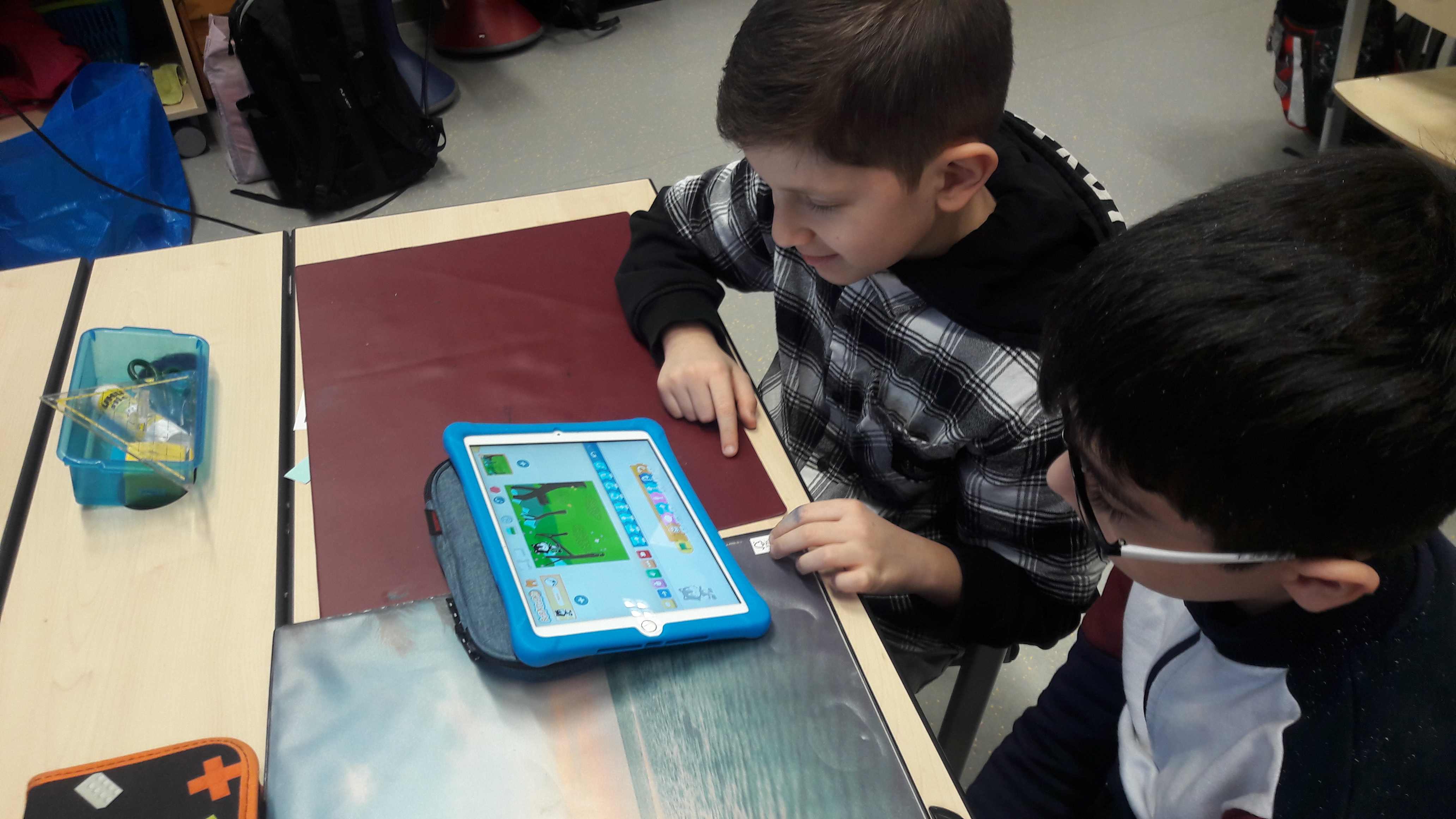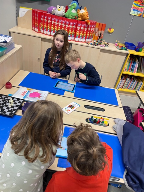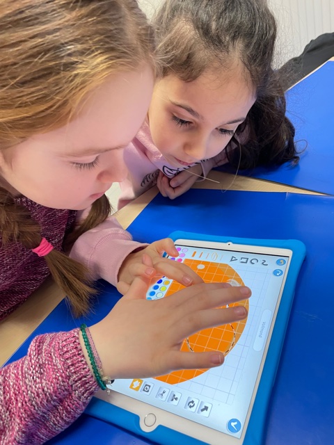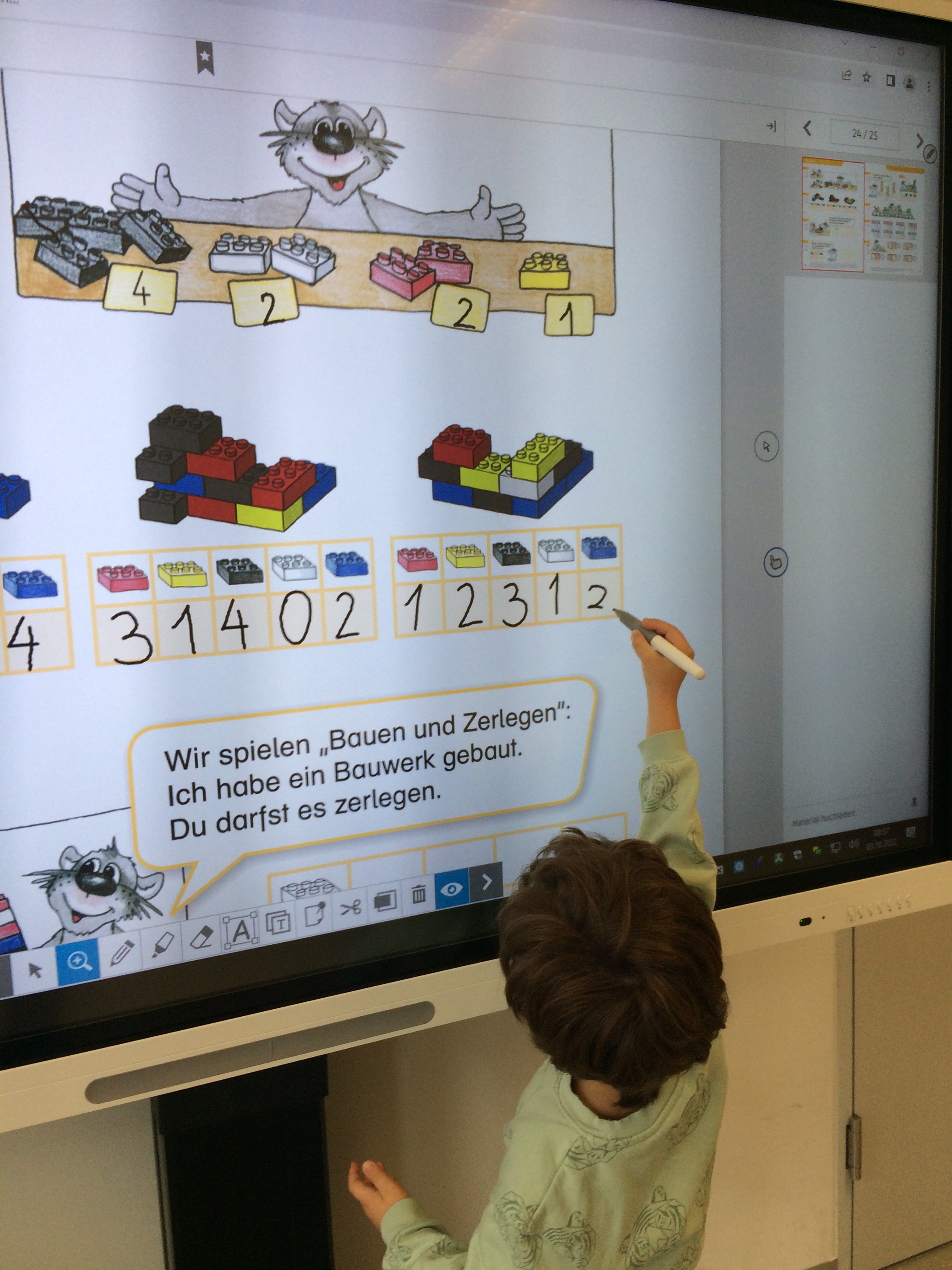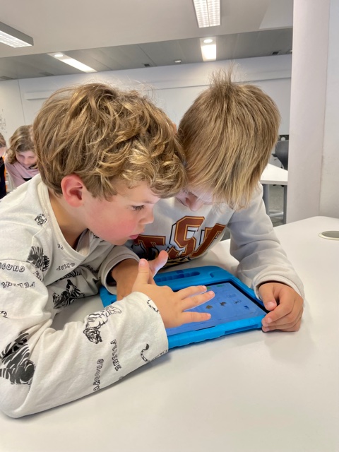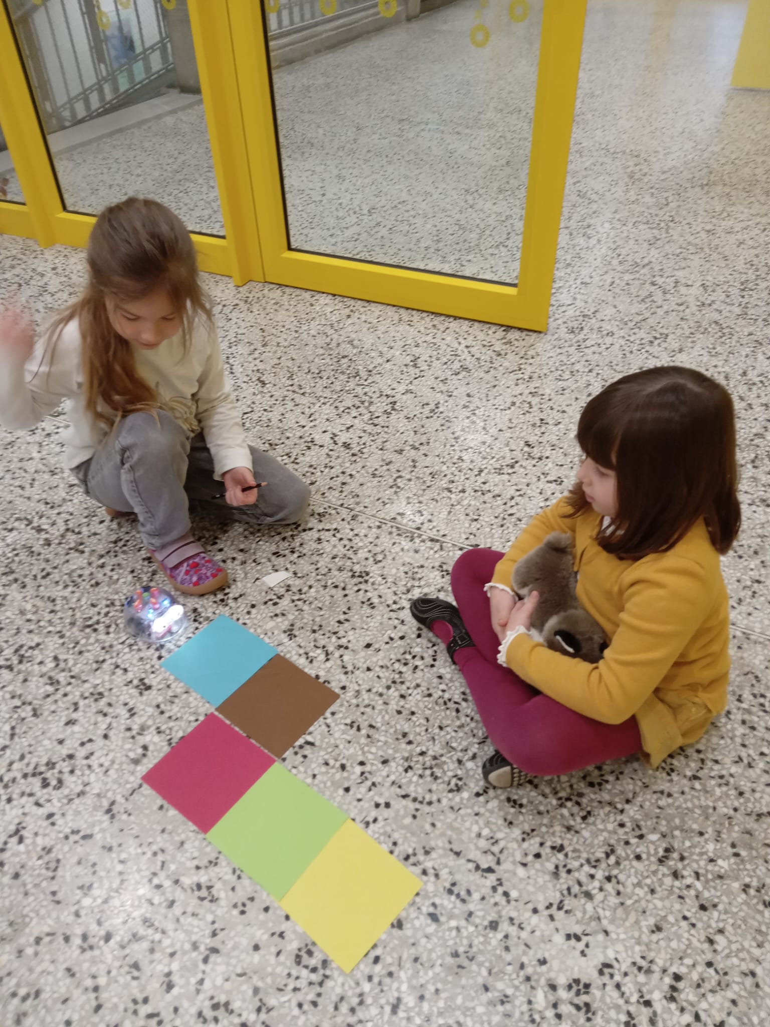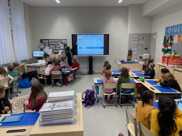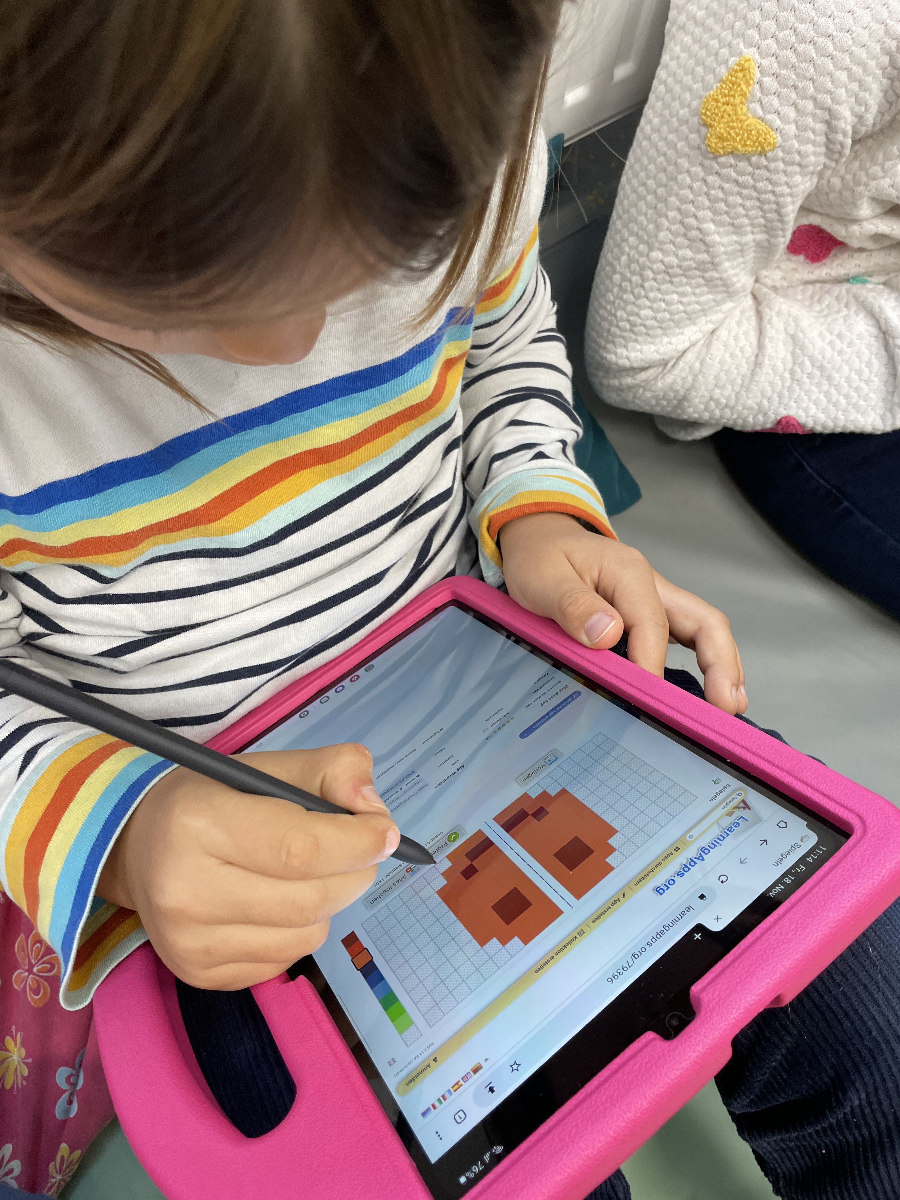 Bereits in der 1.Klasse findet digitales Lernen statt. Die Kinder der 1c programmieren die Beebots und sind dabei besonders geschickt.