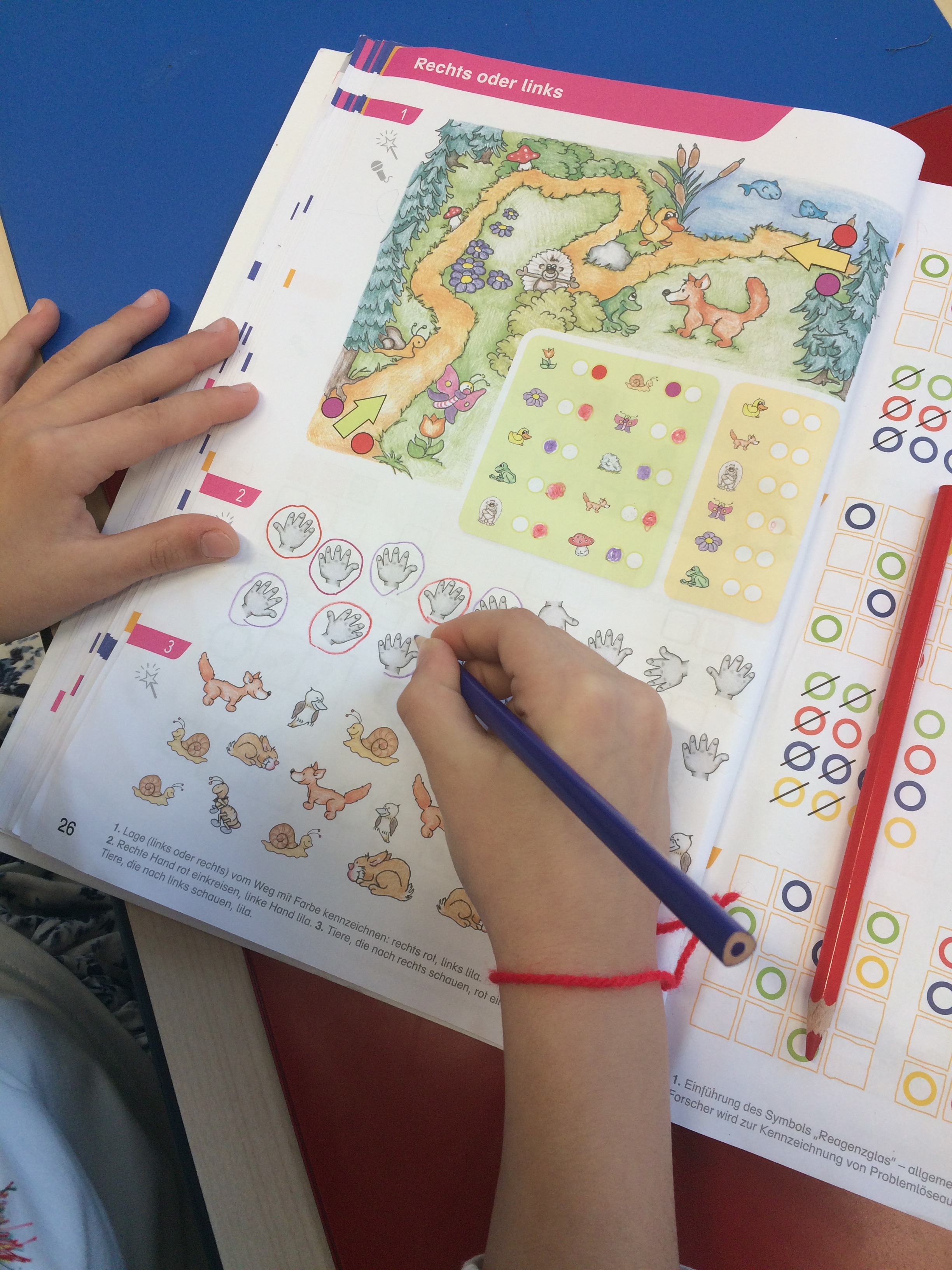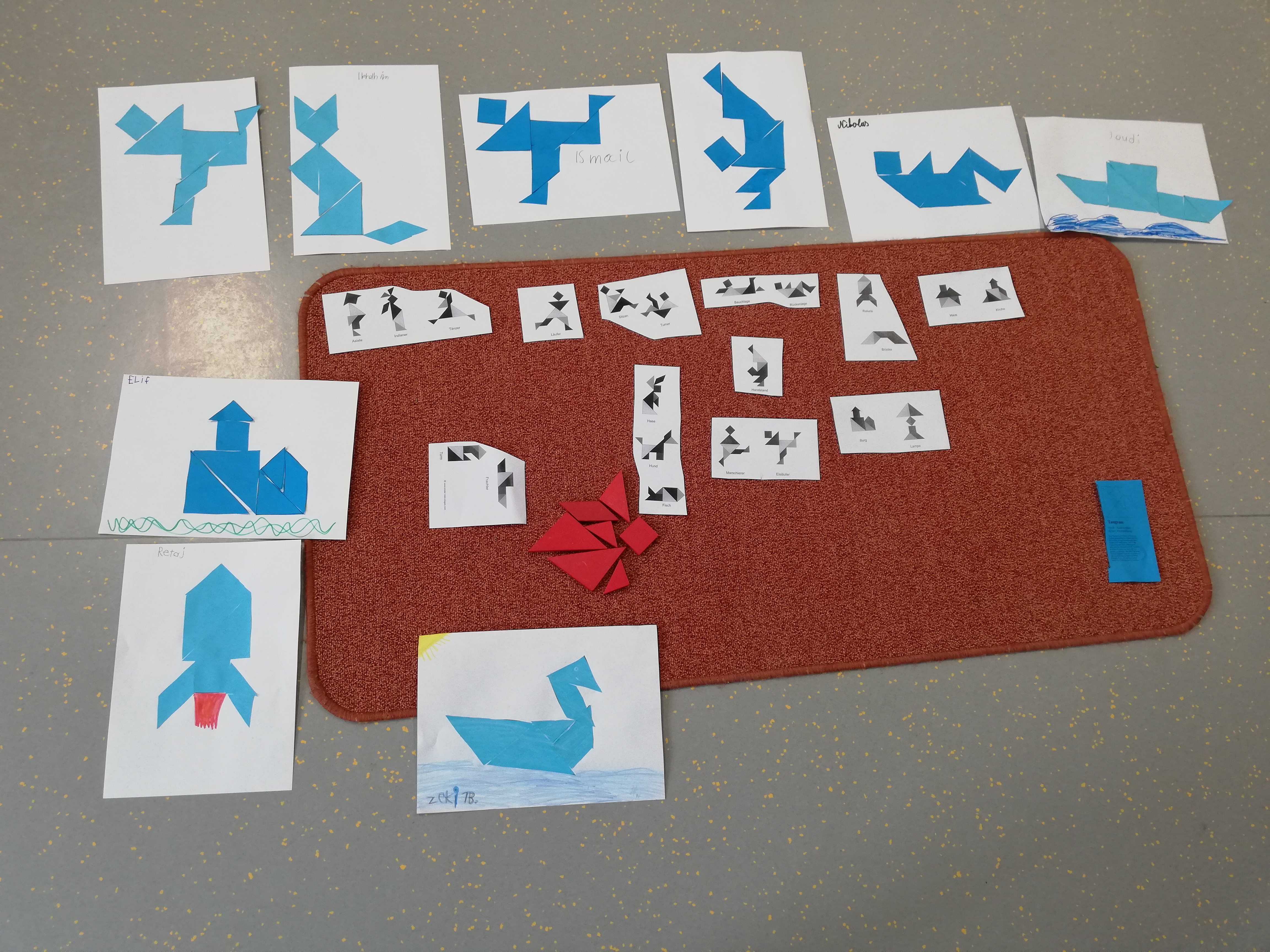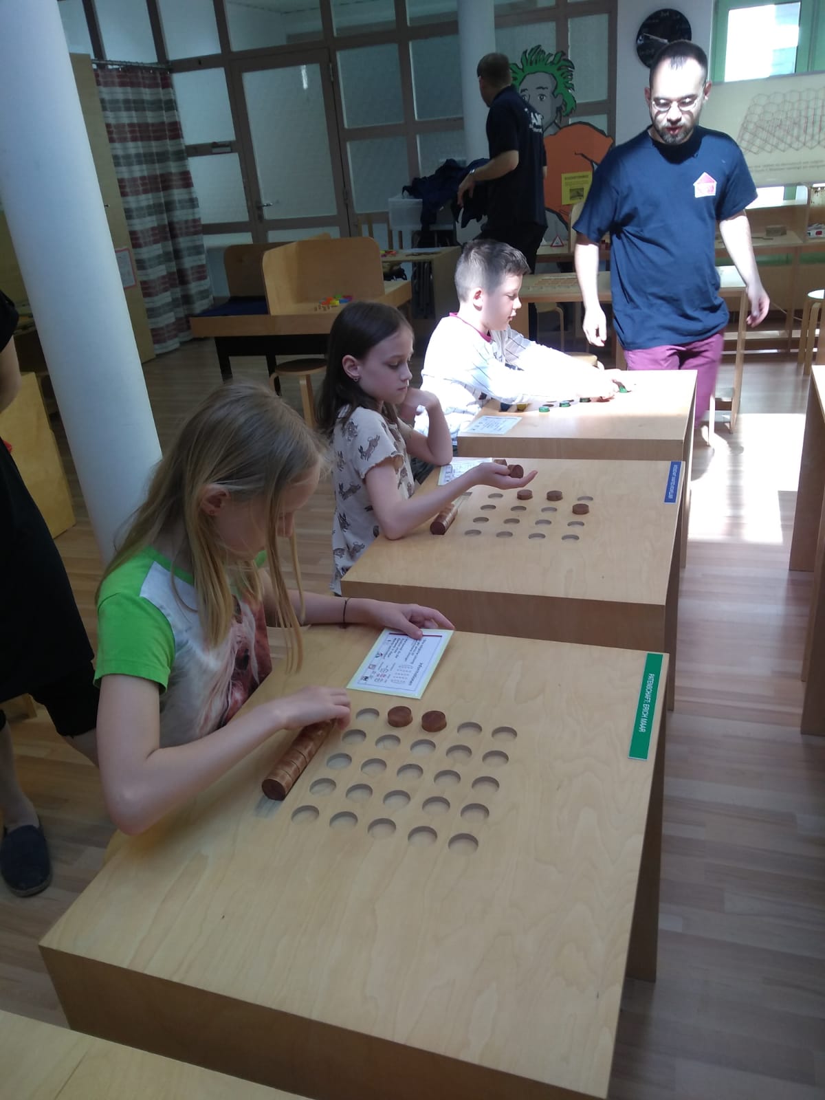 Die Kinder bekamen den Auftrag, die Plättchen (bei uns waren es Blumen) nur durch Schiebetechnik wieder an ihren richtigen Platz (in das richtige Farbfeld) zu bringen. Am Anfang war es gar nicht so leicht, doch gegen Ende der Stunde konnten viele Kinder die Aufgabe mit max. 16 Zügen lösen.