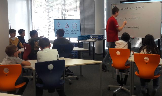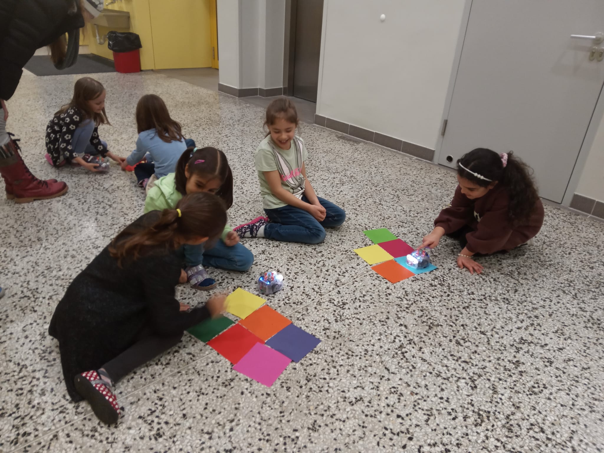 In einem Programmierworkshop lernen alle Kinder der 1a den Umgang mit Bluebots und schicken sie gezielt auf die Reise.