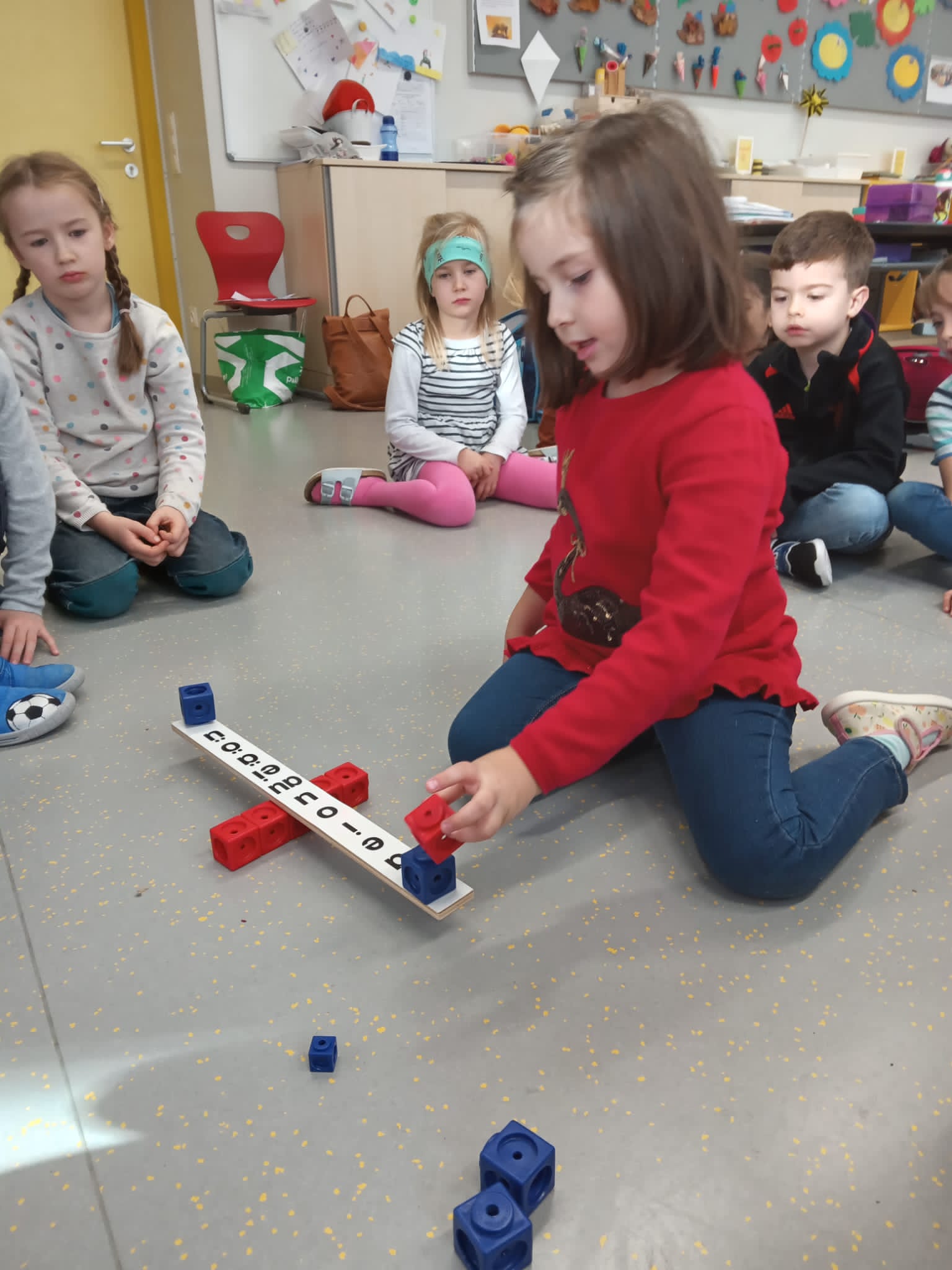 Durch spannendes Experimentieren und in vielen Diskussionen erarbeiten die begeisterten Kinder das Minus-Zeichen und den Unterschied zwischen den Begriffen „gleich“ und „nicht gleich“.