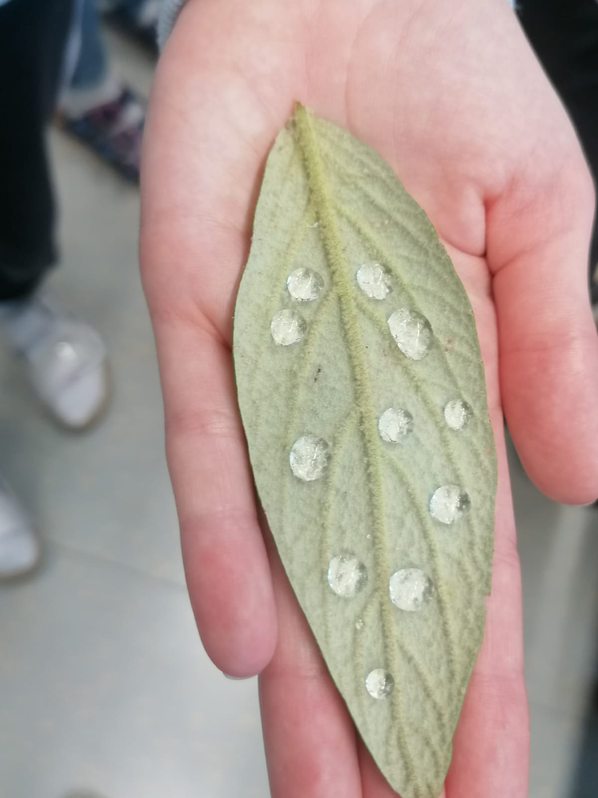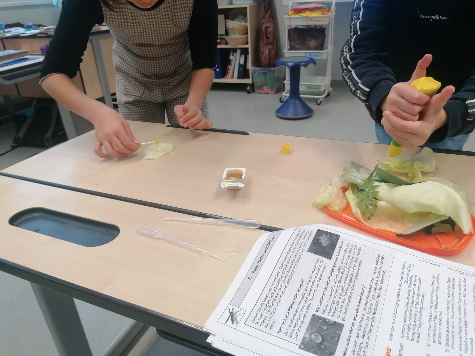 Auch der Lotuseffekt, die Selbstreinigungskraft der Blätter wurde uns anschaulich vorgestellt. Die Kinder streuten Mehl auf die Blätter und führten vor, wie diese durch nur einen Tropfen Wasser gereinigt werden konnten. Noch mehr bestaunt wurde der darauffolgende Versuch in dem sich sogar Uhu und Honig mühelos durch Wasser vom Blatt entfernen ließen. Diesem Effekt verdanken wir, dass unsere Regenmäntel uns trocken halten.