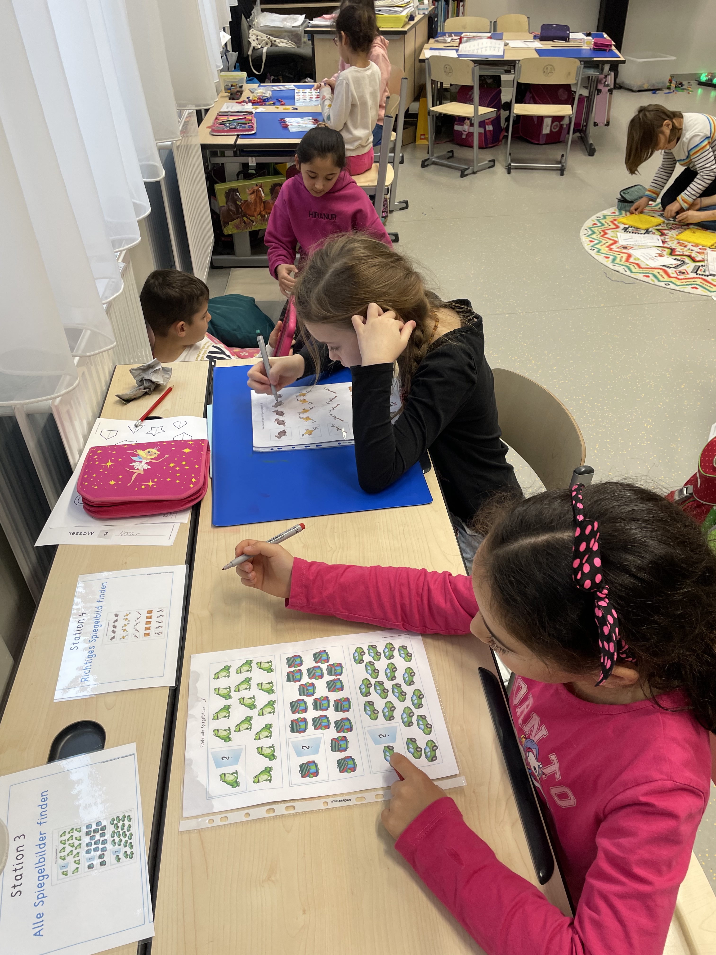 Das tolle Kinderbuch „Manche sind anders…“ führte die SchülerInnen an das Thema Symmetrie heran. Danach konnte an 13 Stationen zu diesem spannenden Thema gearbeitet werden. Unter anderem kamen unsere Tablets, Geobretter, Malkästen und viele Spiegel zum Einsatz. Die Kinder der 2b waren mit Feuereifer dabei.