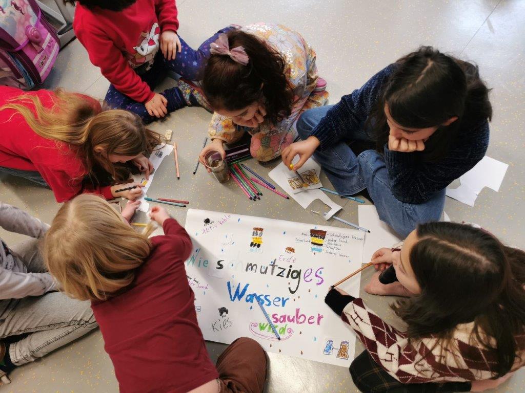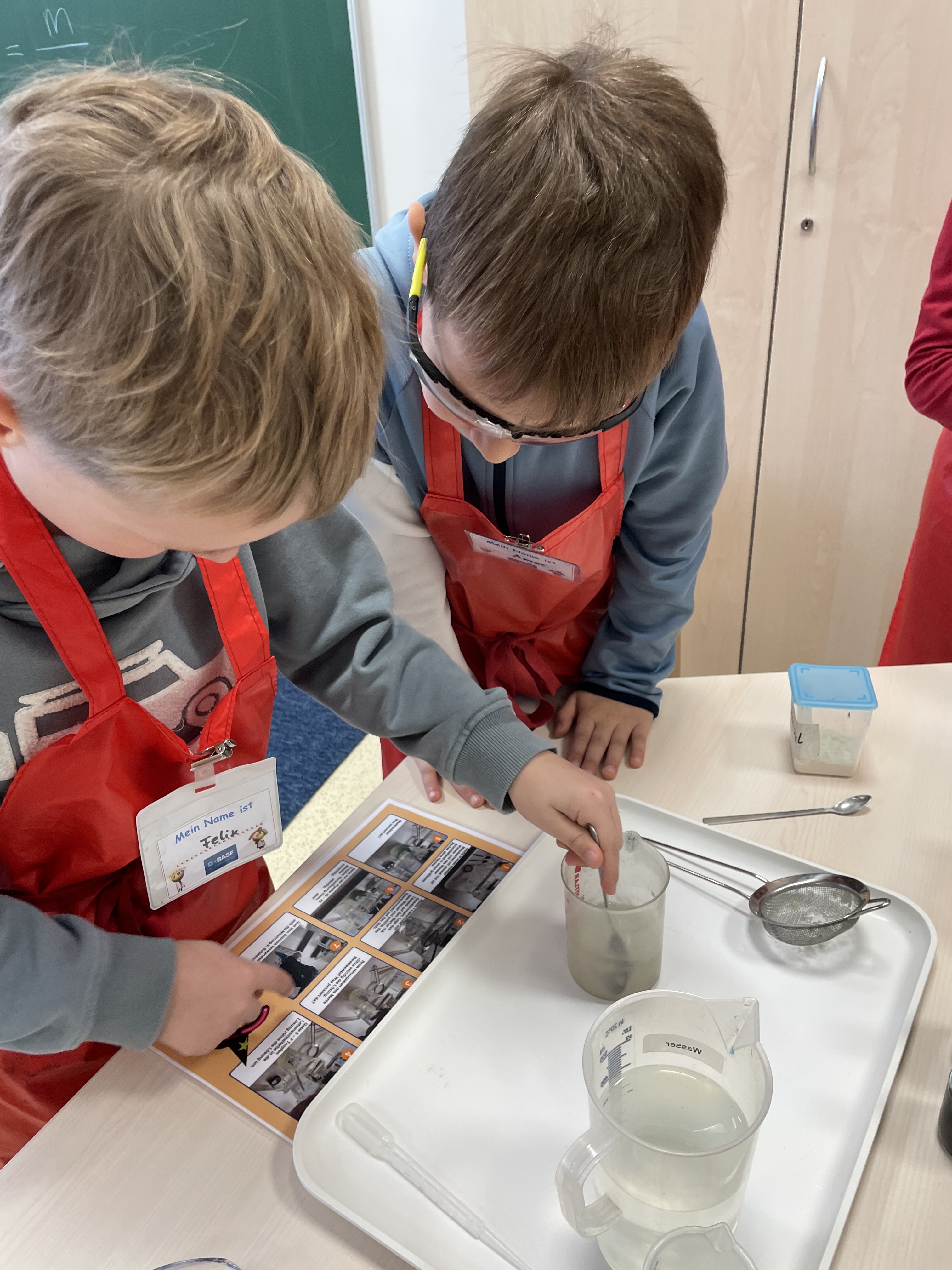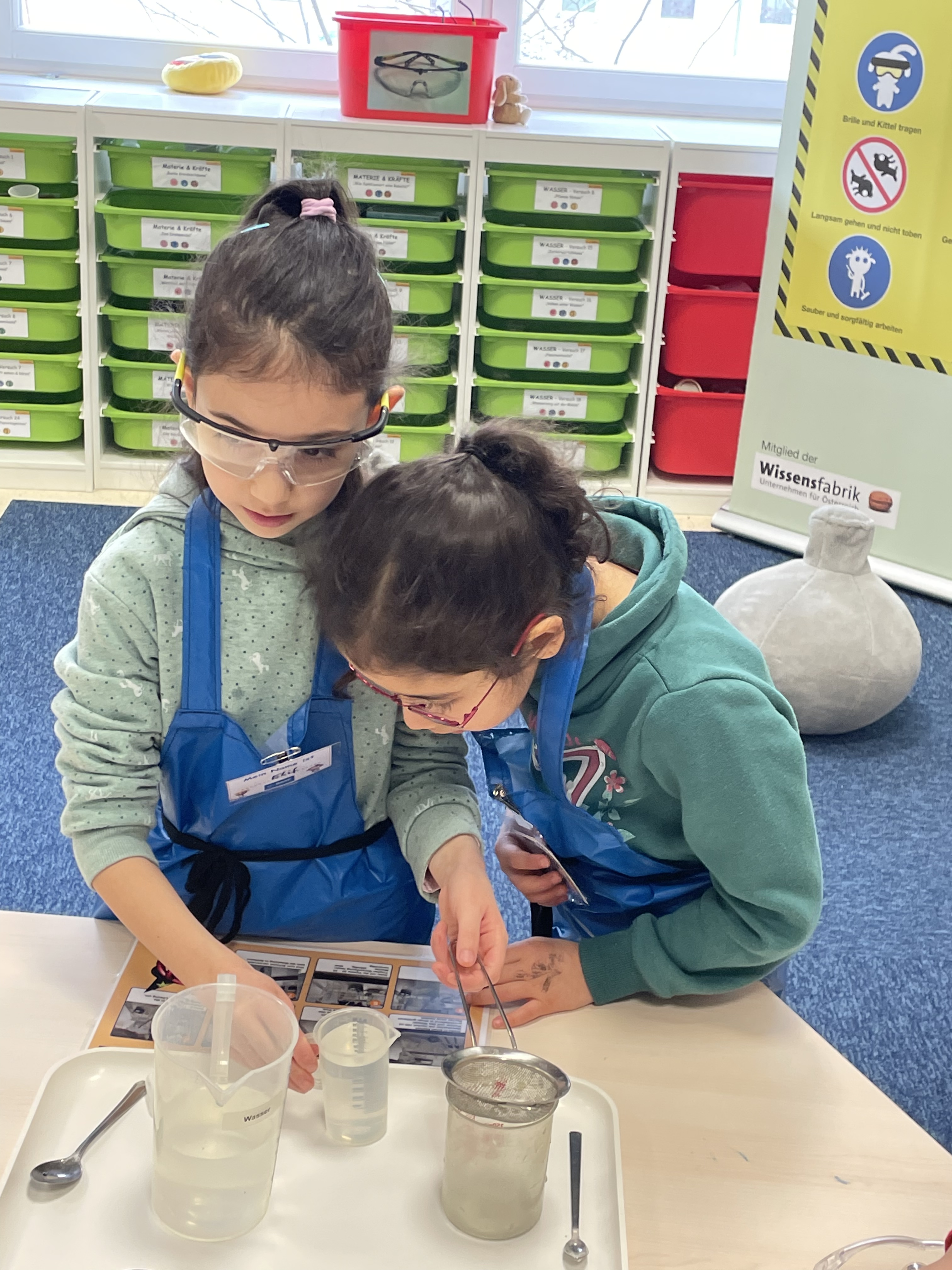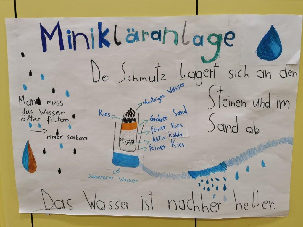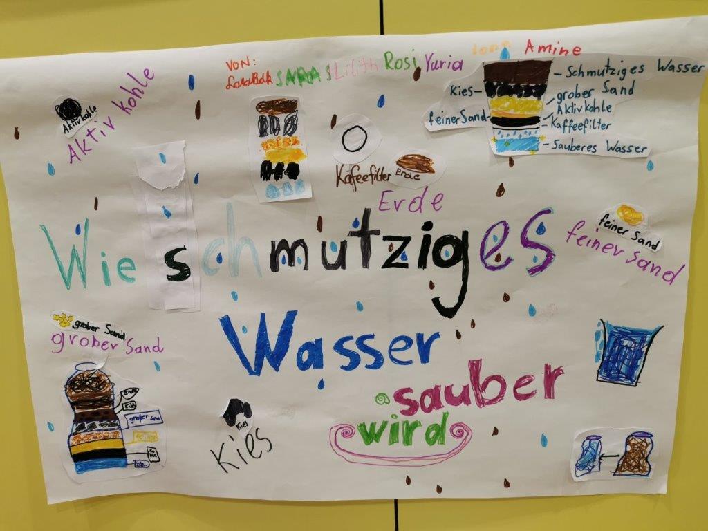 Die Kinder bekamen Materialien zur Verfügung gestellt und mussten mithilfe dieser versuchen, aus schmutzigem Wasser wieder saubereres Wasser zu. erhalten. Mit viel Ehrgeiz stürzten sich die Kinder in ihre Aufgaben hinein und hatten viel Spaß beim Entdecken und Erforschen der verschiedenen Möglichkeiten. Zum Abschluss wurden alle Schritte und Ergebnisse auf einem Plakat festgehalten und den anderen präsentiert.