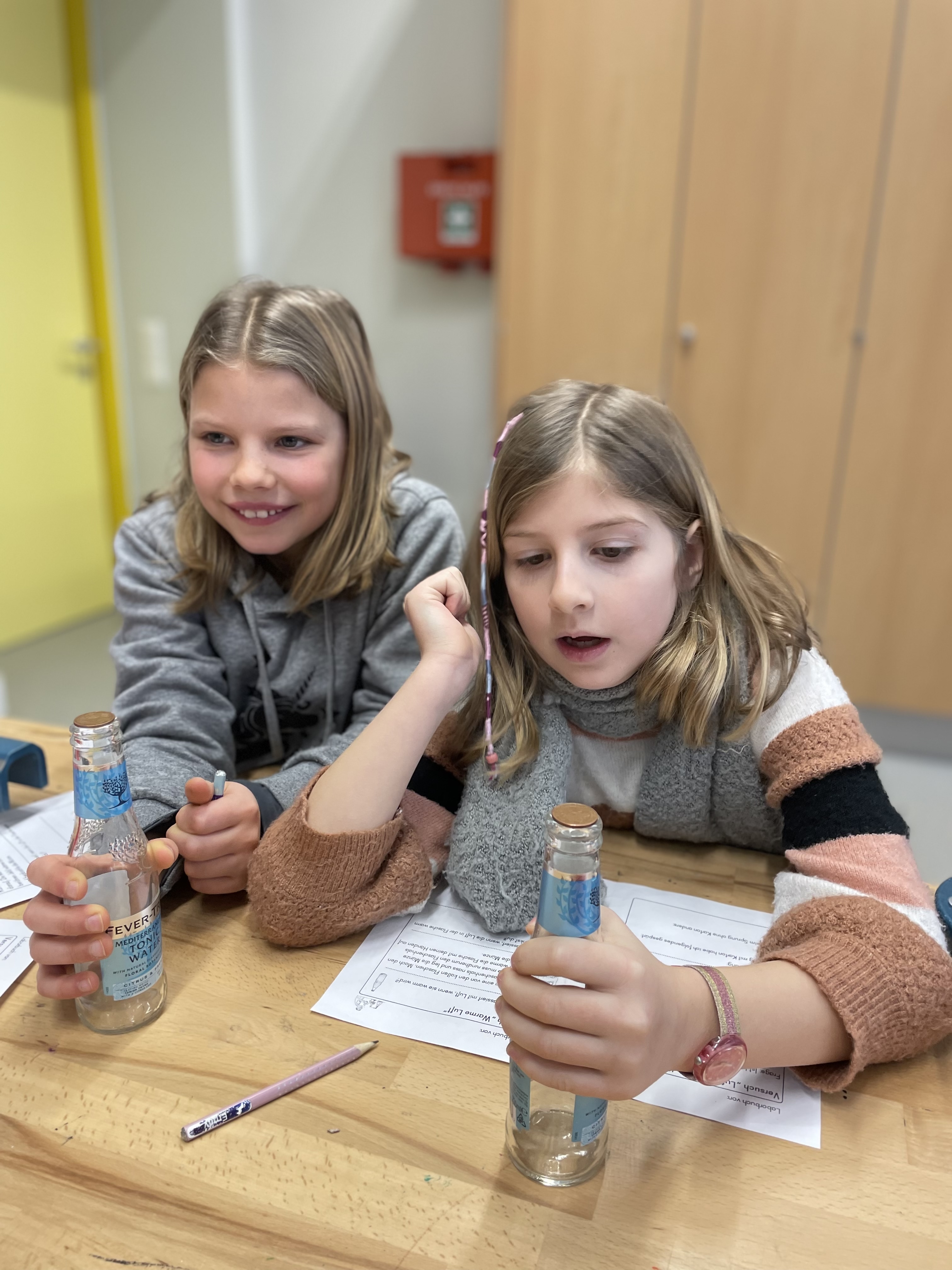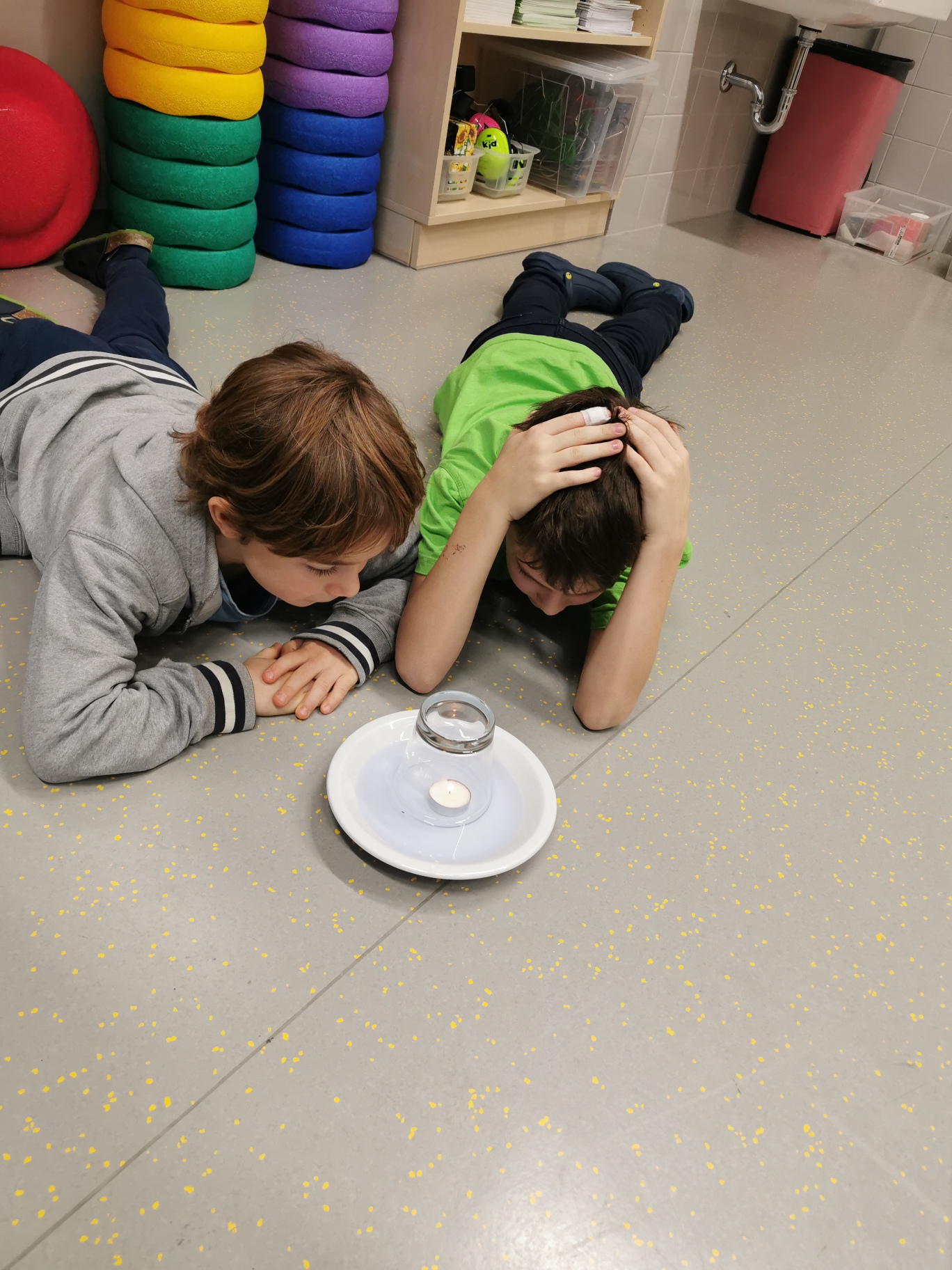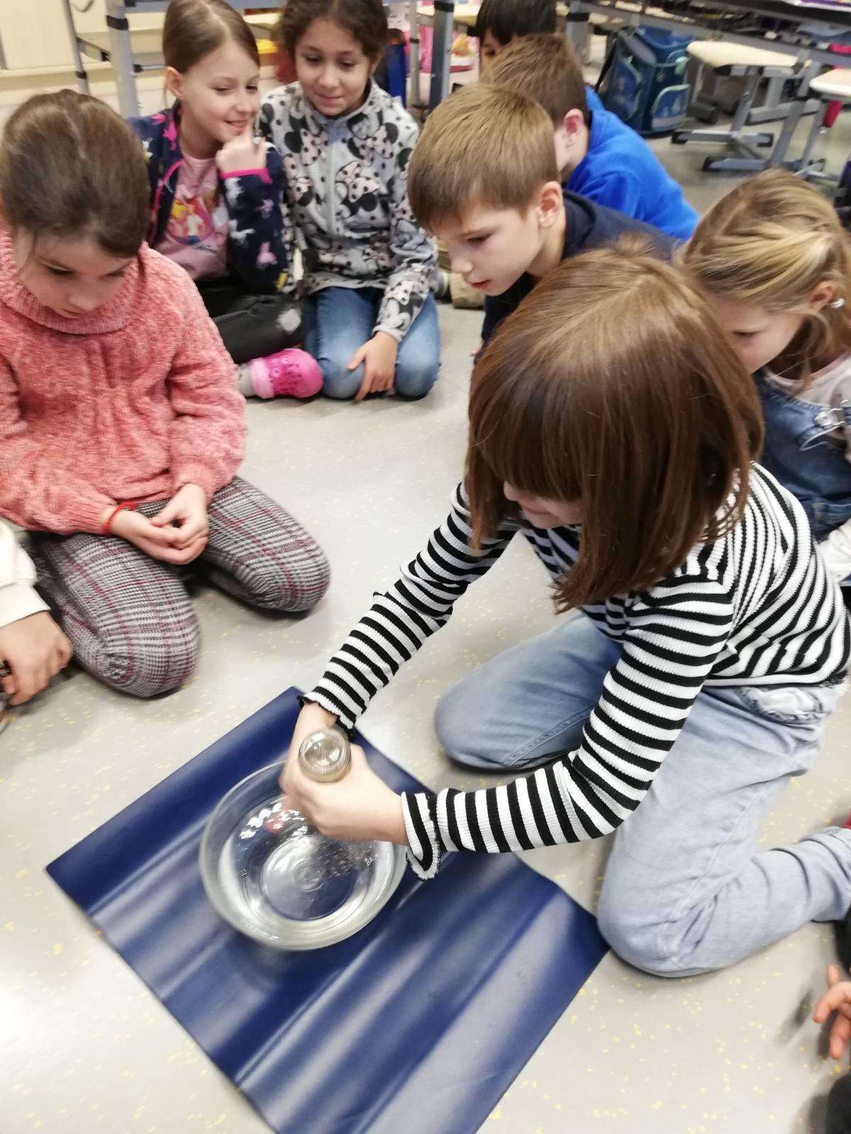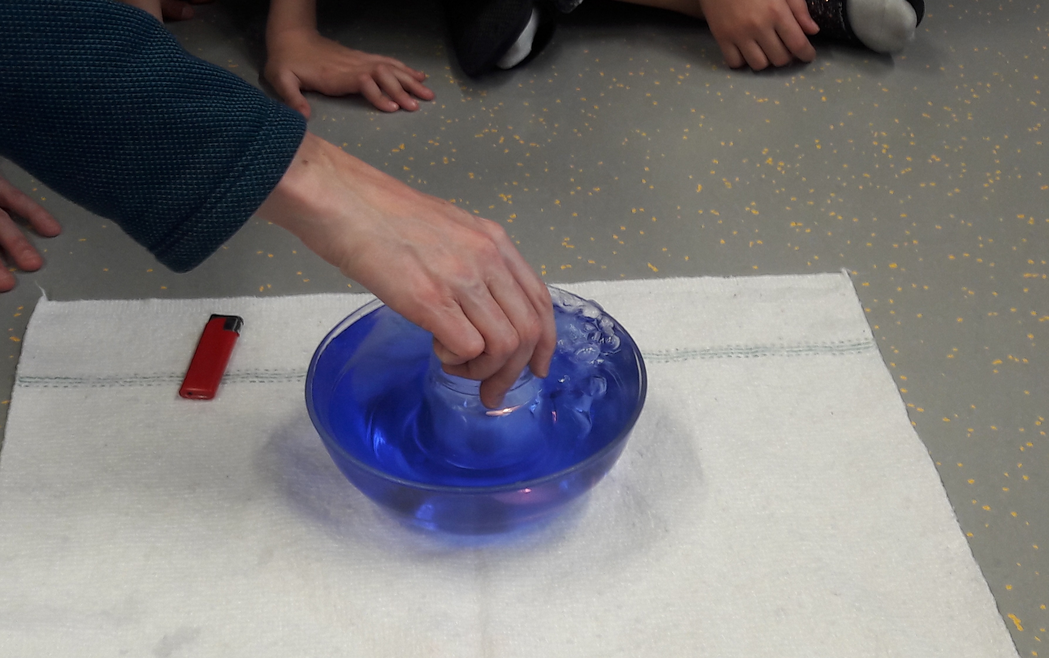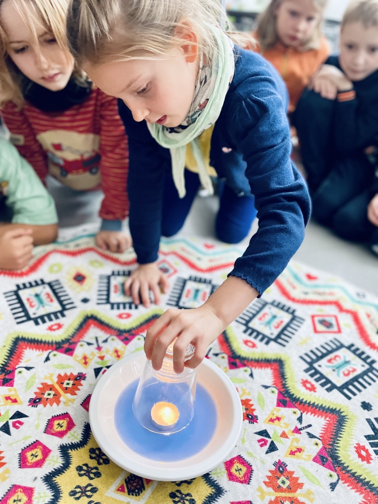 Die Kinder konnten dabei feststellen, dass das entstehende Kohlenstoffdioxid den Sauerstoff verdrängt, den die Flamme zum Brennen benötigt. So zeigte sich auf anschauliche Weise, wie ein unsichtbarer Feuerlöscher funktioniert!