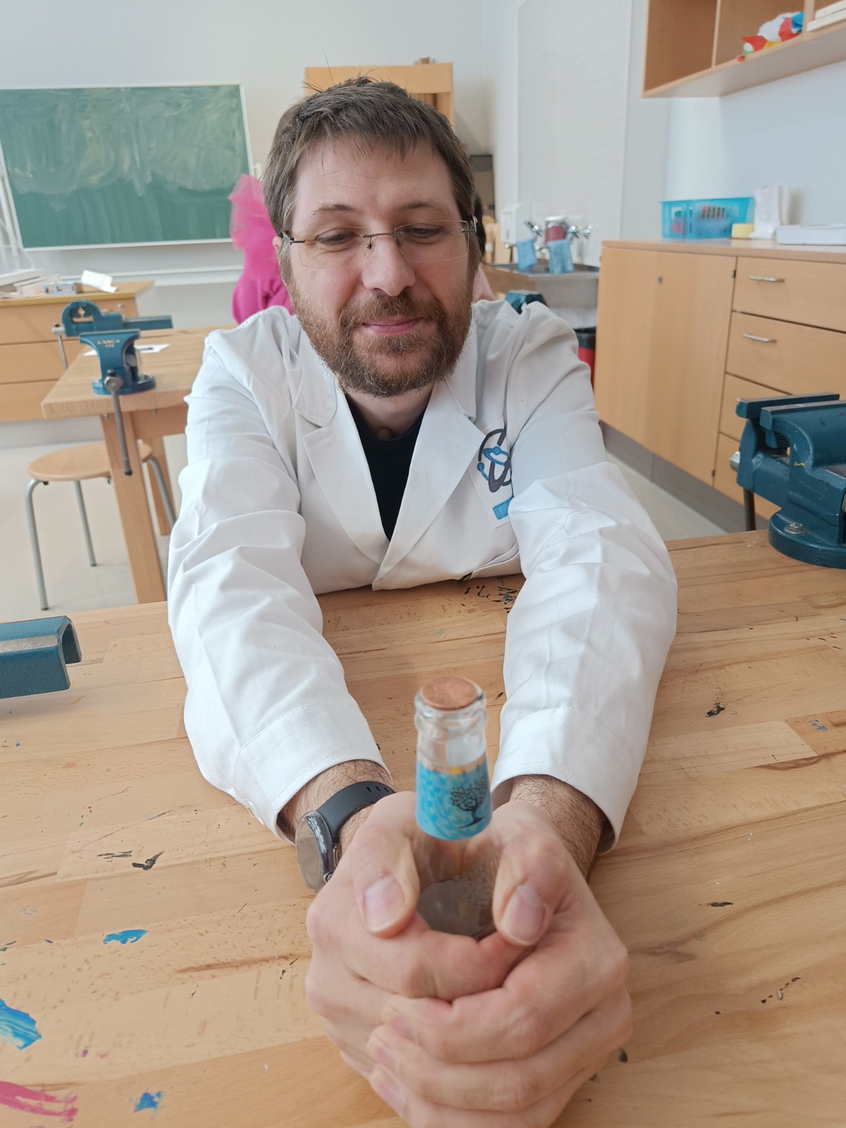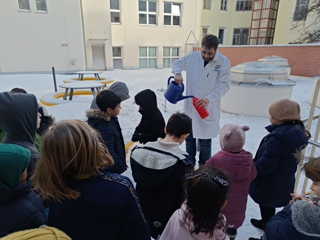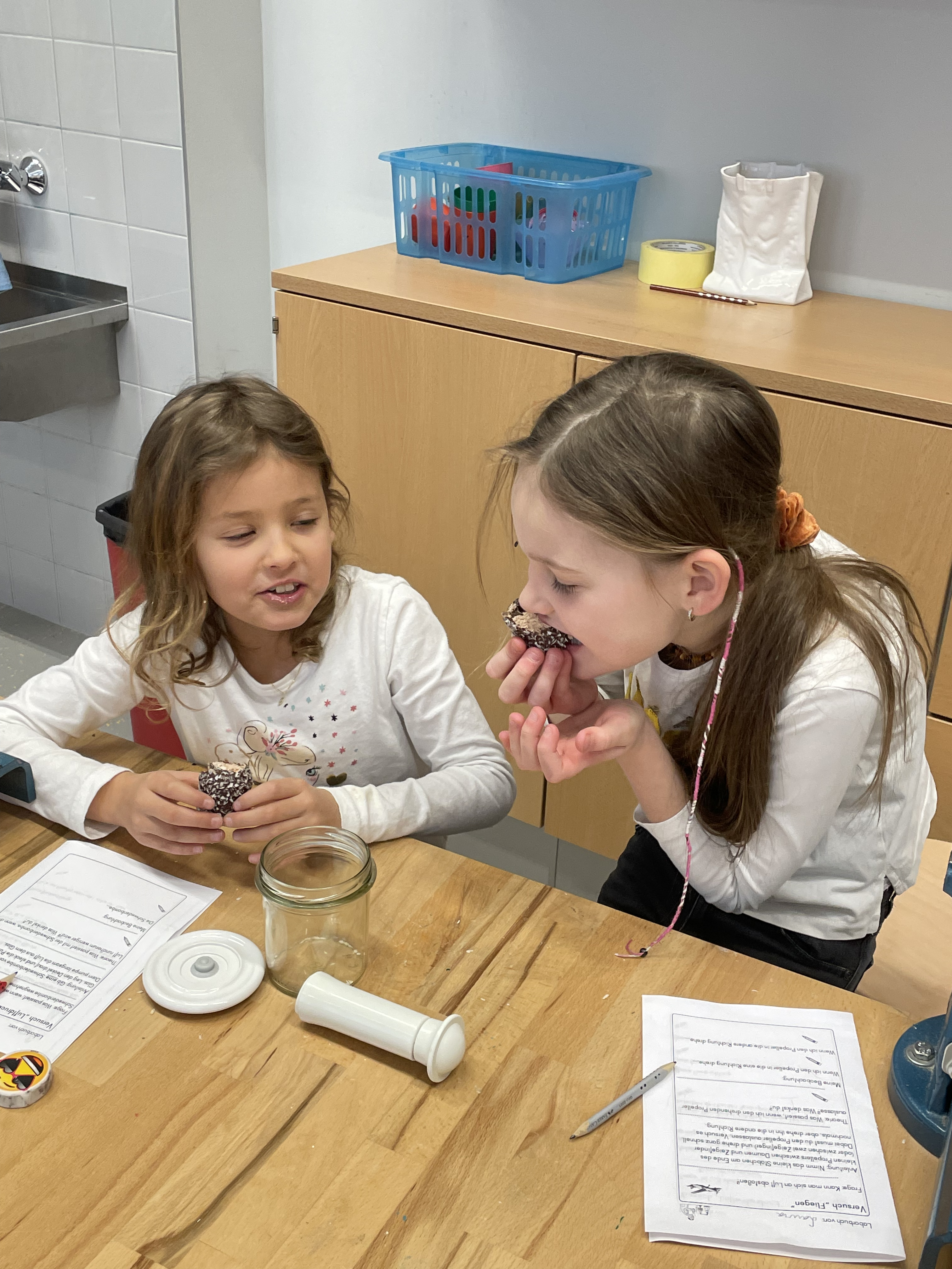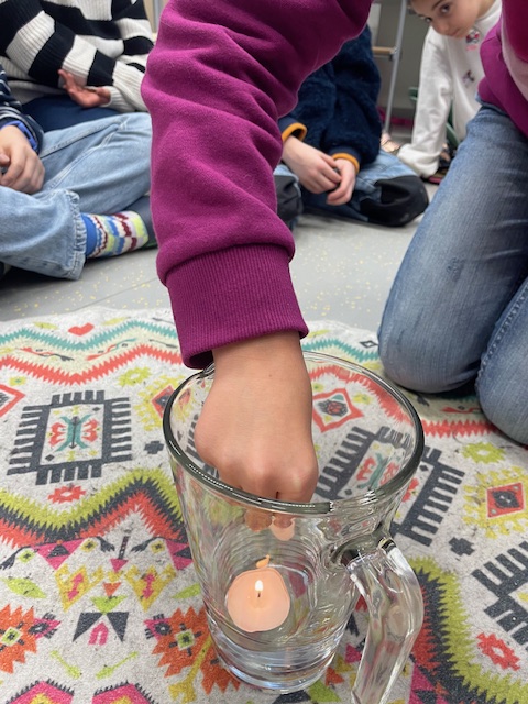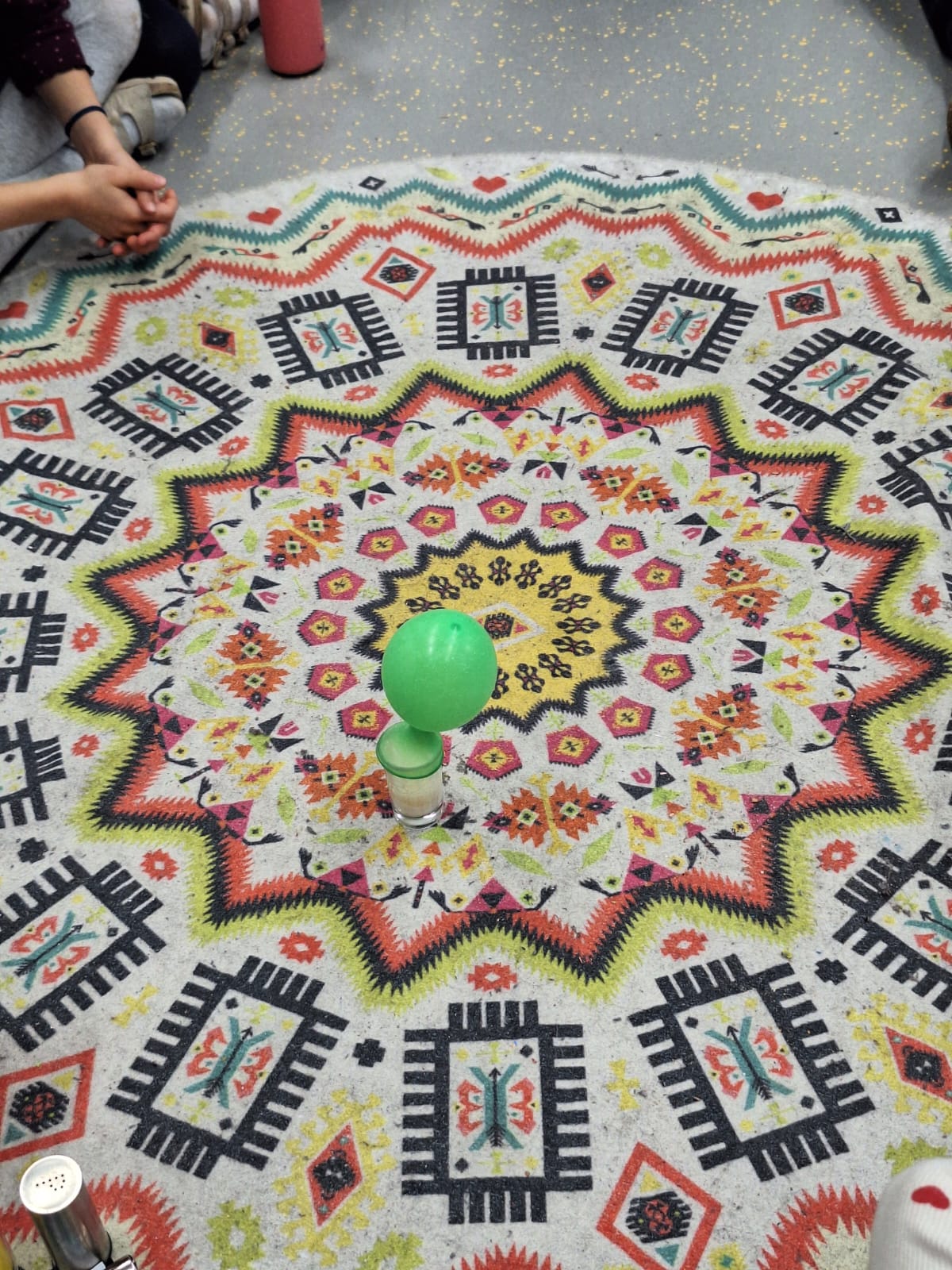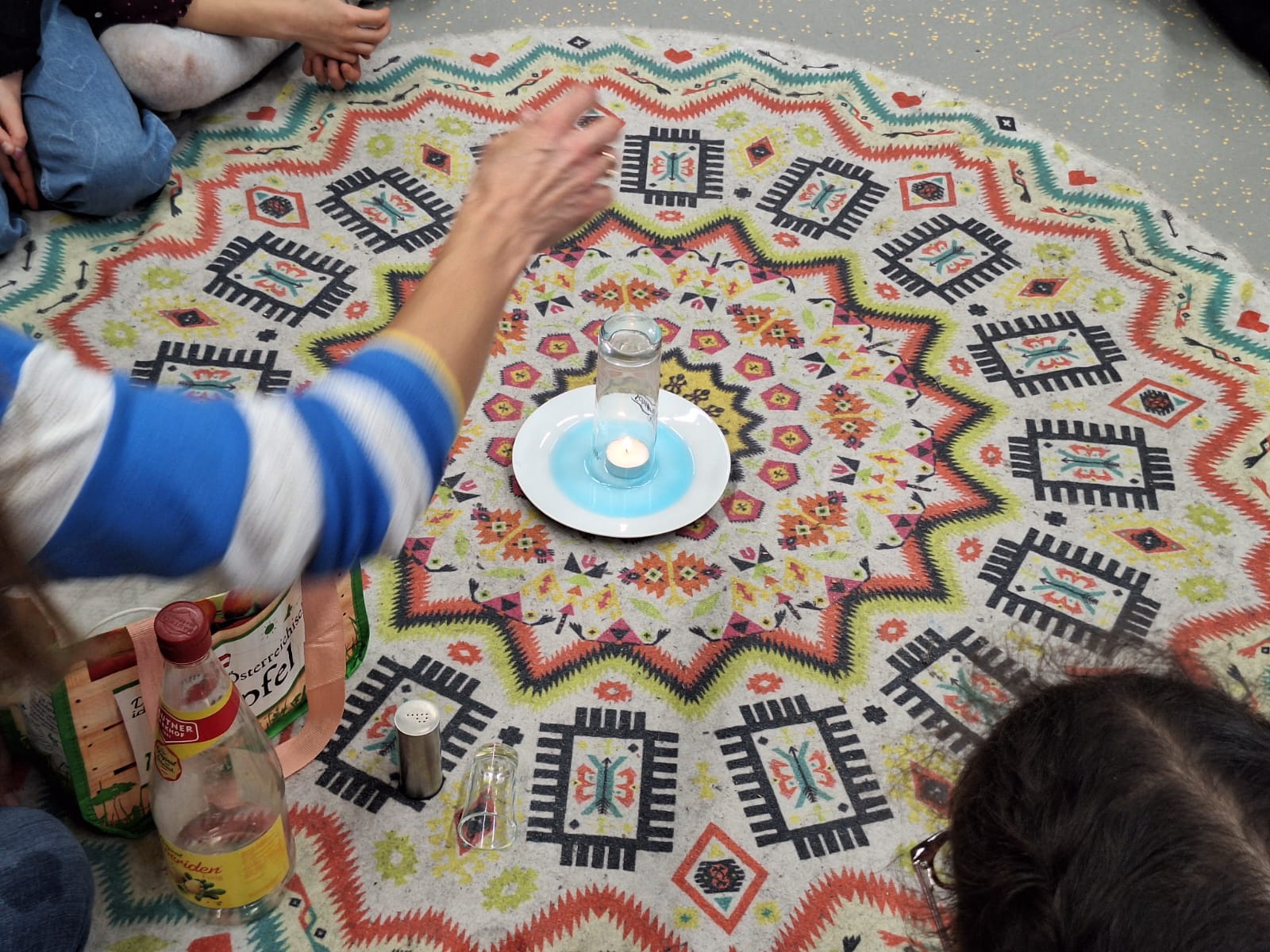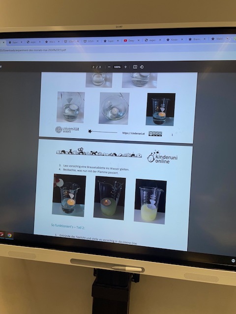 Die Kinder konnten dabei feststellen, dass das entstehende Kohlenstoffdioxid den Sauerstoff verdrängt, den die Flamme zum Brennen benötigt. So zeigte sich auf anschauliche Weise, wie ein unsichtbarer Feuerlöscher funktioniert!