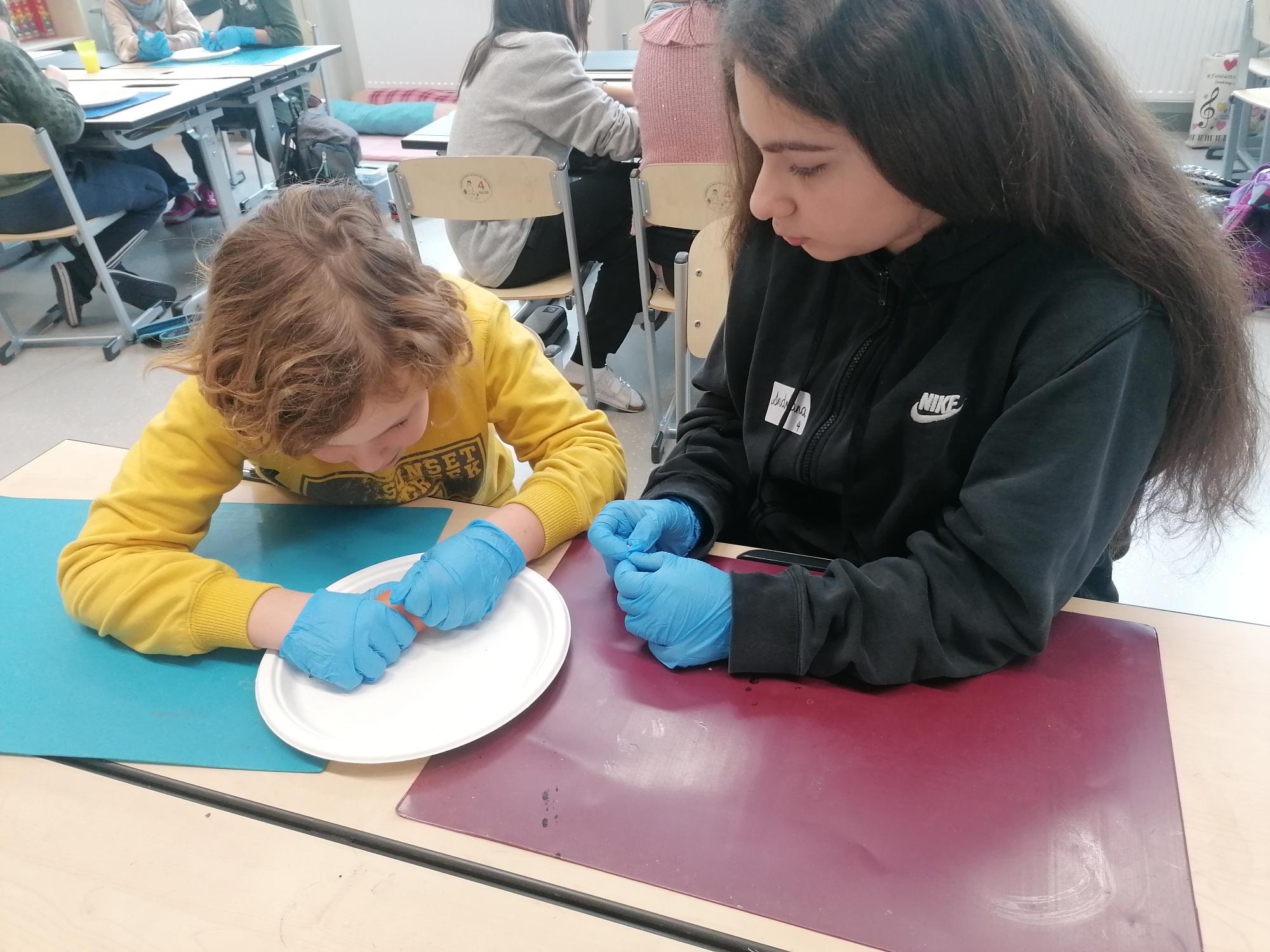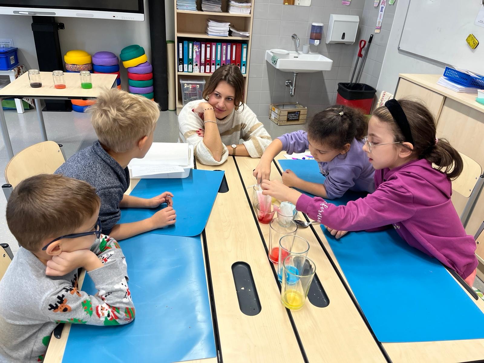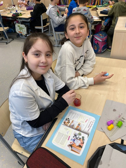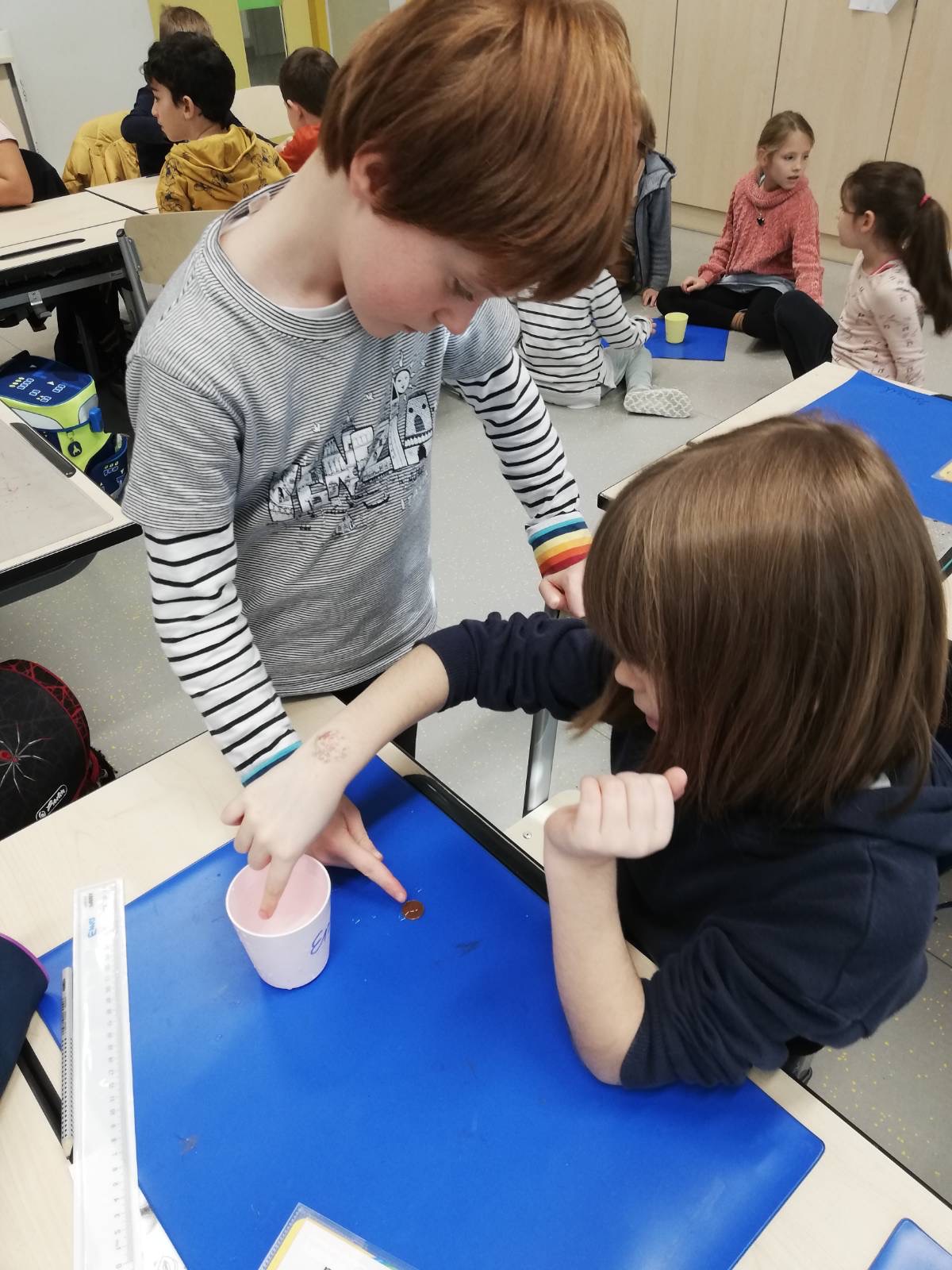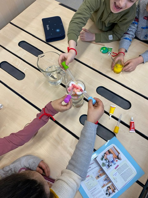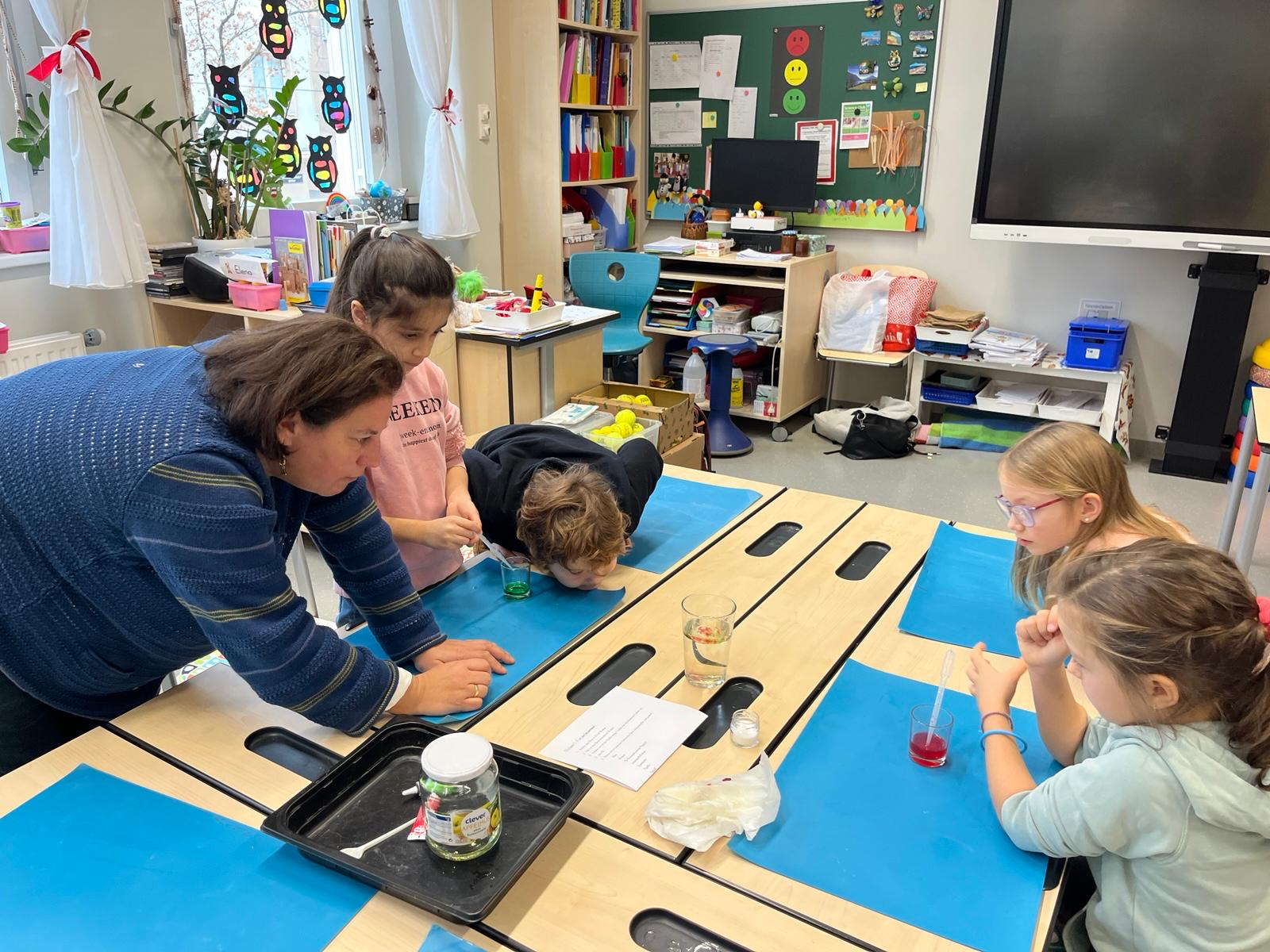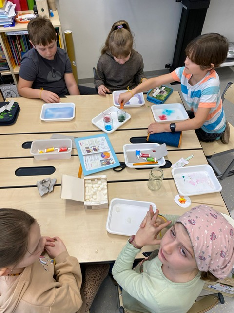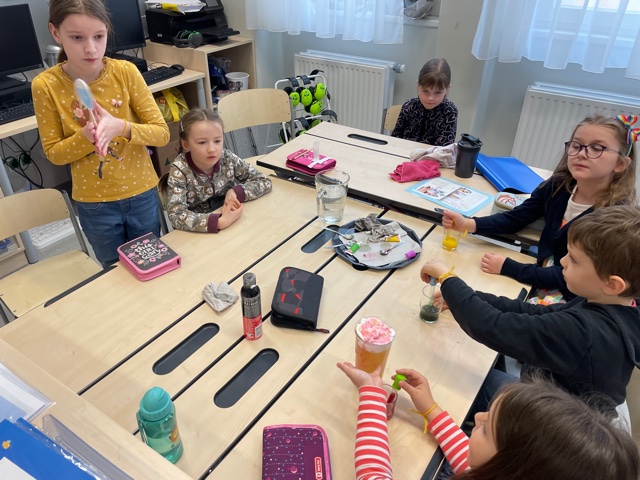 Unsere StudentInnen haben uns zum Thema: „Wir experimentieren mit Farben“ 4 Stationen vorbereitet. Die Klasse wurde in kleine Gruppen aufgeteilt, an jedem Tisch wurde ein Experiment durchgeführt. So hatten alle die Möglichkeit die Experimente selber auszuprobieren.