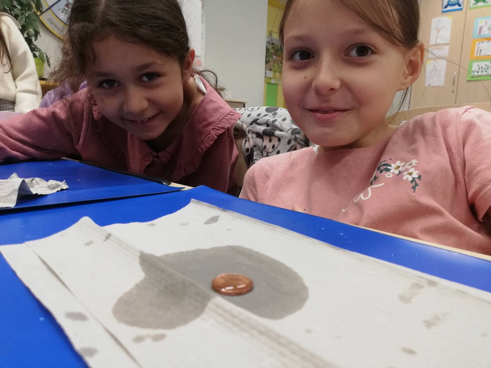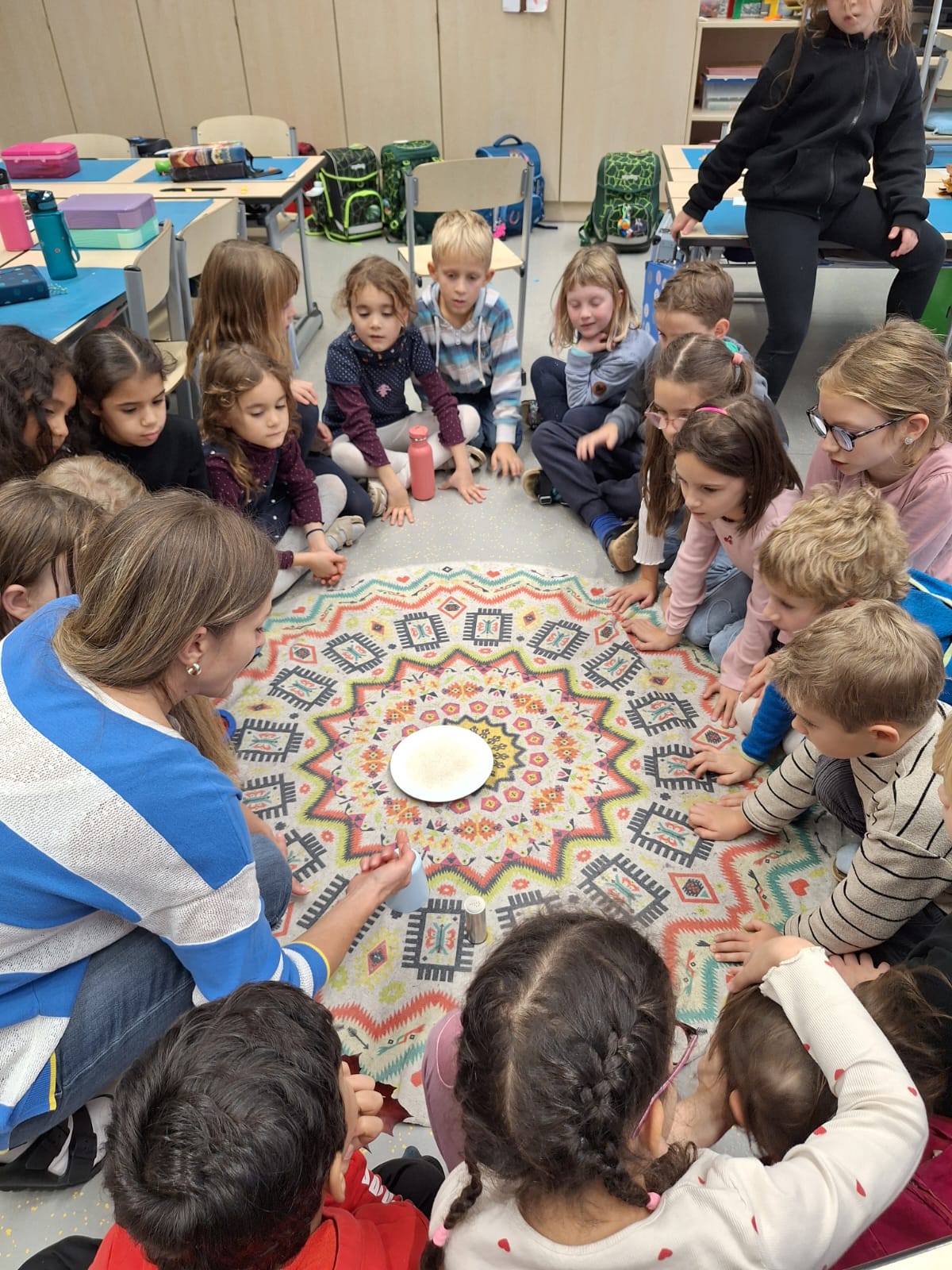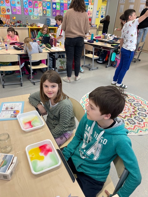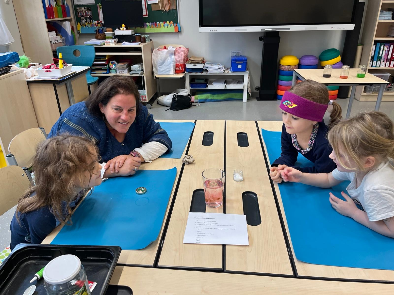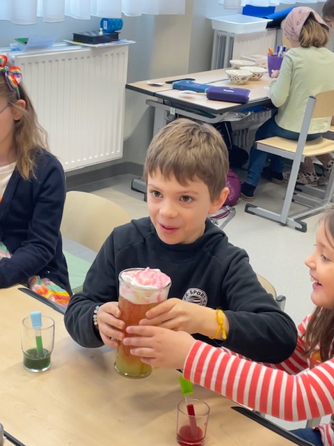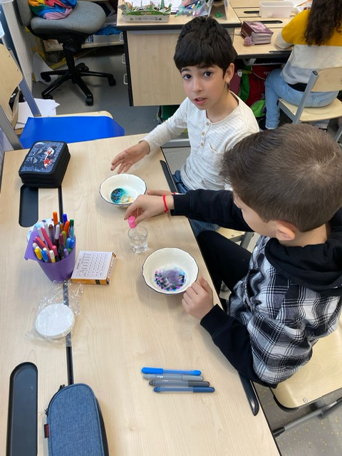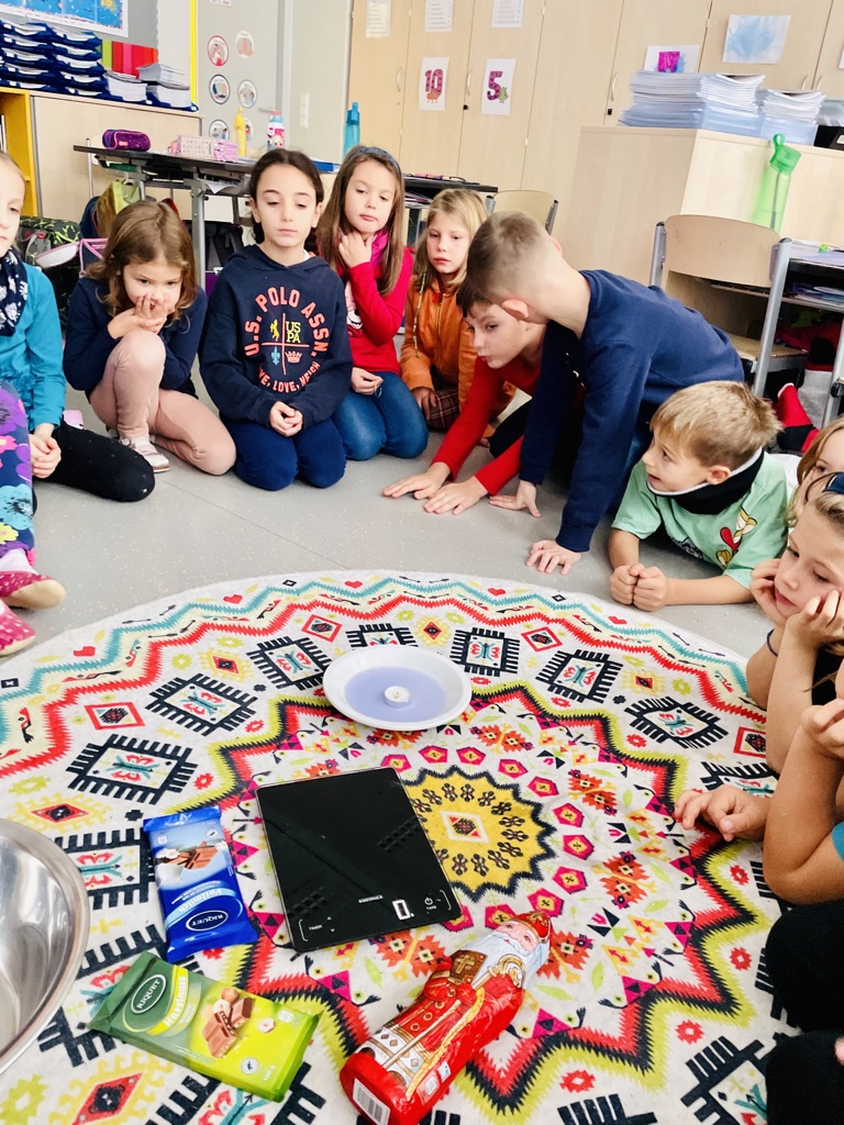 Unsere StudentInnen haben uns zum Thema: „Wir experimentieren mit Farben“ 4 Stationen vorbereitet. Die Klasse wurde in kleine Gruppen aufgeteilt, an jedem Tisch wurde ein Experiment durchgeführt. So hatten alle die Möglichkeit die Experimente selber auszuprobieren.