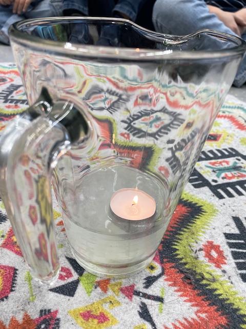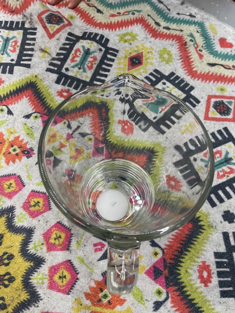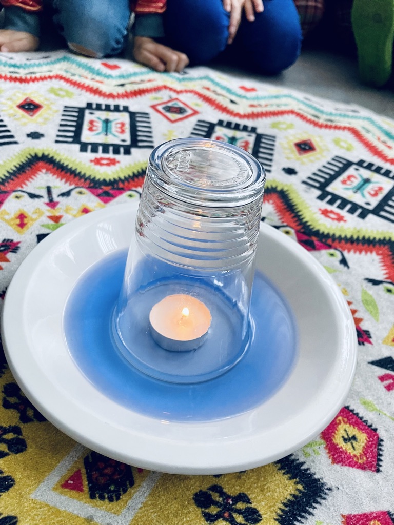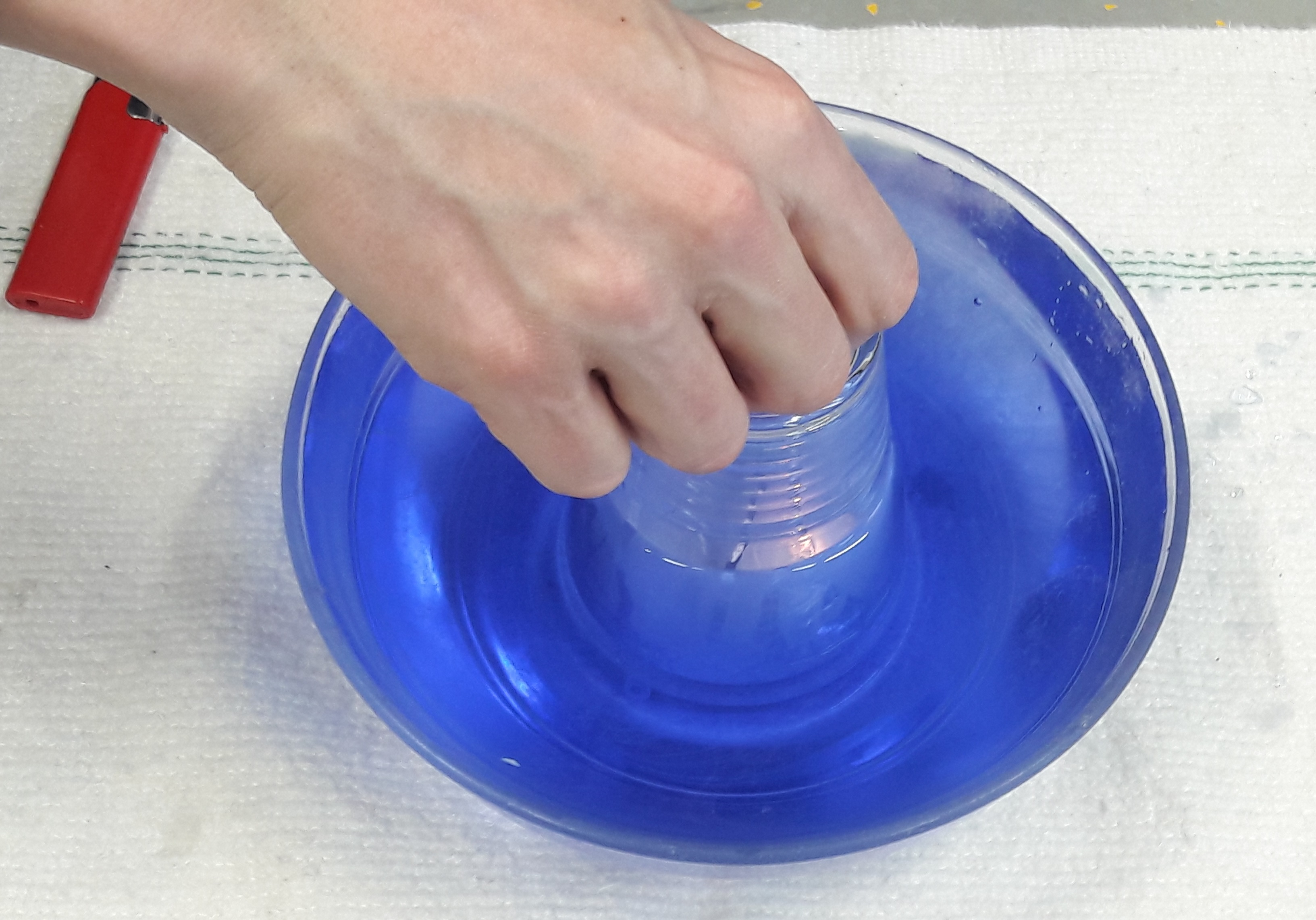 Im zweiten Schritt entzündeten wir ein Teelicht im kleinen Glas, lösten in einem größeren Glas erneut eine Brausetablette in Wasser auf und hielten dieses Glas über das kleinere. Auch diesmal erlosch die Flamme, obwohl das Wasser sie nicht berührte.