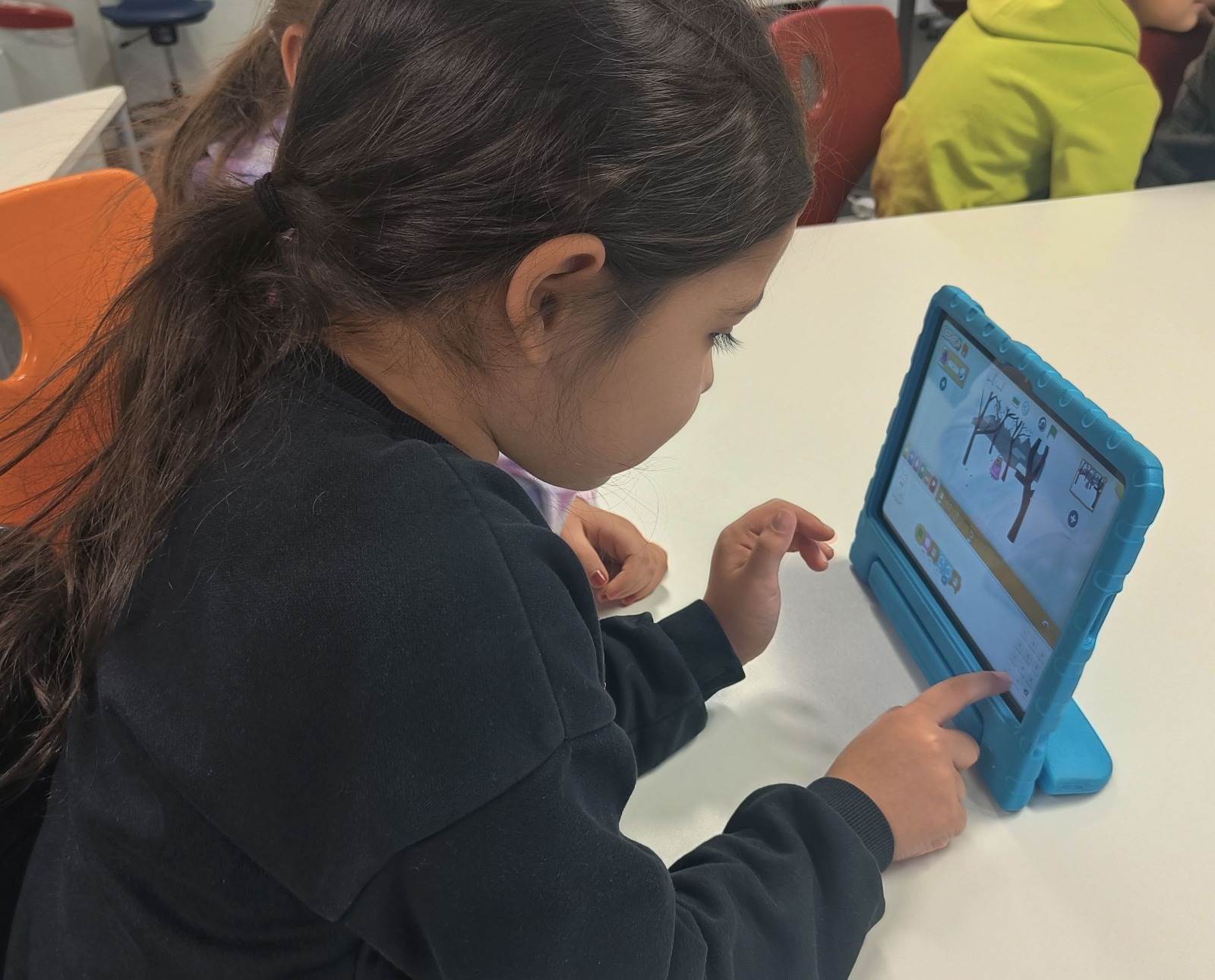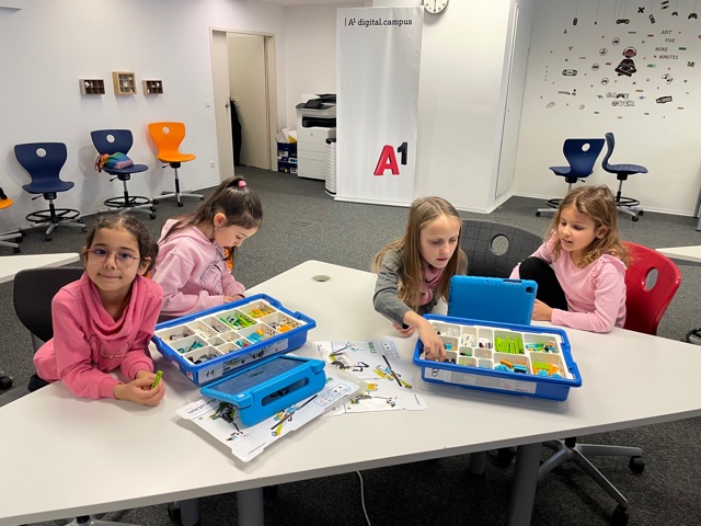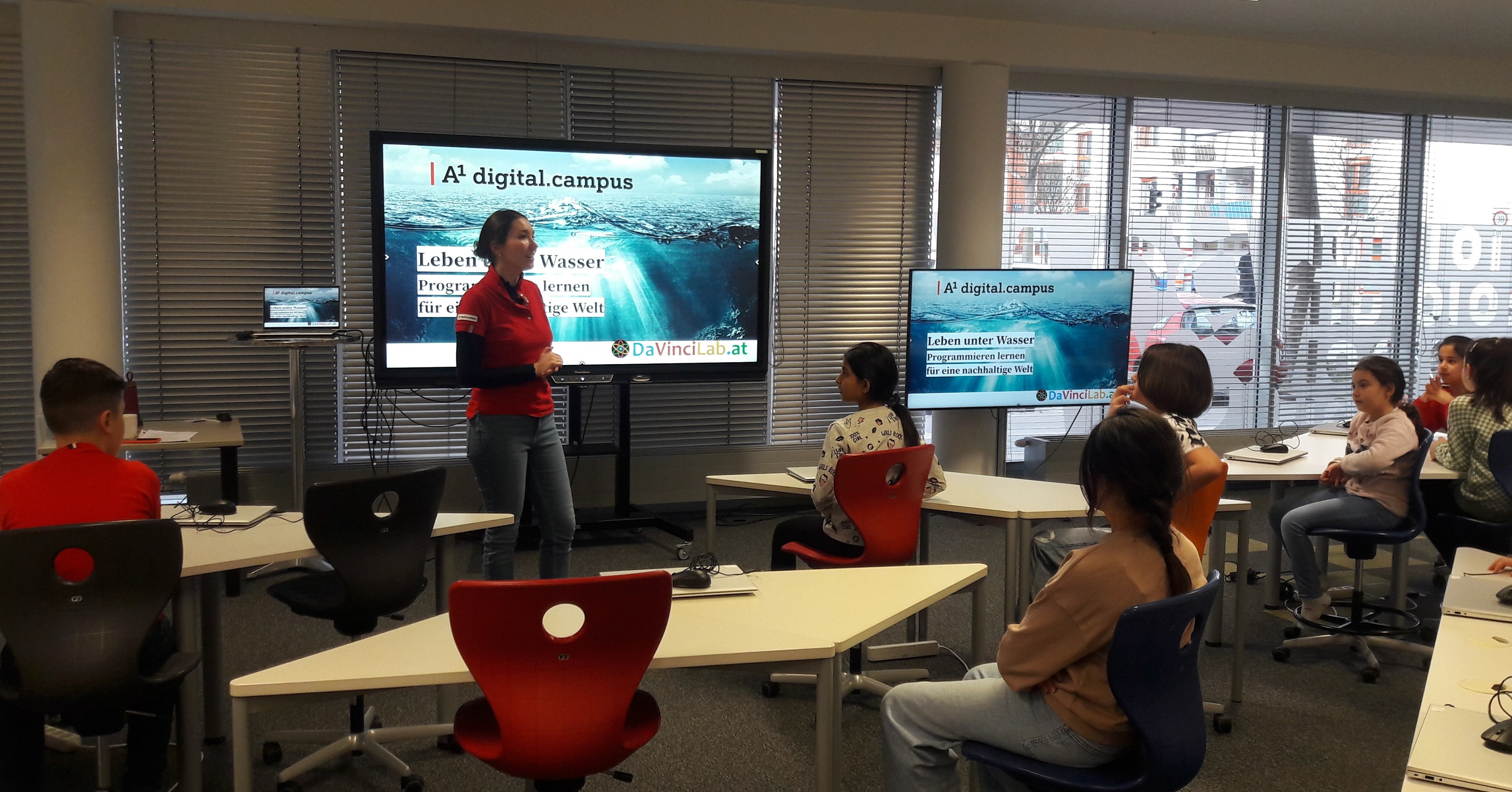In diesem Workshop am A1 Campus wurden kindliche Fantasie mit den Grundlagen des algorithmischen Denkens verbunden. Mit Programmierblöcken, die sich wie Puzzleteile verbinden lassen, werden Figuren zum Leben erweckt. Die Charaktere beginnen miteinander zu sprechen und sich auf der Bühne zu bewegen. Dadurch entstehen fantasievolle Geschichten zum Thema Umweltschutz.