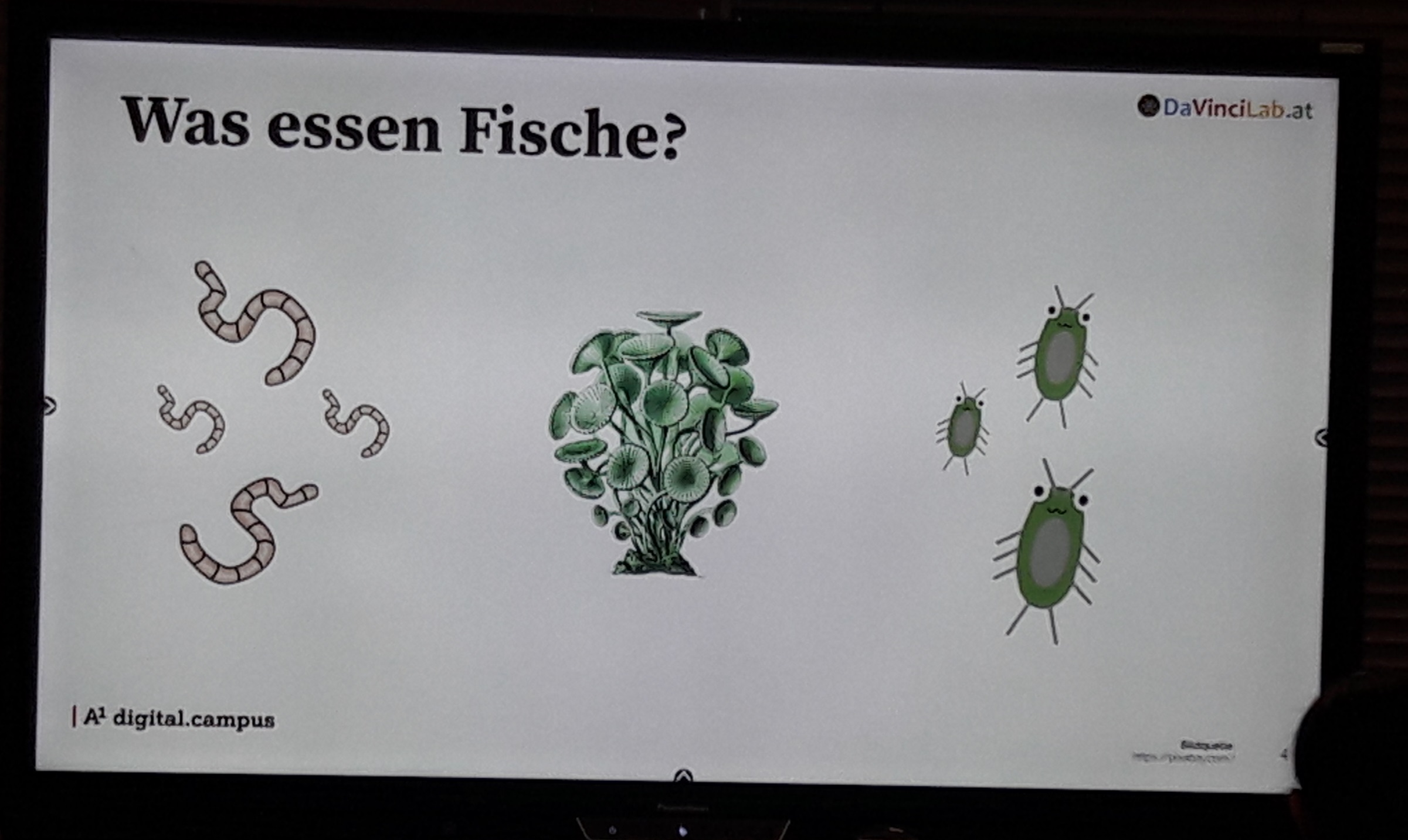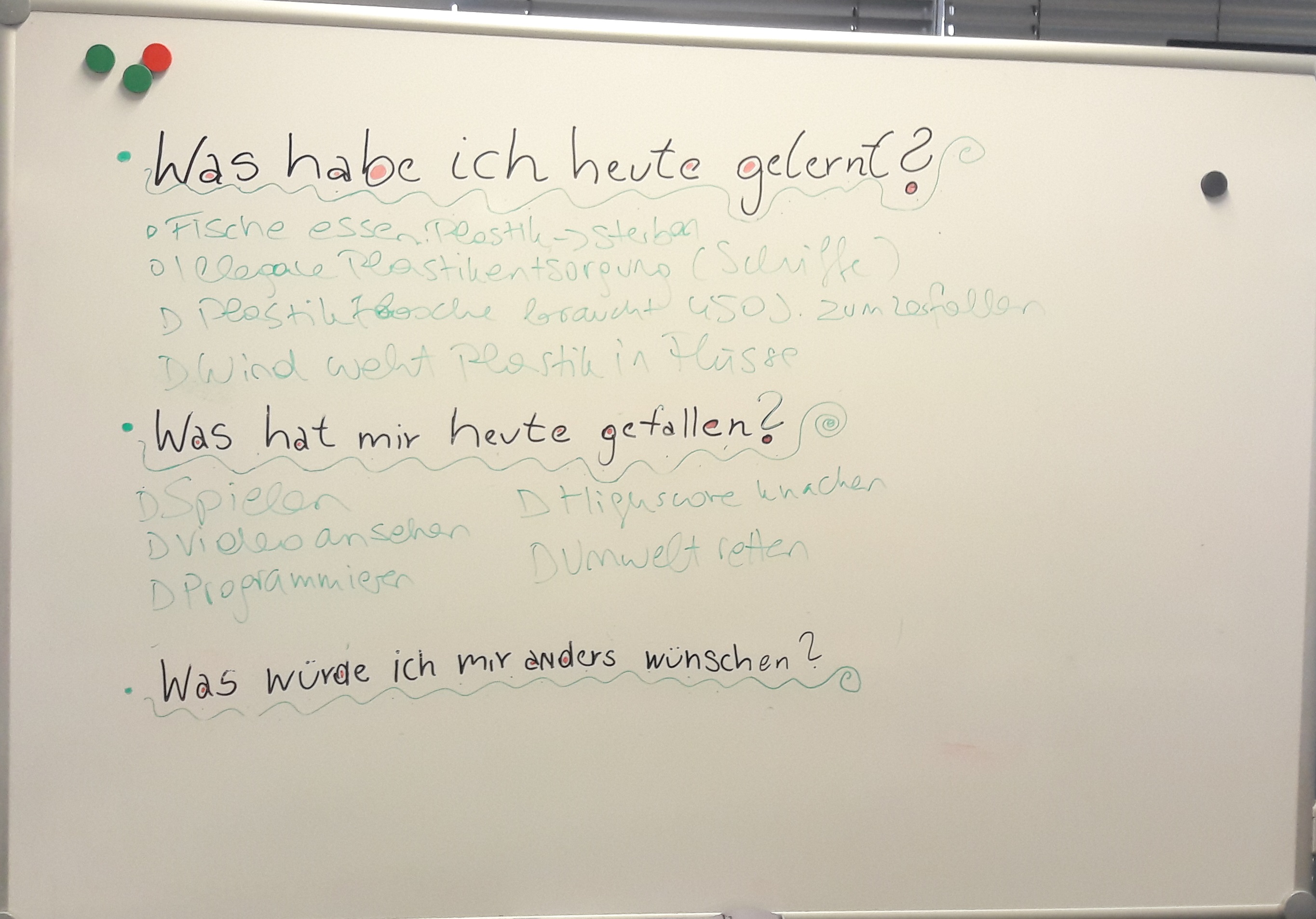 Im praktischen Teil des Workshops konnten dann alle unter Anleitung ein Computerspiel programmieren. Ziel: Ein Meeresbewohner oder Taucher soll Plastikflaschen und Plastiksackerln ausweichen und Plankton-Futter einsammeln.