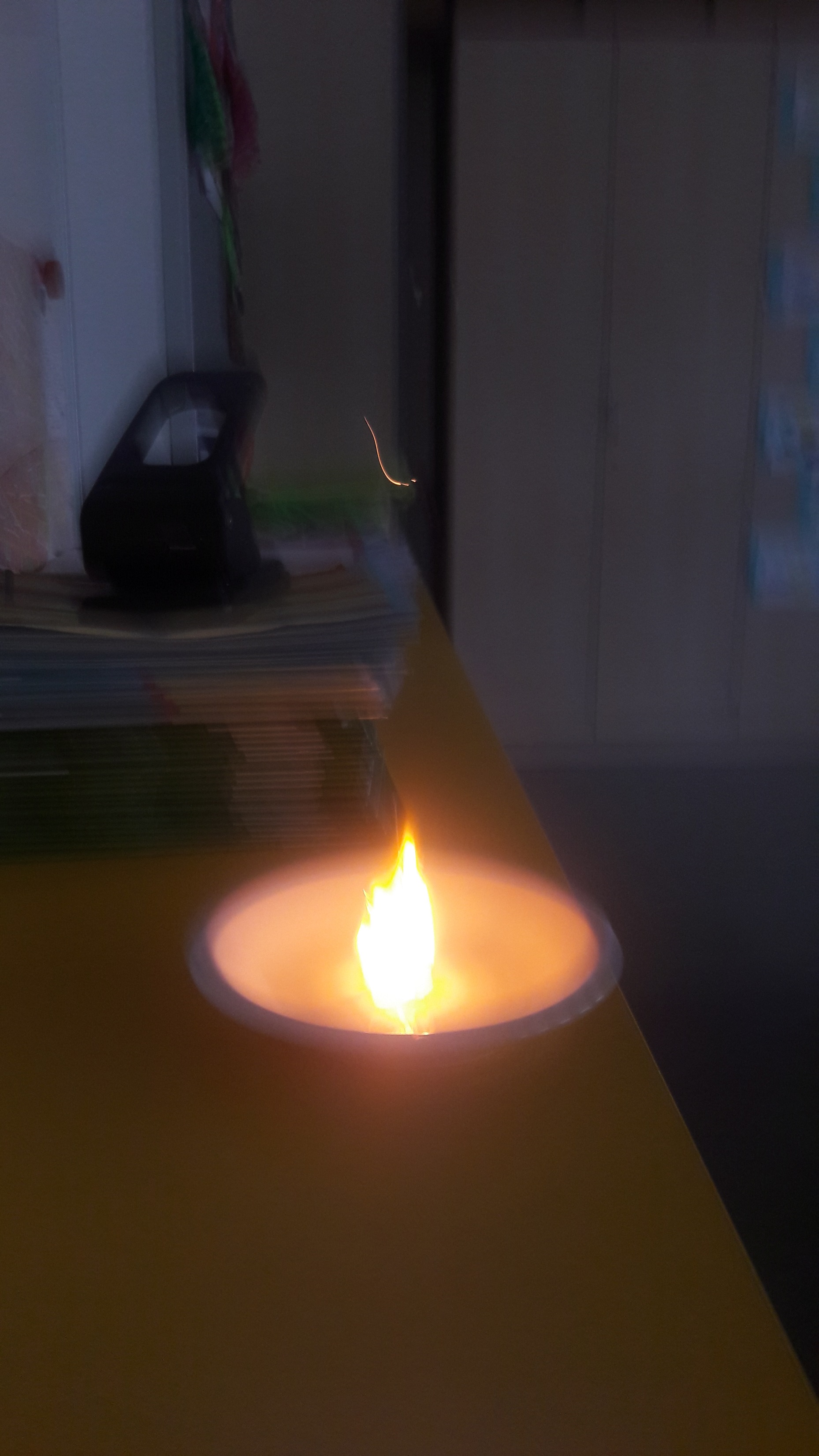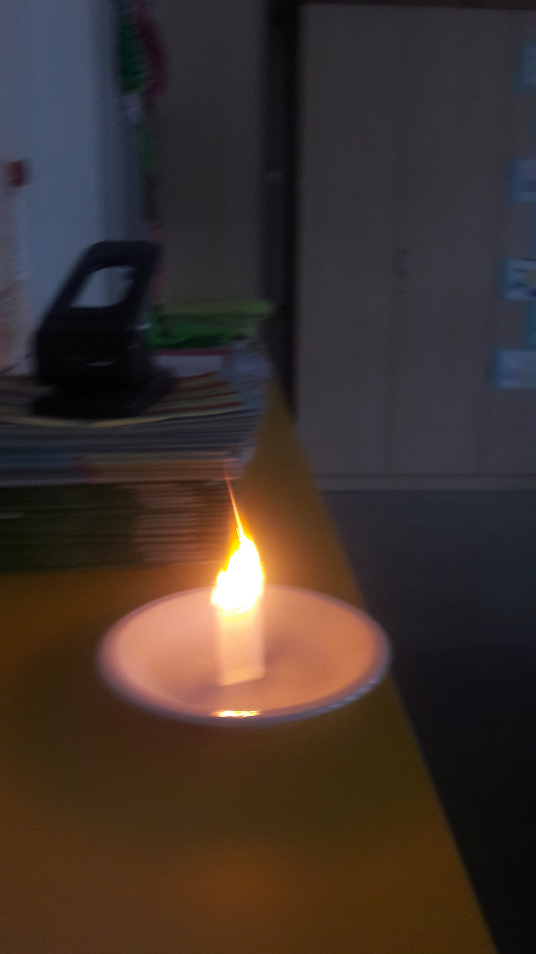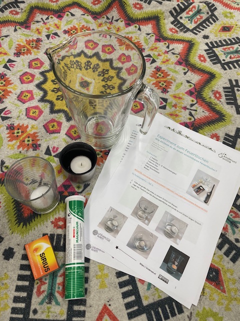 Für unser Experiment benötigten wir ein Teelicht, ein großes und ein kleines Glas, Brausetabletten, Wasser und Zündhölzer. Im ersten Schritt füllten wir ein Glas zu einem Drittel mit Wasser, legten ein Teelicht auf die Wasseroberfläche und zündeten es an. Als wir eine Brausetablette ins Wasser gaben, konnten wir beobachten, wie die Flamme nach kurzer Zeit erlosch.