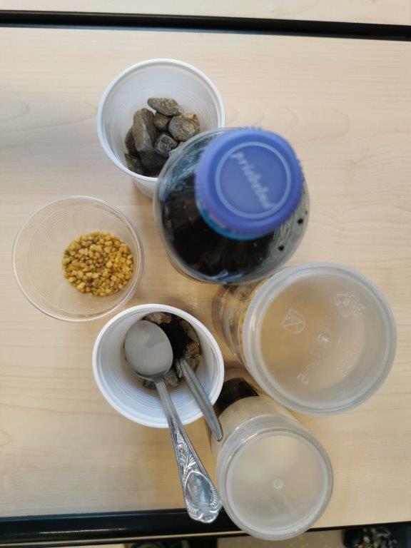 Ebenso klebten wir Minikristalle auf gesammelte Steine und ließen sie in verschiedenen Gläschen stehen. In manchen Gläsern war intensivere und in manchen Gläsern eine leichtere Alaunlösung gefüllt.