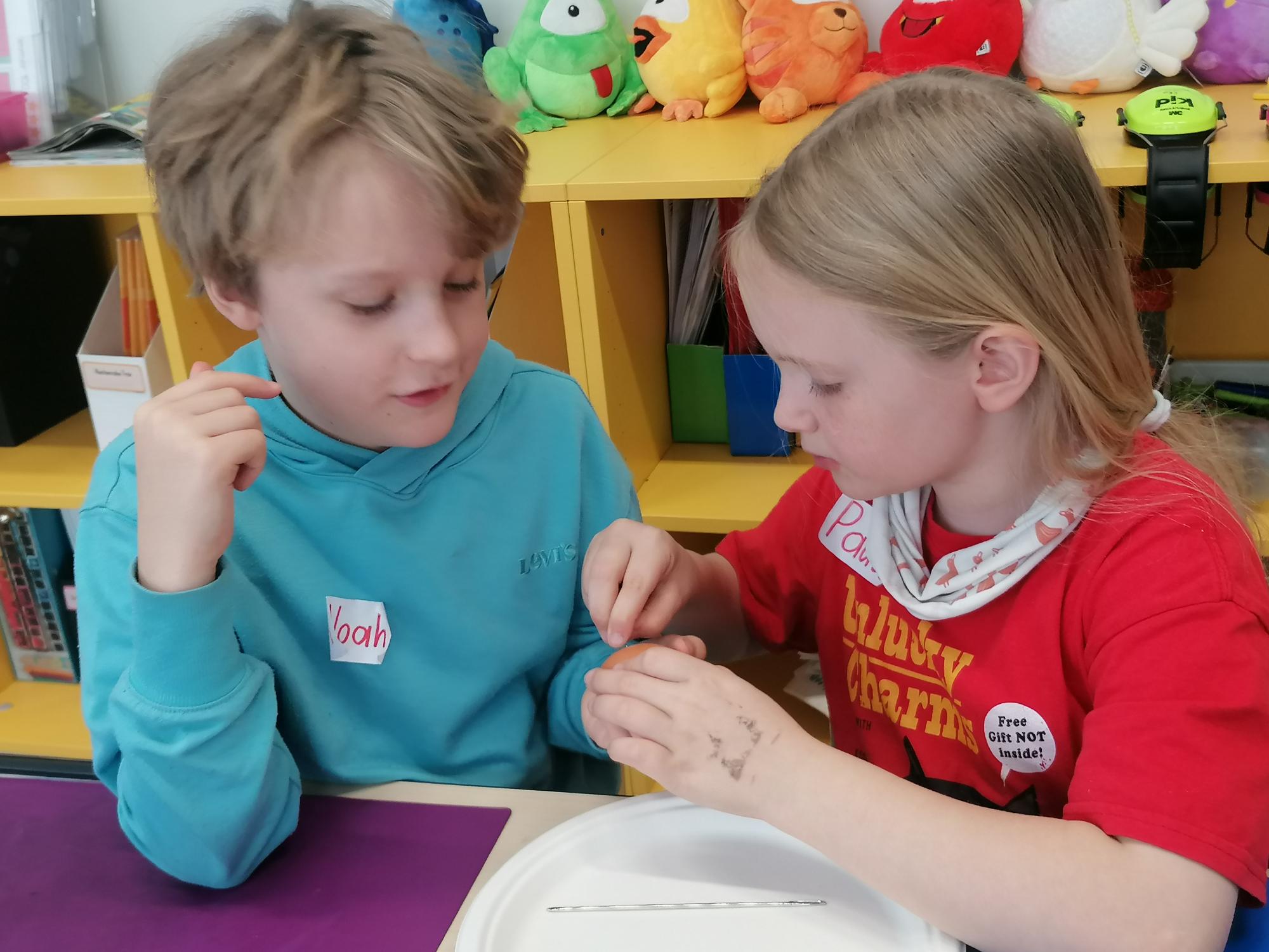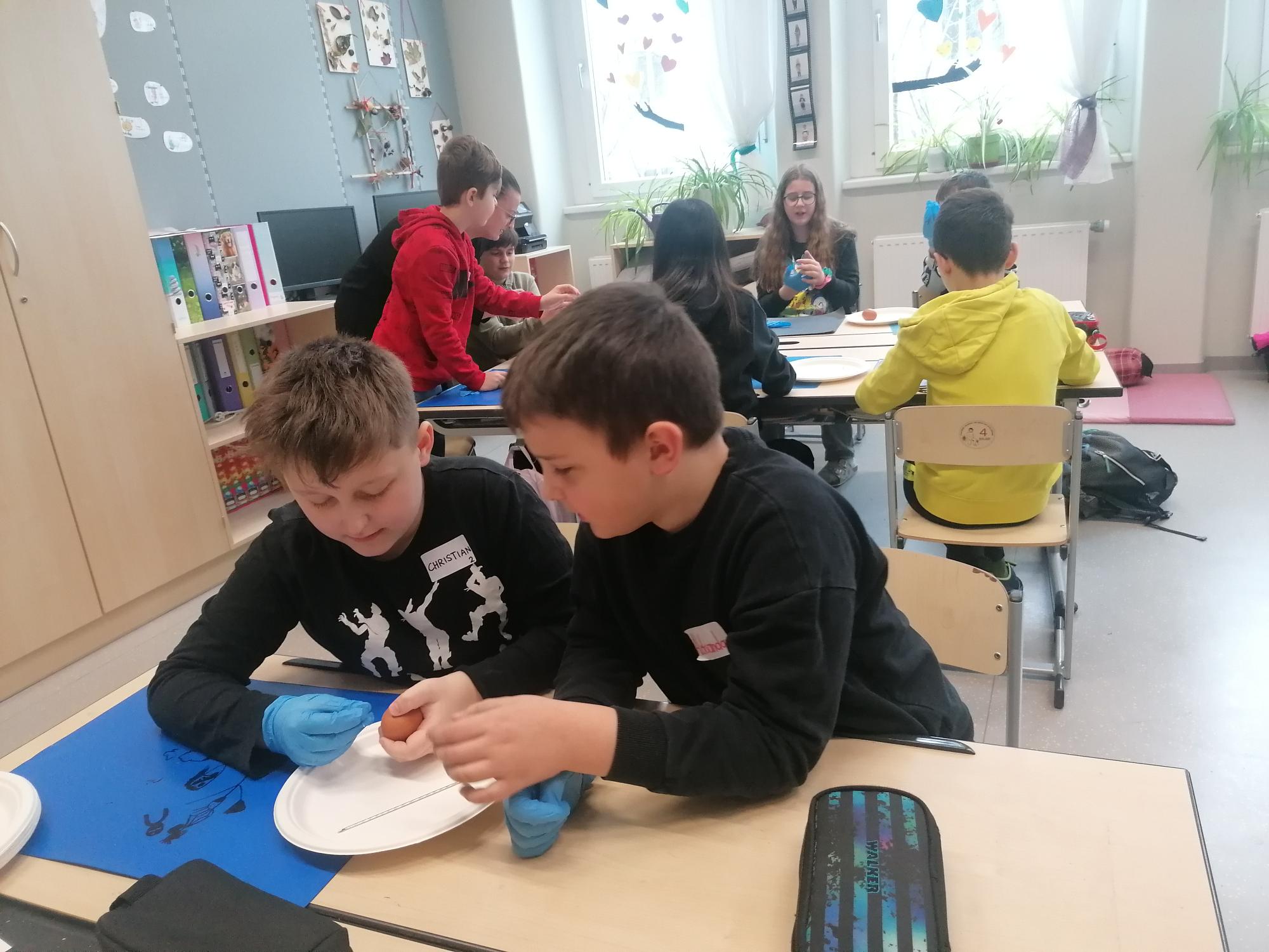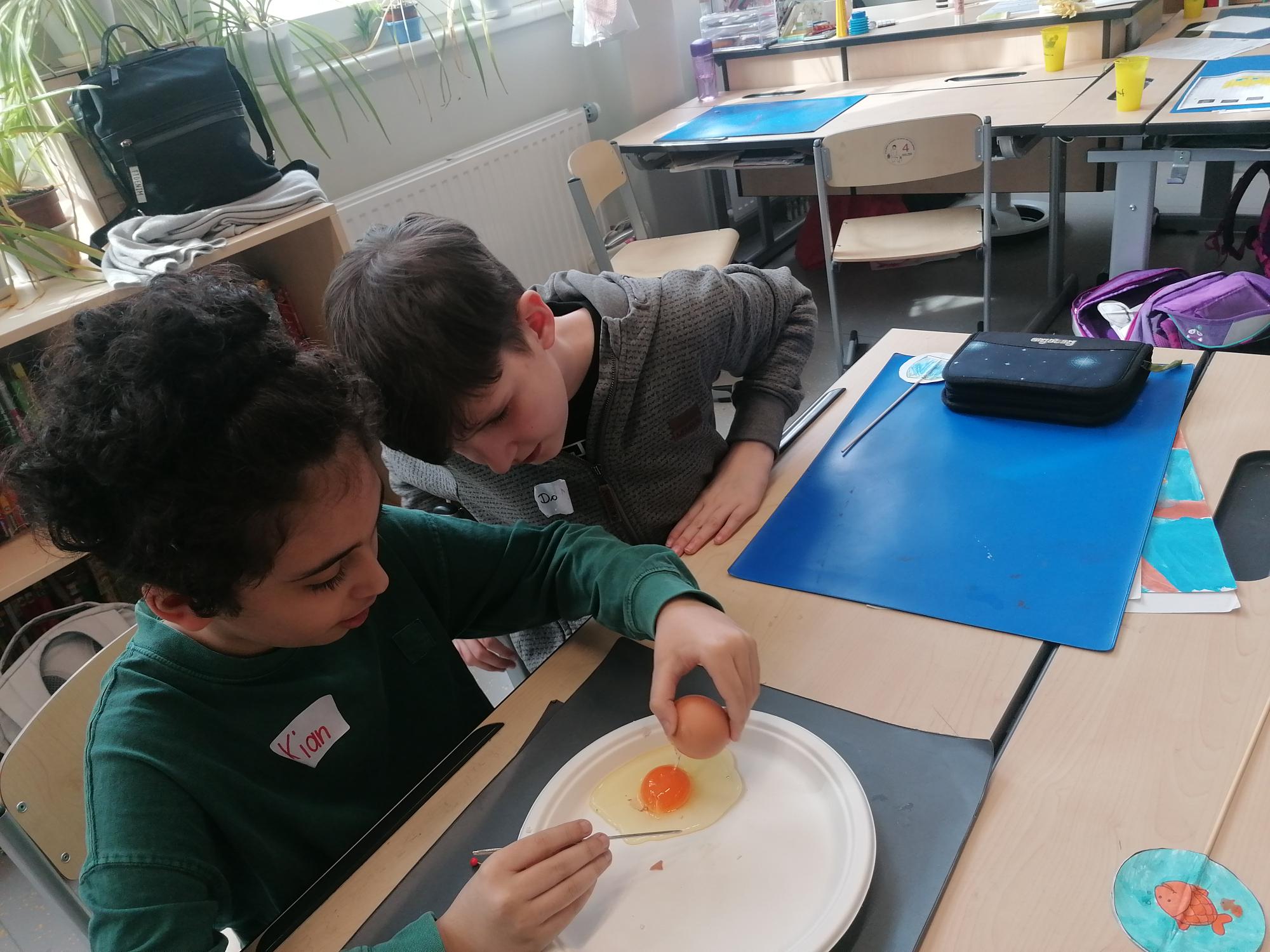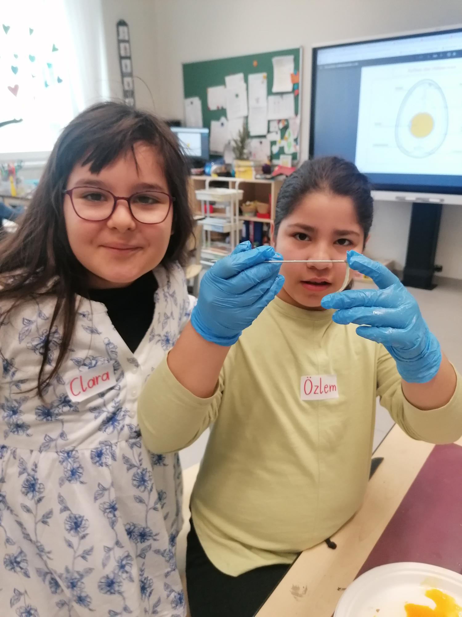 In der Woche vor Ostern haben die Kinder der 1c Eier untersucht. Anschließend wurde in einem Experiment die Wirkung von Essig auf die Kalkschale des Eis getestet.