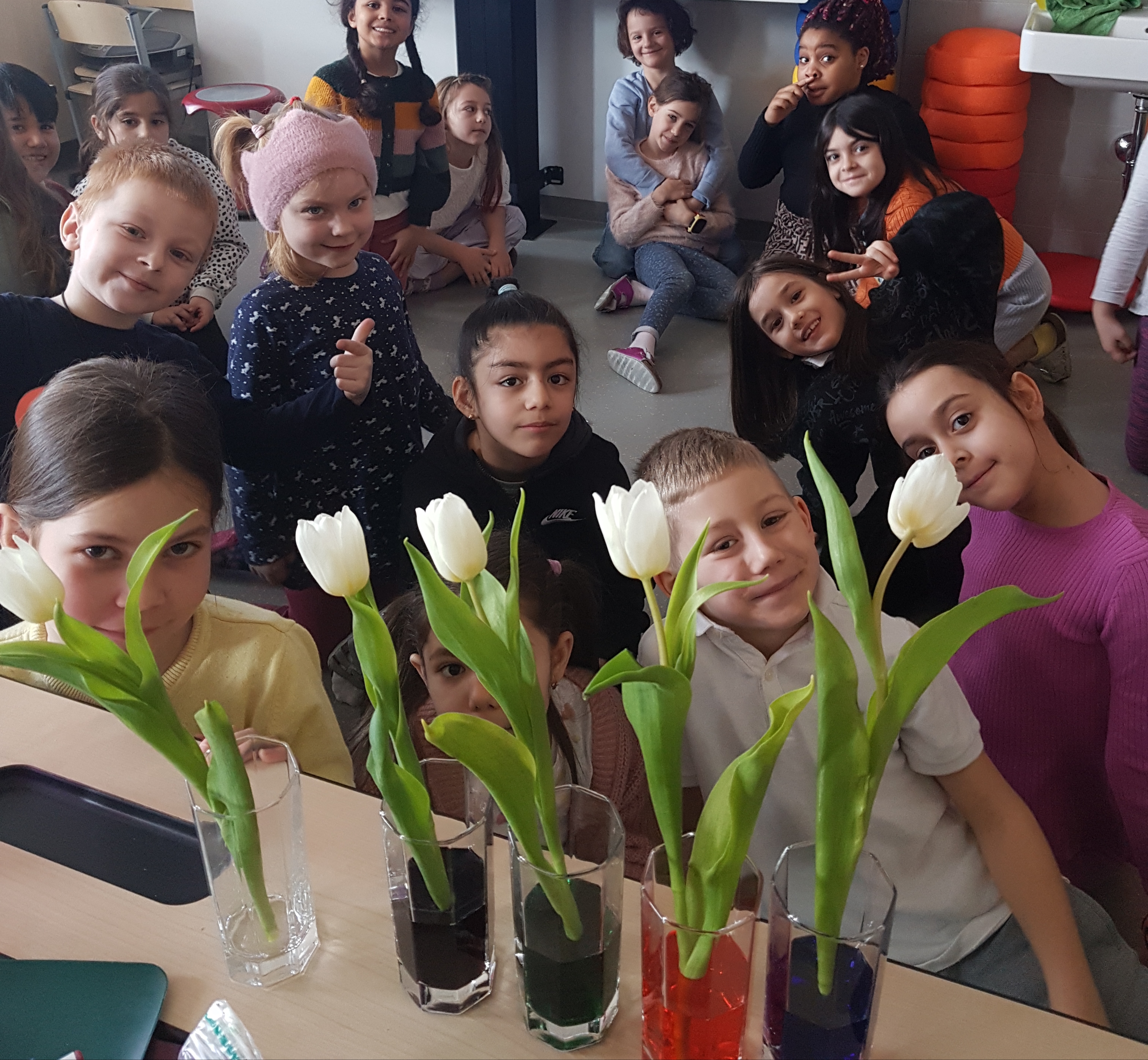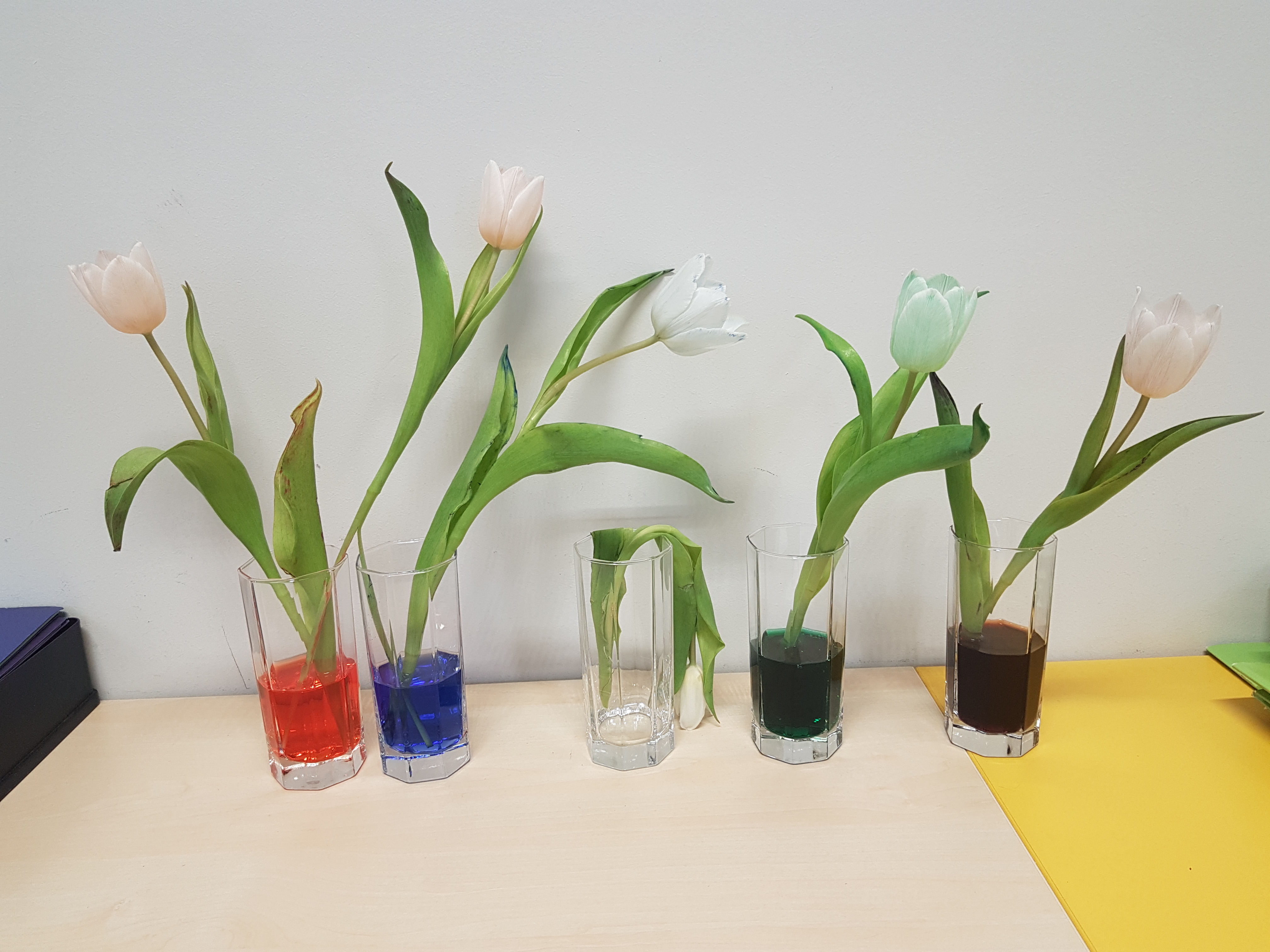 Kann eine Tulpe ohne Wasser leben? Was passiert, wenn ich das Wasser färbe? Was passiert, wenn ich den Stängel einer Tulpe spalte und die Tulpe dann in zwei Gläser mit verschiedenen Farben stelle? All jene Fragen beschäftigten gestern die Kinder der 1D. Nachdem wir eine Nacht warten mussten, wurde das Ergebnis heute bestaunt und die durstige Tulpe gerettet.